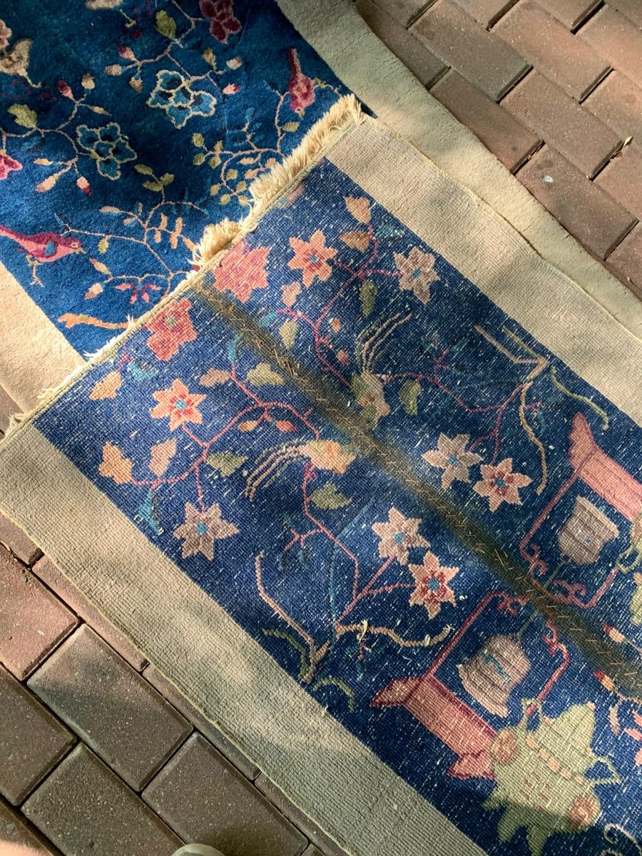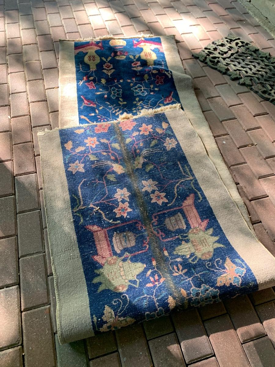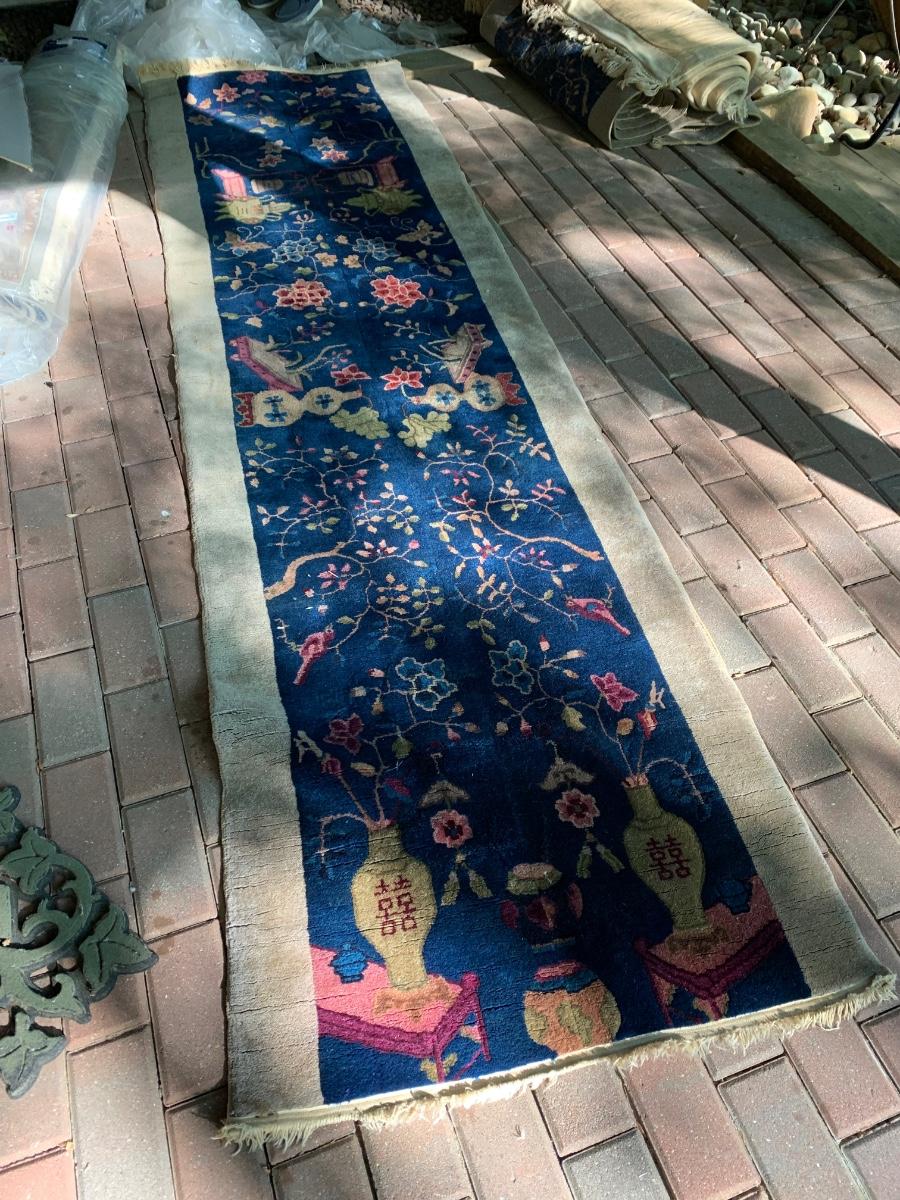 Appears a large rug was loved so much but unable to fit at new home that they cut and resewn the sides to create a runner. This rug was rolled up in the basement many years so was taken to the back patio for more light to photograph. Sorry about the shade / sun but the yard has many trees. These rugs are nice quality but we would recommend a professional cleaning since they have been stored in a rolled state downstairs for years. Just one of MANY Oriental Rugs we have in this wonderful estate. See ALL photos for measurements, patterns and condition. All are being offered with NO RESERVE, NO BUYERS PREMIUMS, NO CREDIT CARD FEES. Buying as is, as found in the estate - see all photos.
