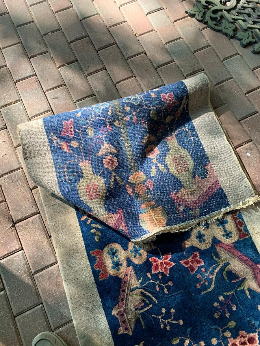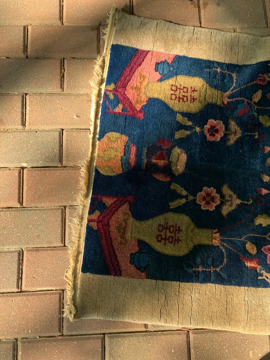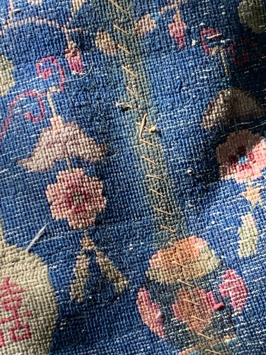 Appears a large rug was loved so much but unable to fit at new home that they cut and resewn the sides to create a runner. This rug was rolled up in the basement many years so was taken to the back patio for more light to photograph. Sorry about the shade / sun but the yard has many trees. These rugs are nice quality but we would recommend a professional cleaning since they have been stored in a rolled state downstairs for years. Just one of MANY Oriental Rugs we have in this wonderful estate. See ALL photos for measurements, patterns and condition. All are being offered with NO RESERVE, NO BUYERS PREMIUMS, NO CREDIT CARD FEES. Buying as is, as found in the estate - see all photos.
