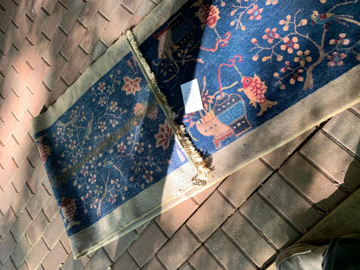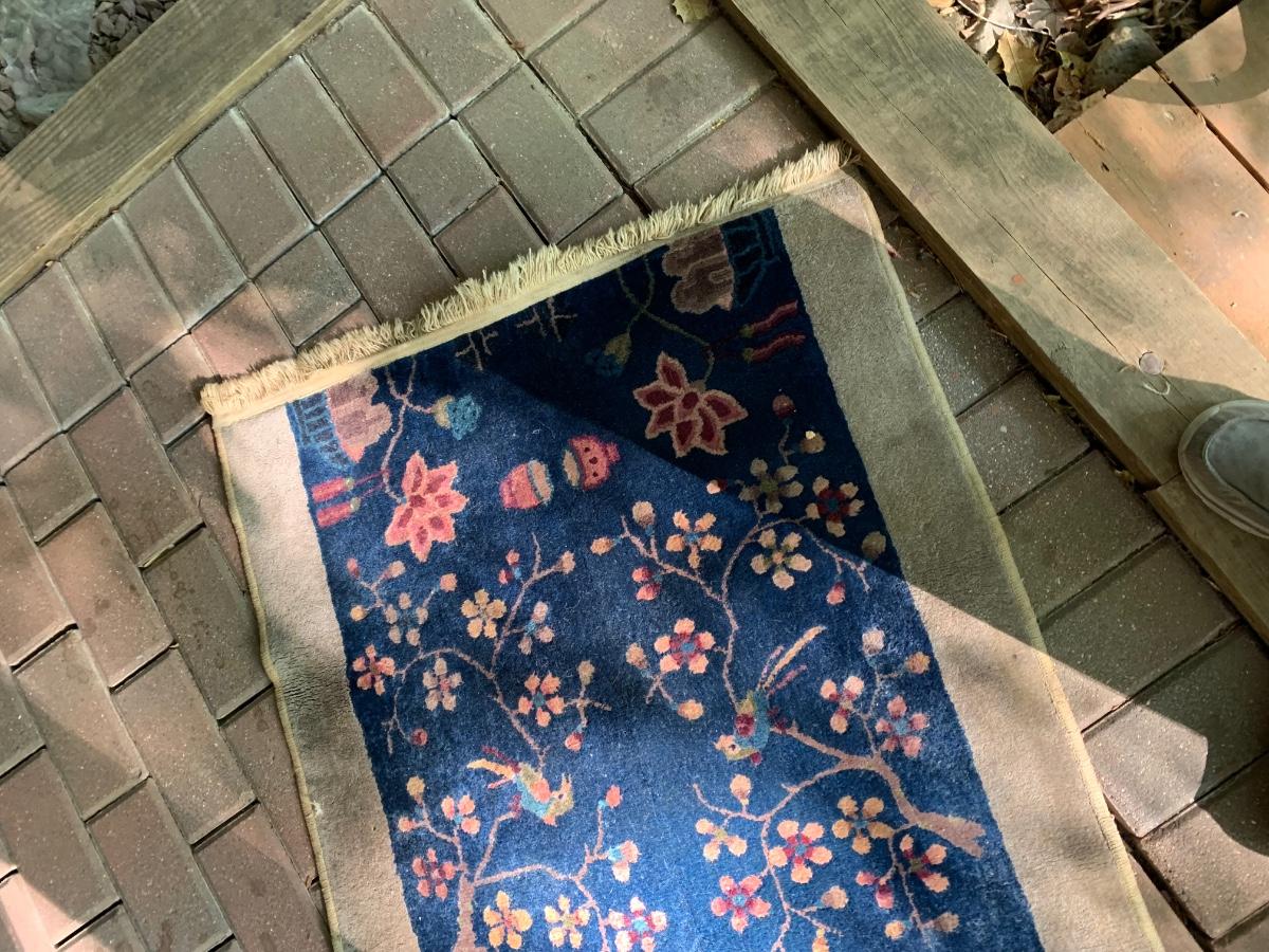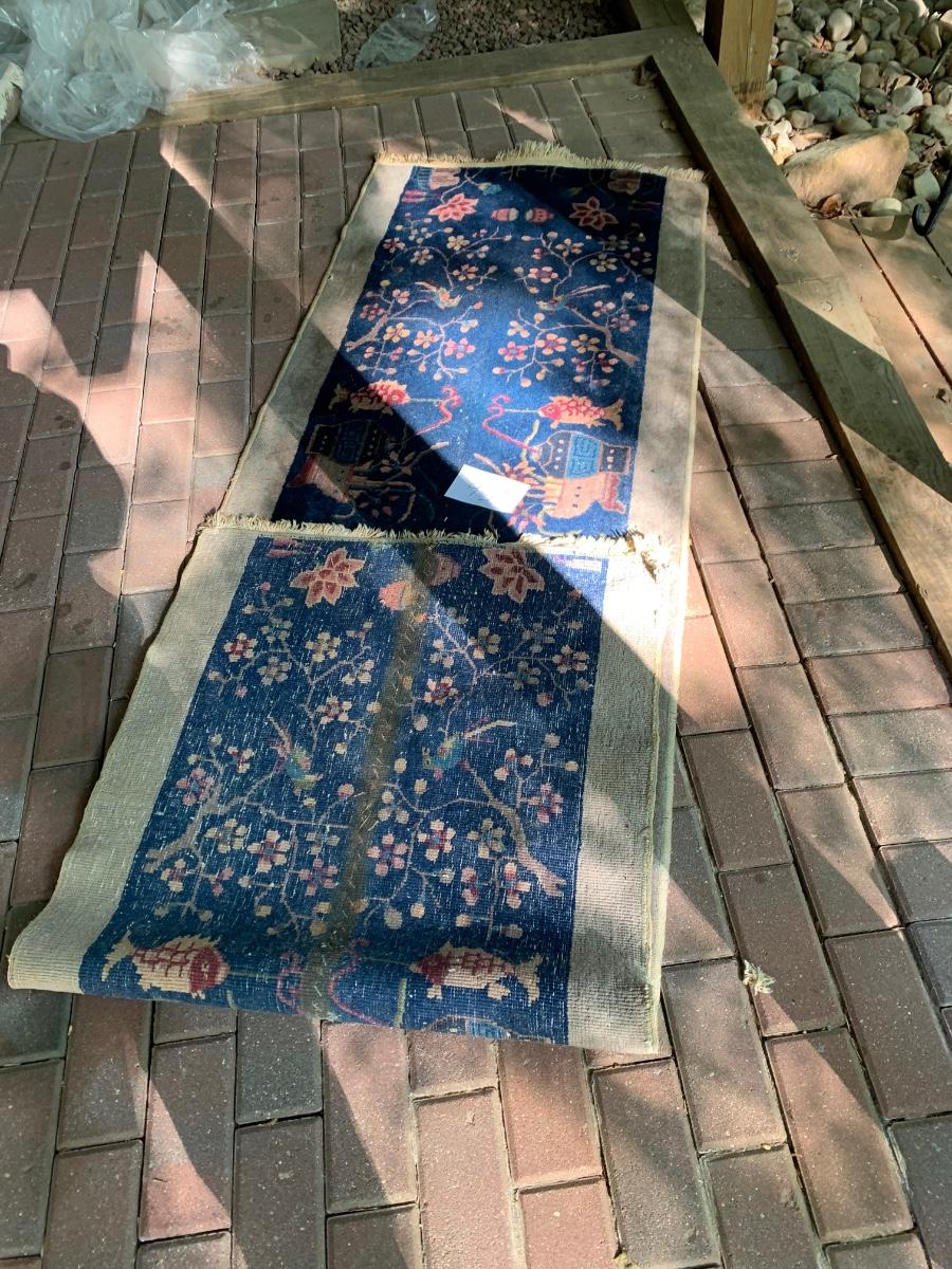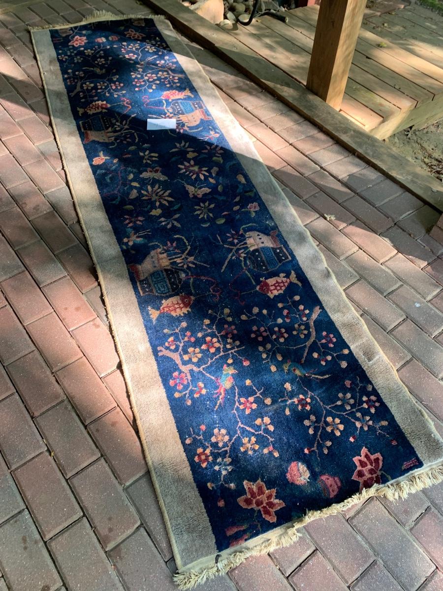 Appears a large rug was loved so much but unable to fit at new home that they cut and resewn the sides to create a runner. Just one of MANY Oriental Rugs we have in this wonderful estate. This rug was rolled up in the basement many years so was taken to the back patio for more light to photograph. Sorry about the shade / sun but the yard has many trees. These rugs are nice quality but we would recommend a professional cleaning since they have been stored in a rolled state downstairs for years. See ALL photos for measurements, patterns and condition. All are being offered with NO RESERVE, NO BUYERS PREMIUMS, NO CREDIT CARD FEES. Buying as is, as found in the estate - see all photos.