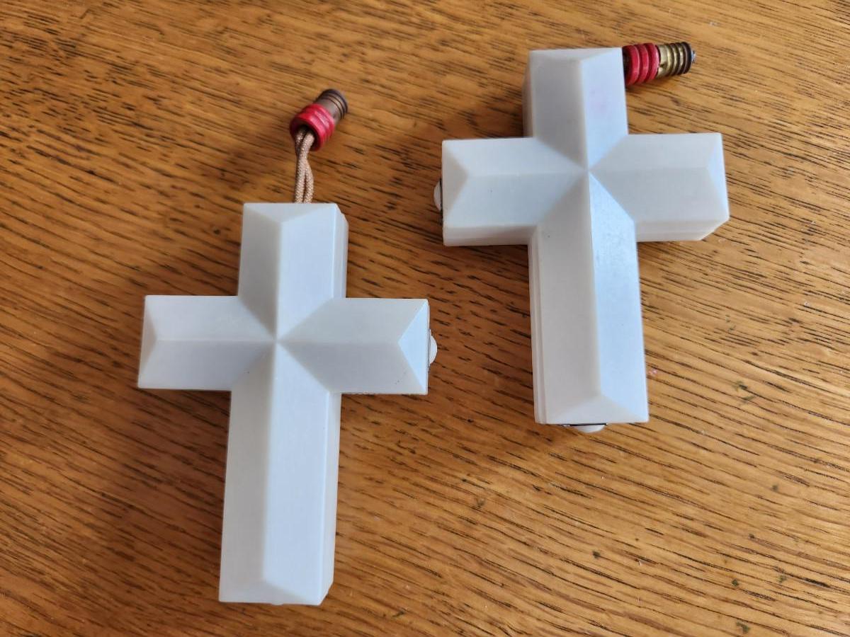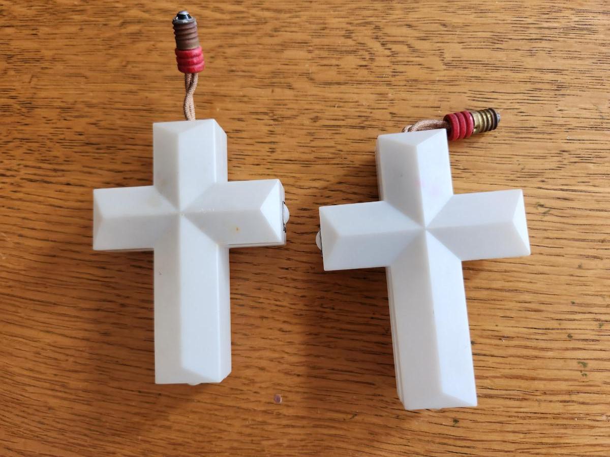 This auction lot is for a pair of Early Christmas Bulb Cross Ornaments. These crosses are made of heavy plastic and have the screw in wiring to attach them to a string of Christmas lights. They measure about 3X4-inches. They have not been opened to determine if a bulb is present within or if they work. Quite an unusual holiday decor find.