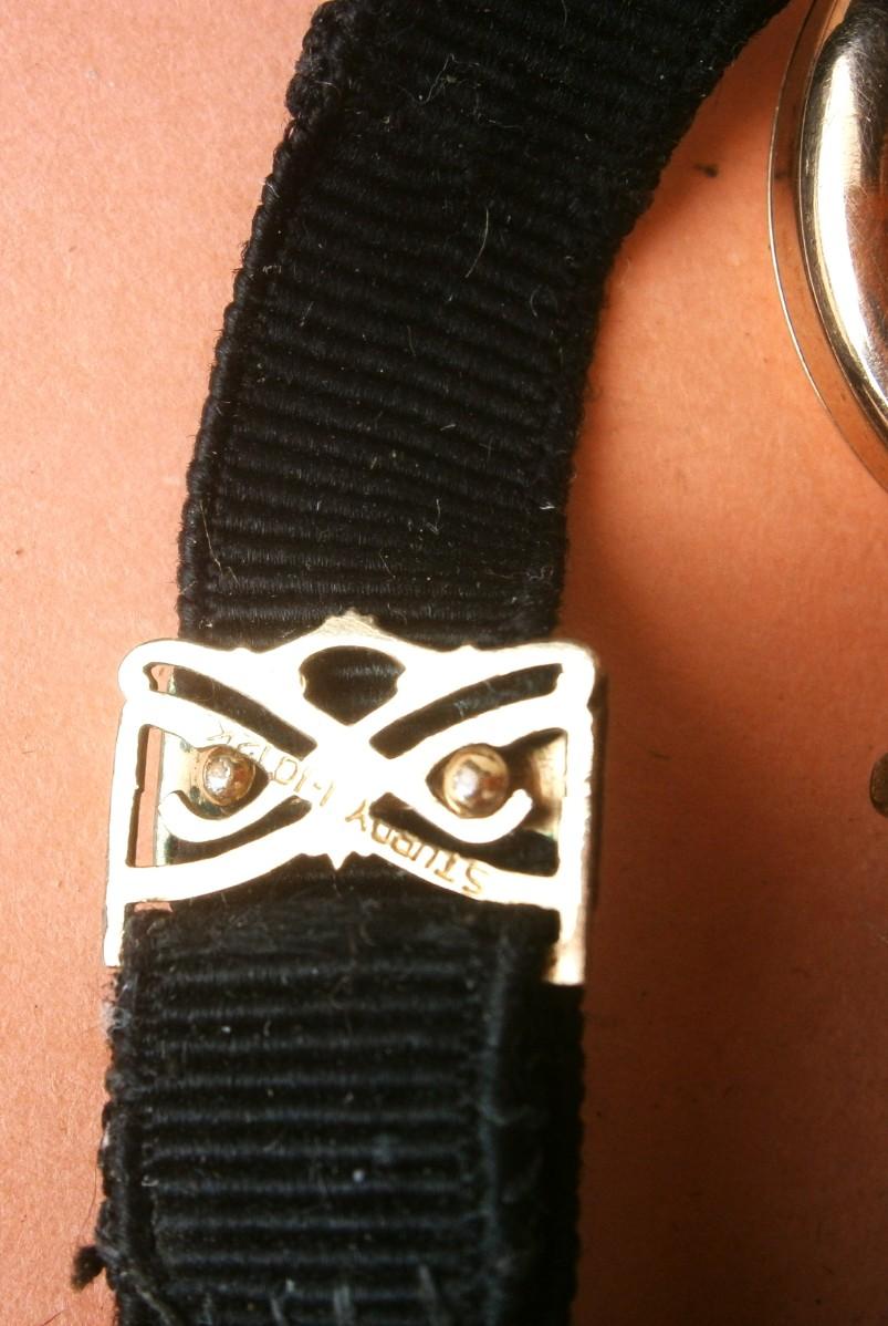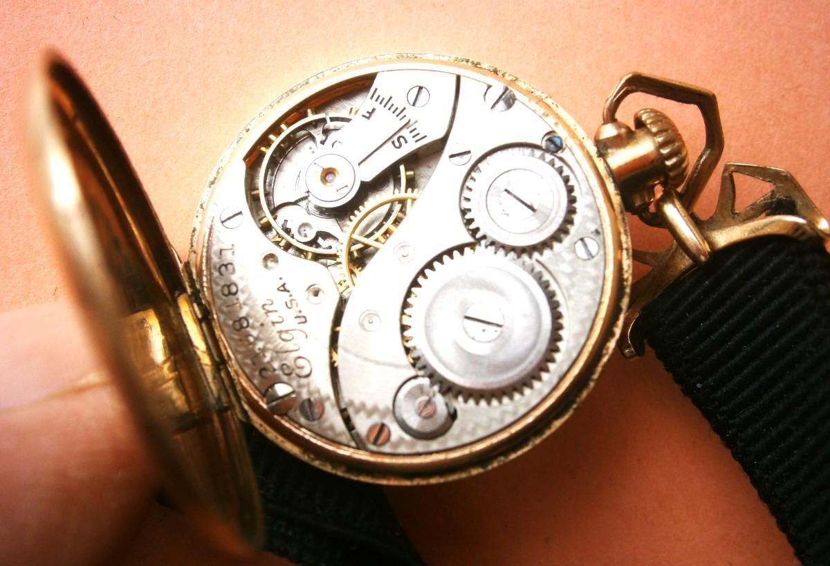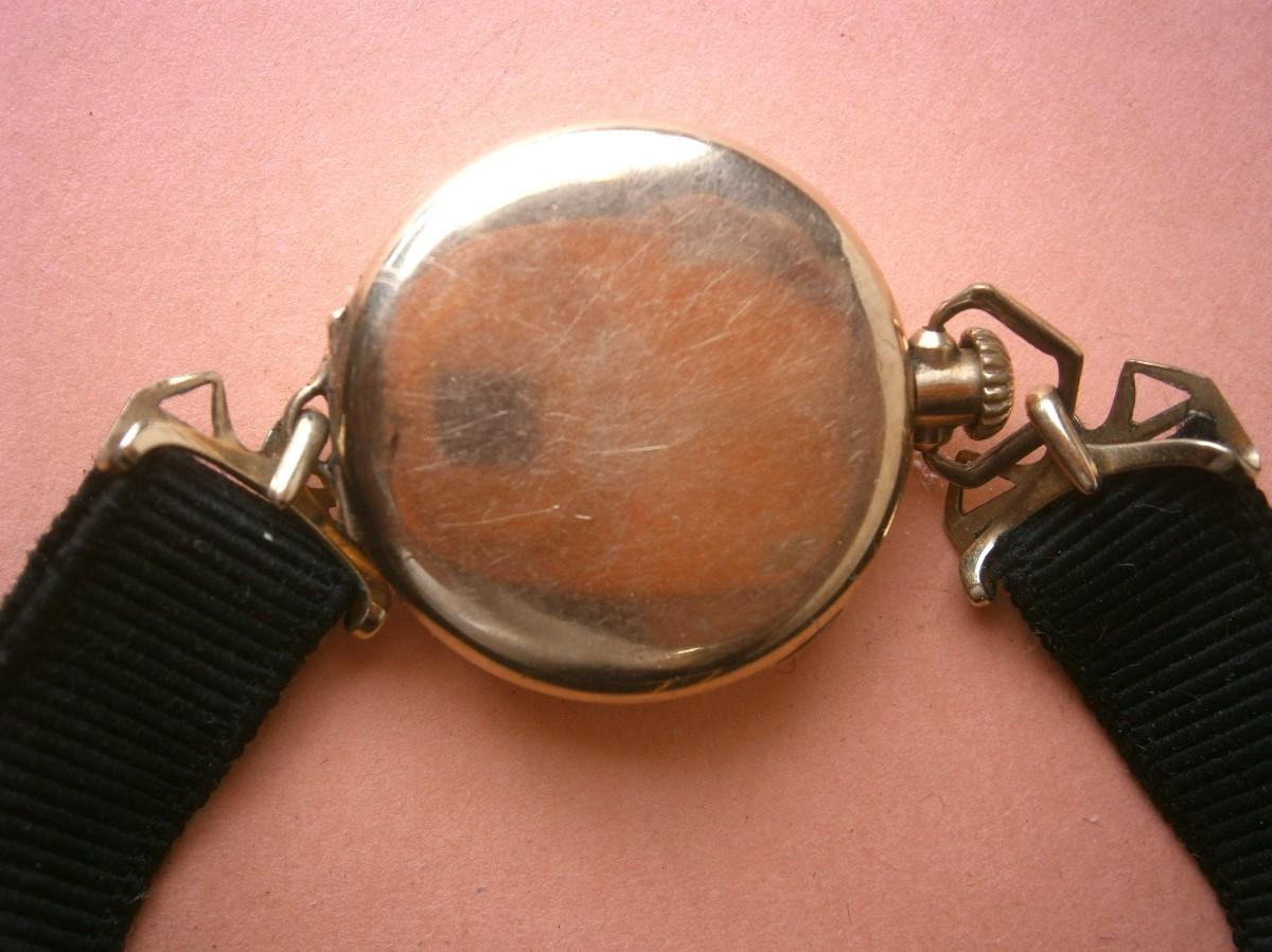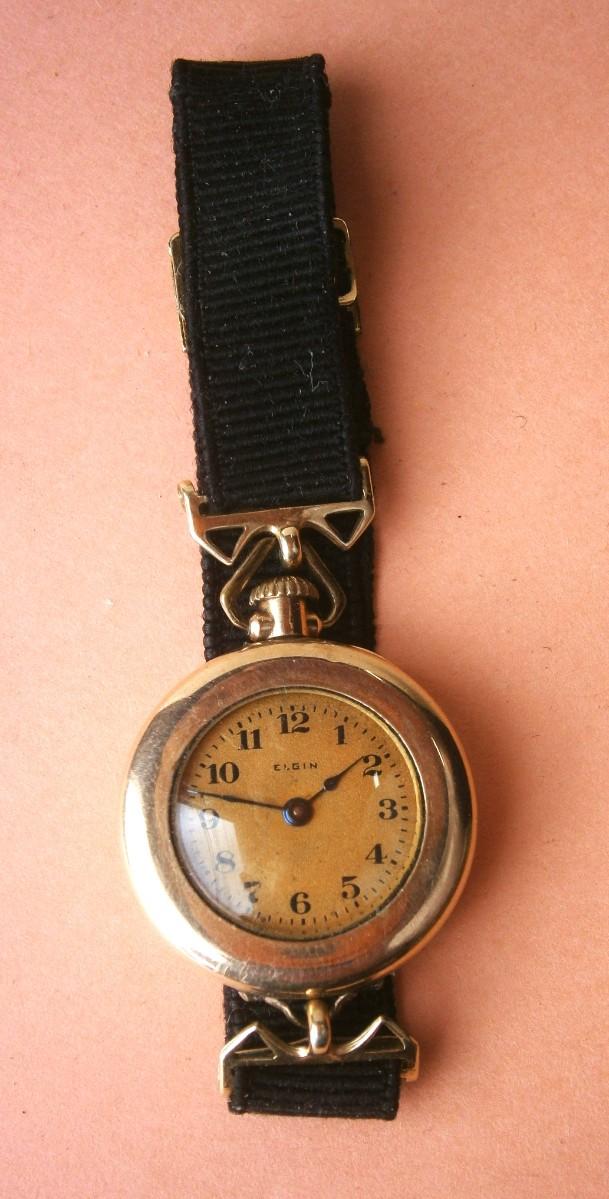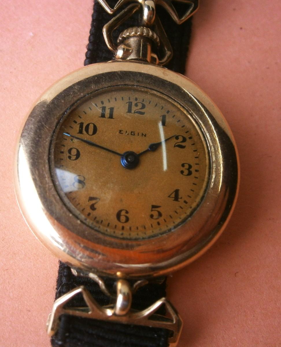 Early ELGIN Ladies GF Wristwatch with cloth and 19K GF Band, serial # 21681831 (c.1919), 7 jewel, this is a transition pocket watch type wristwatch with a stem wind. NOT working. Clean movement. Worthwhile repairing.