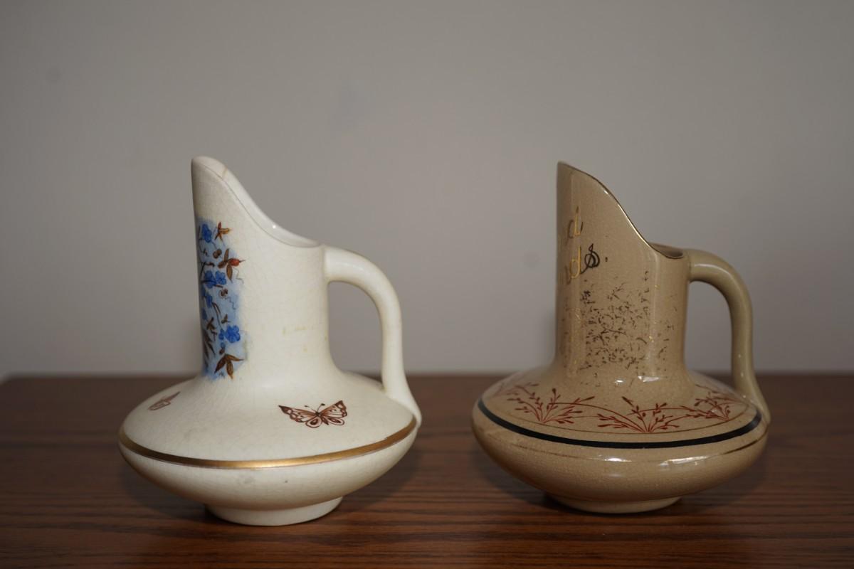EARLY HAMPSHIRE HANDLED PITCHERS. BIRDS AND BUTTERFLIES