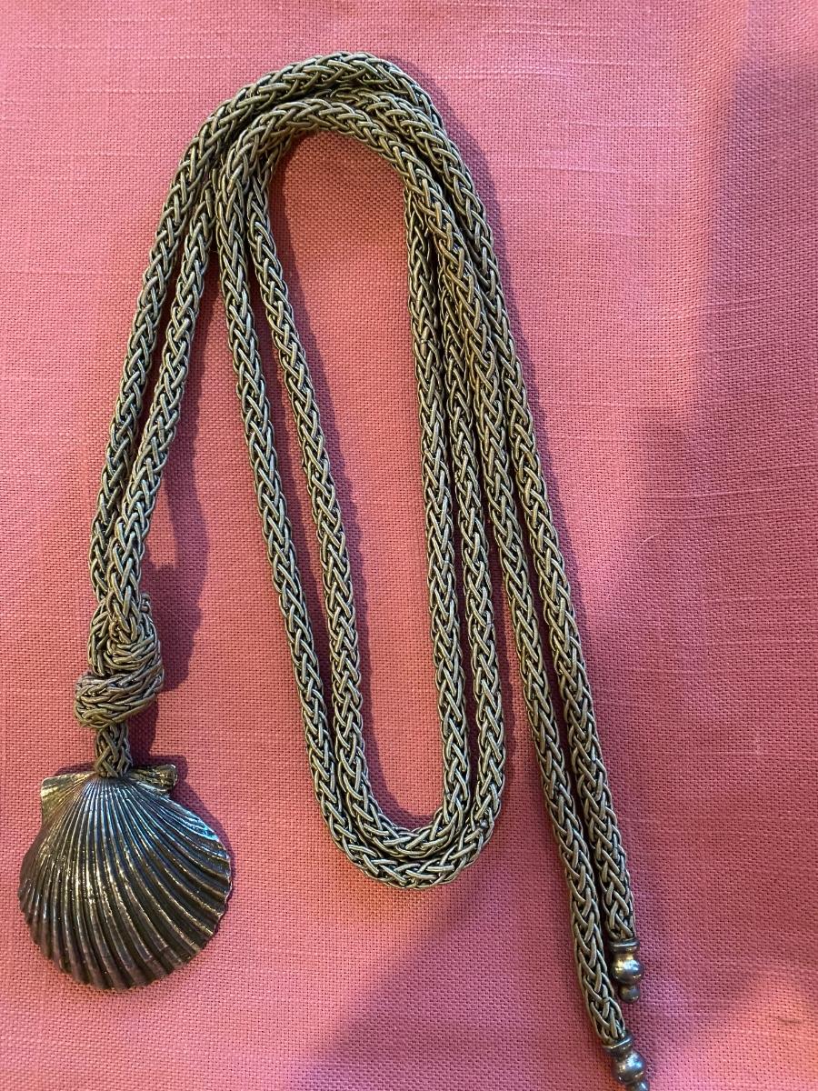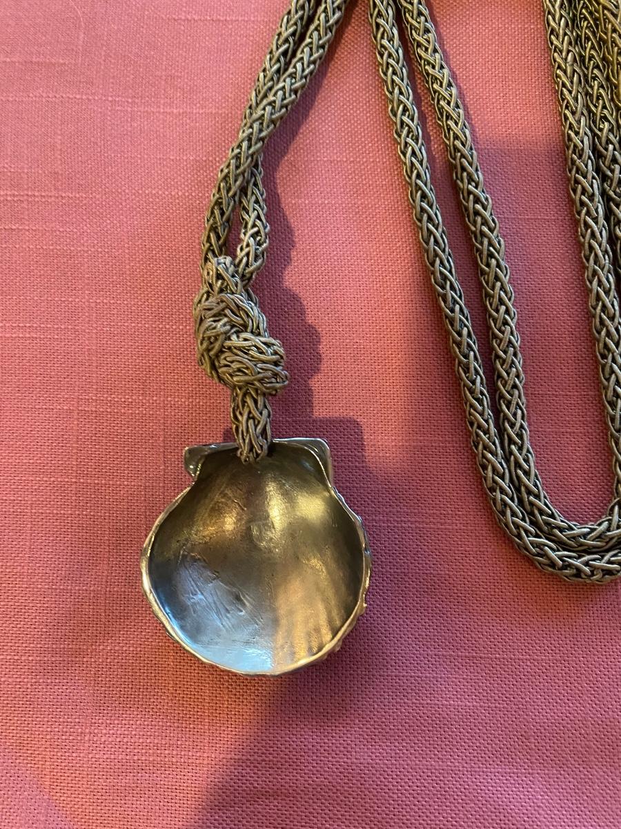 Early Mignon Faget unsigned sterling clamshell belt buckle on cord. Purchased at MF shop in the early 80s. 2-1/4”W x 2-1/2”L