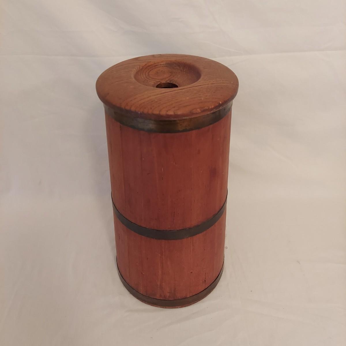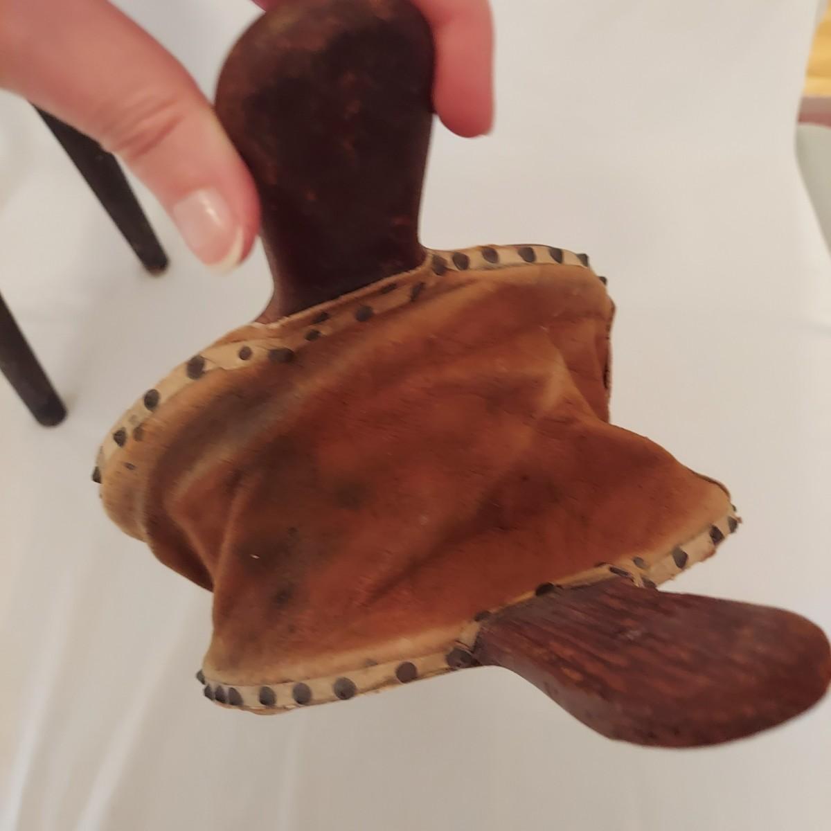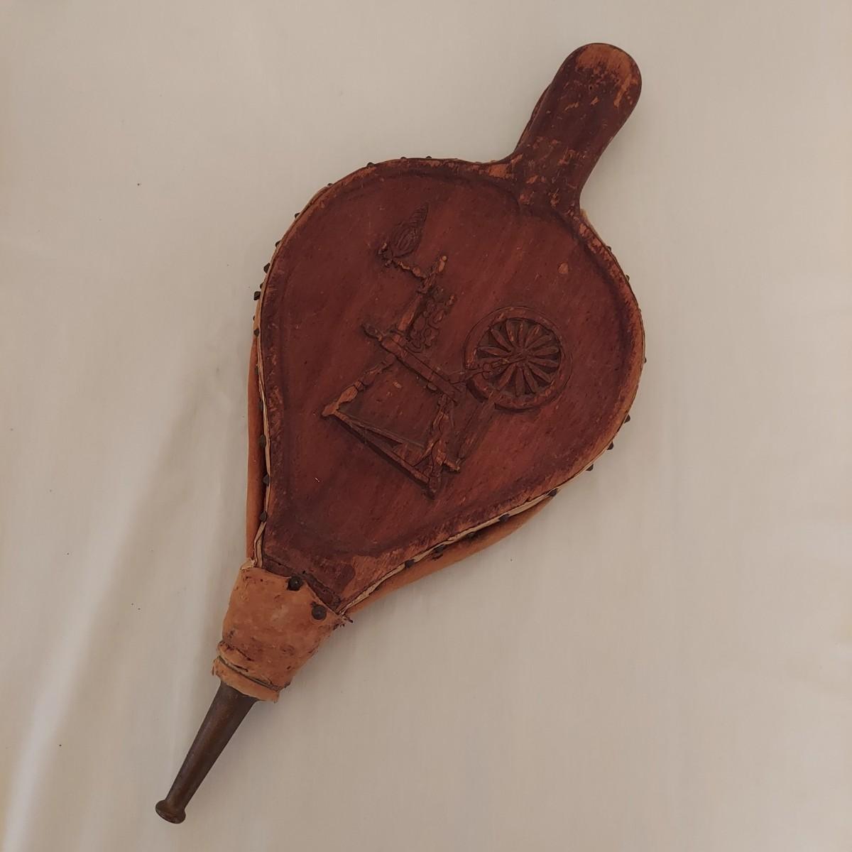 Three pieces that appear to be Early North American collectables. Includes a leather bellows, a wooden milking stool and butter churn that's missing its dasher/pole. The little stool measures roughly 8"D x 12"H. Please see photos for details. Shipping available