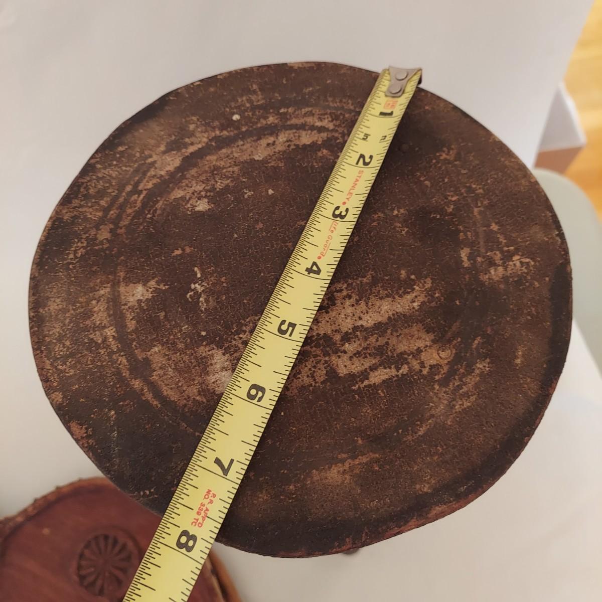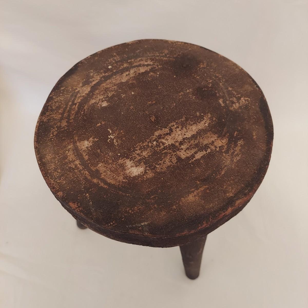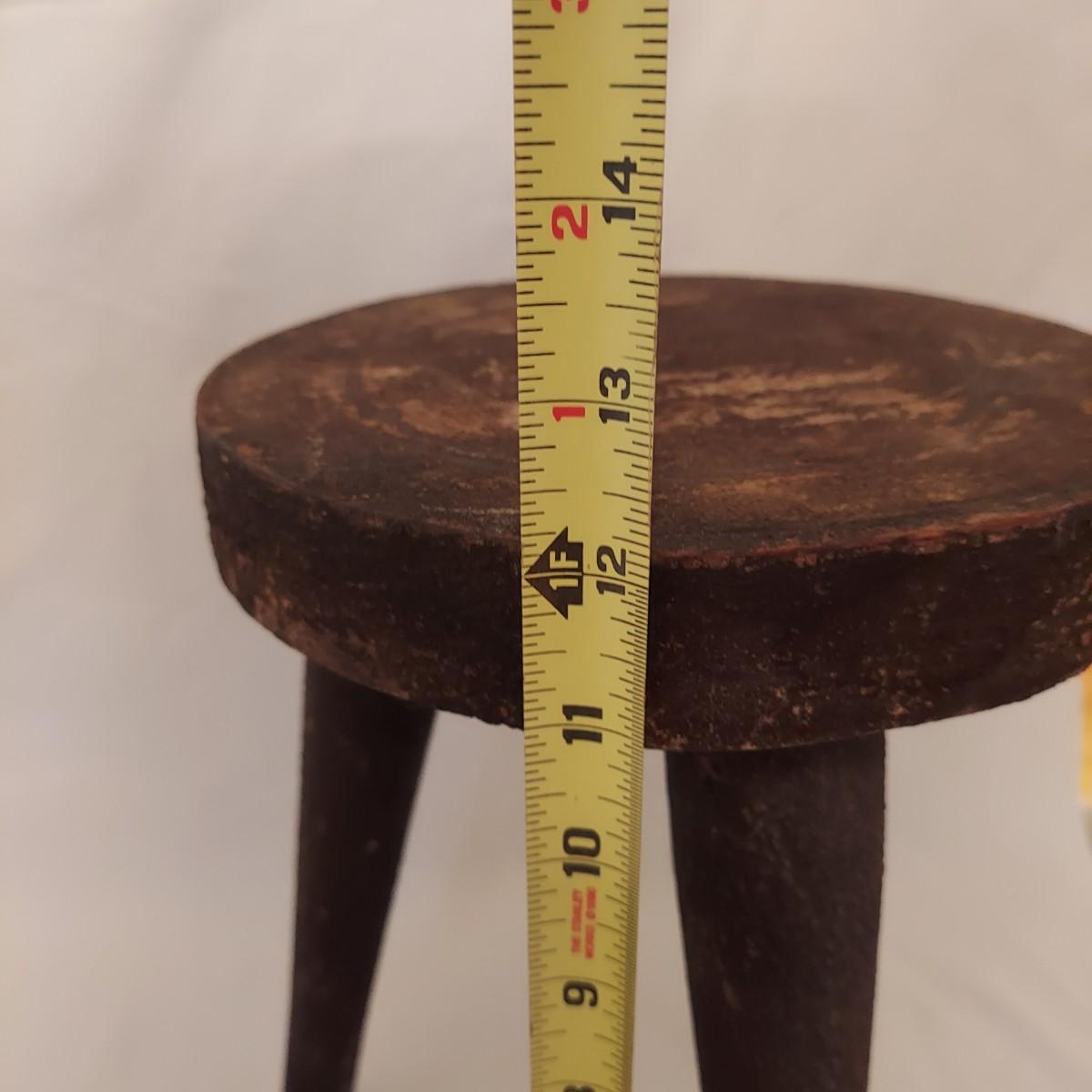 Three pieces that appear to be Early North American collectables. Includes a leather bellows, a wooden milking stool and butter churn that's missing its dasher/pole. The little stool measures roughly 8"D x 12"H. Please see photos for details. Shipping available