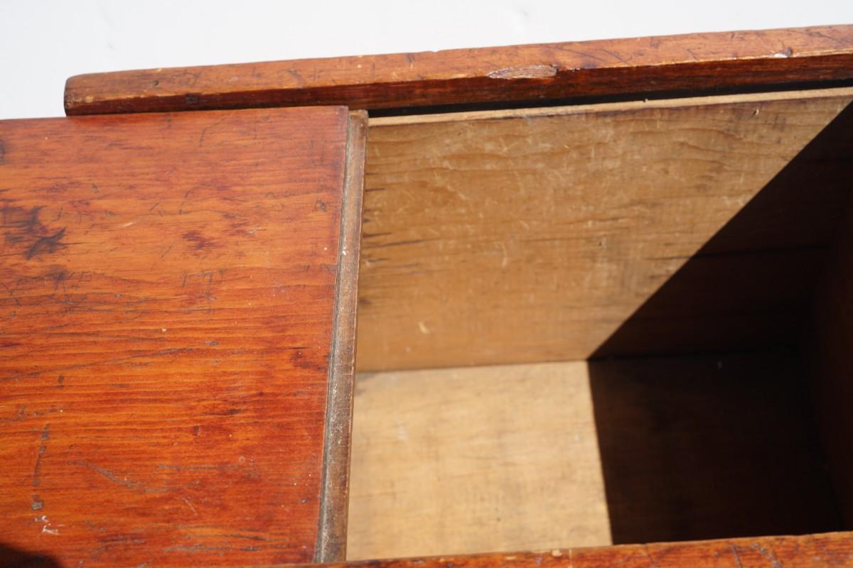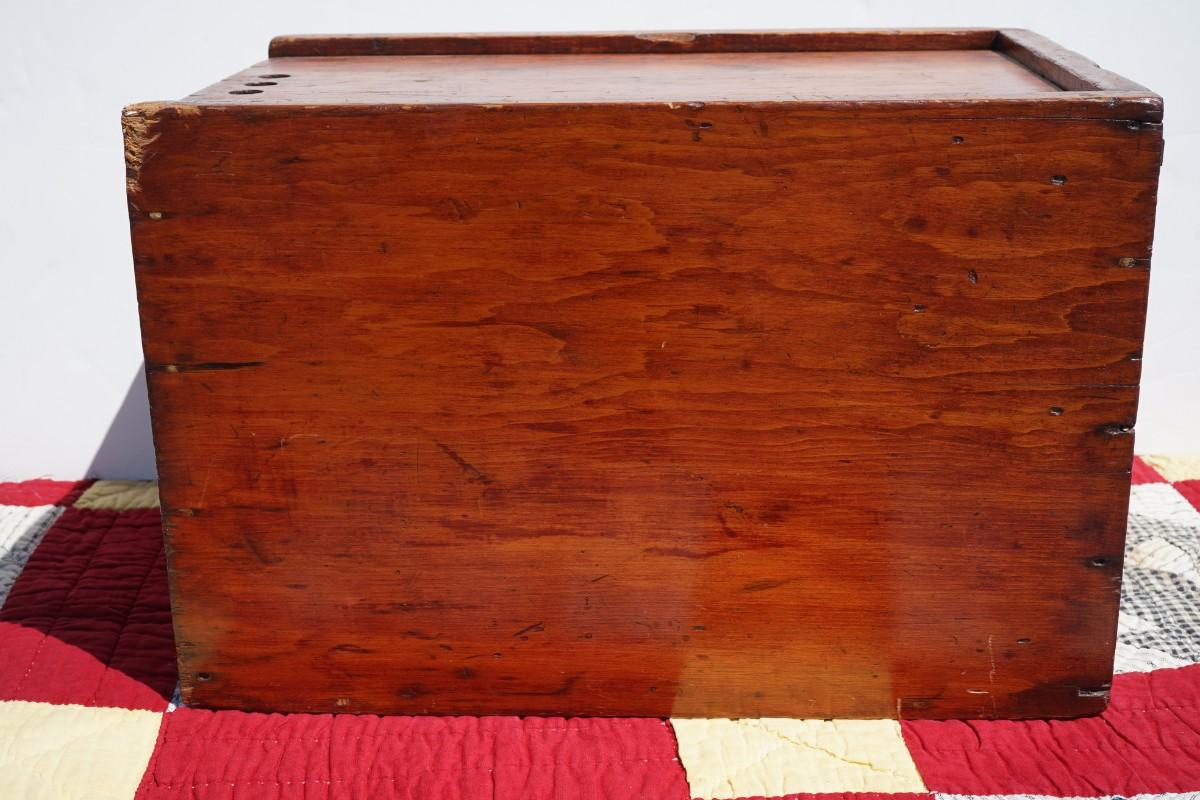 EARLY PINE STORAGE BOX W/ THREE FINGER INDENTS TO OPEN AT TOP. HAND CRAFTED.