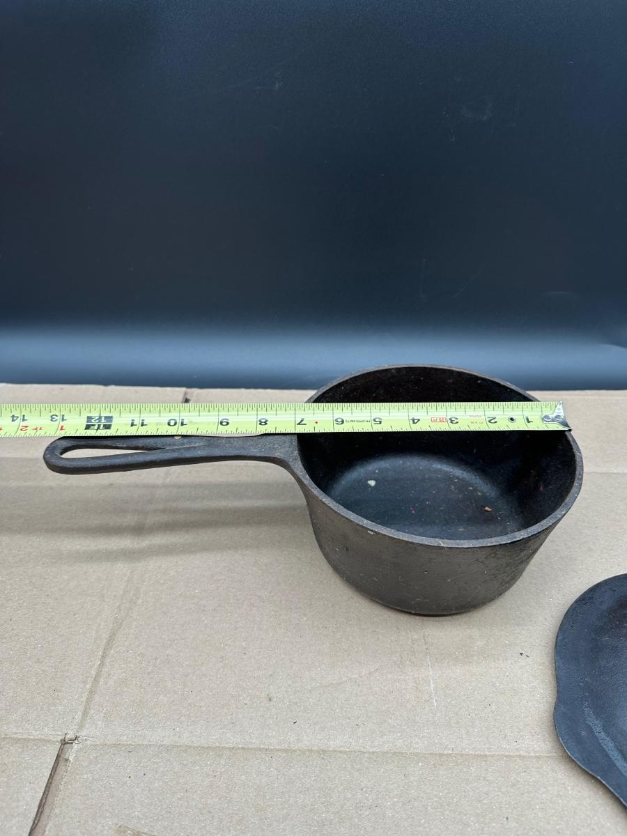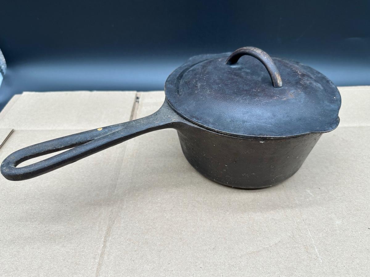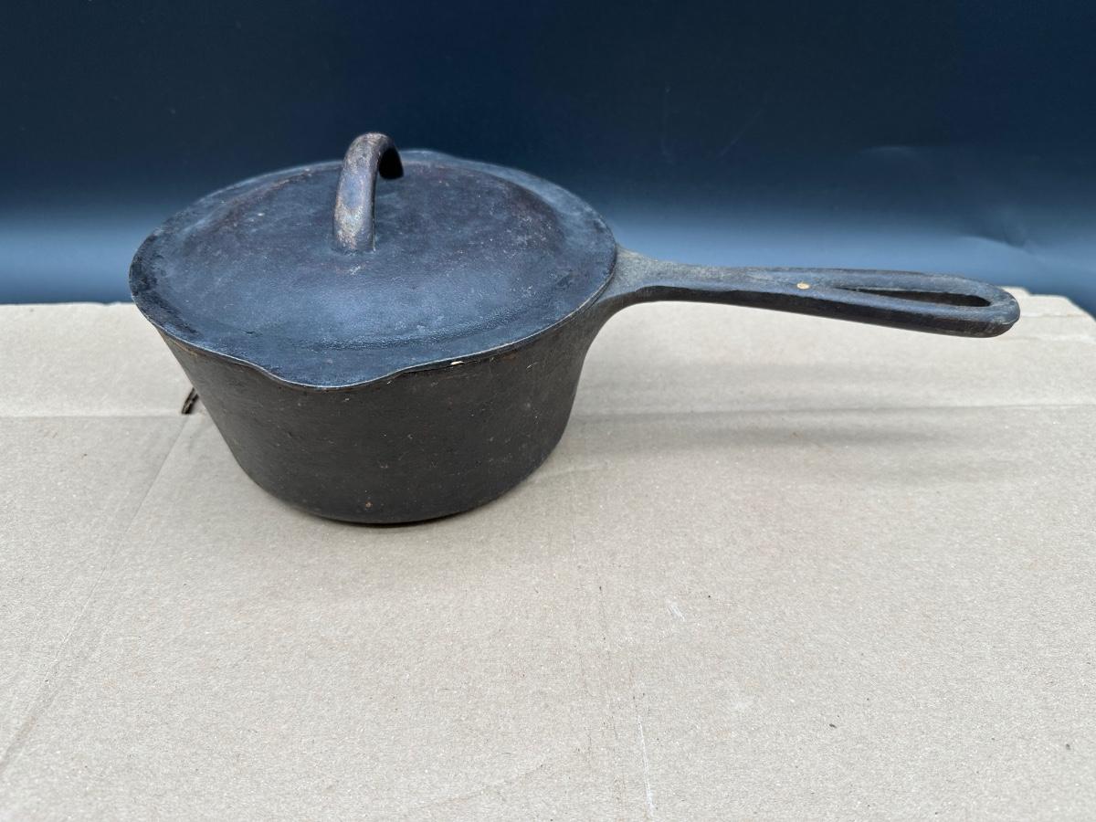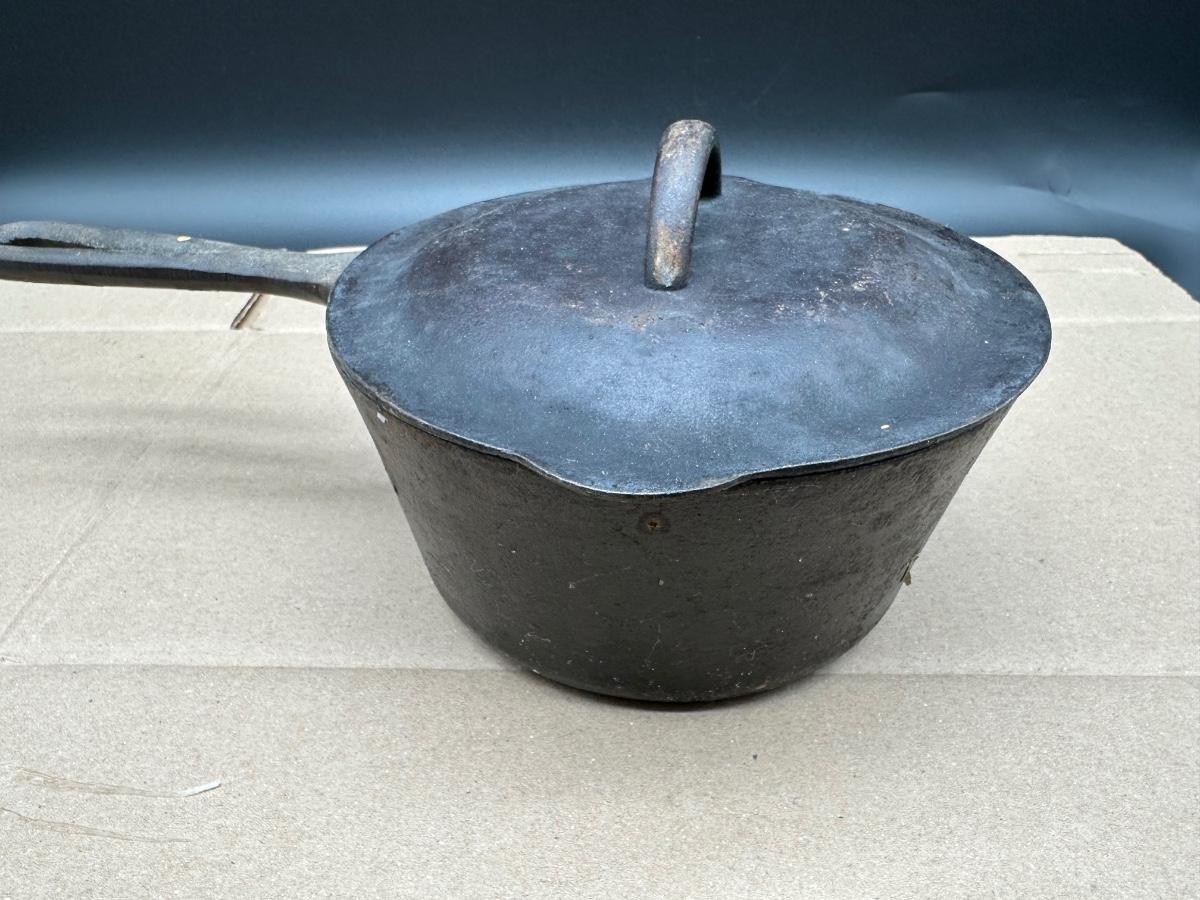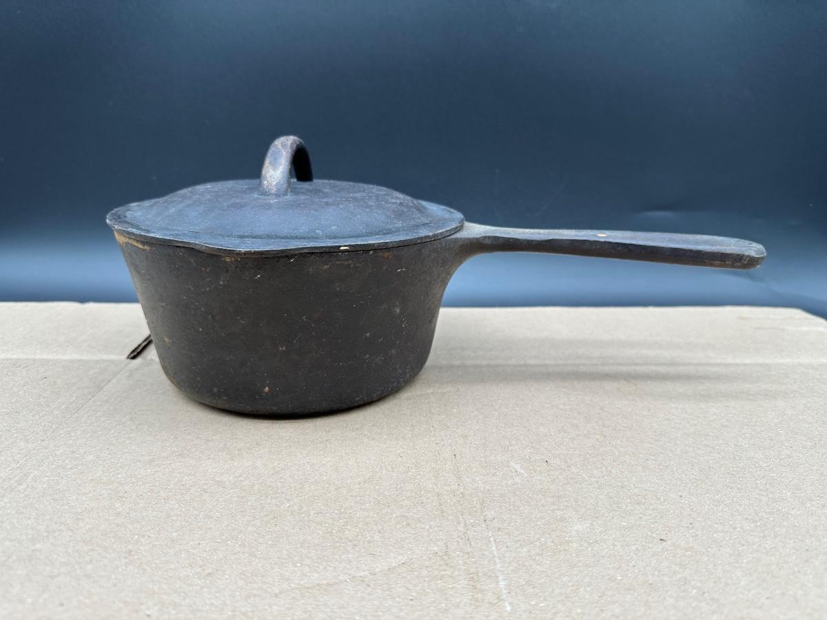 Early unmarked 2 quart cast iron saucepan with matching lid.