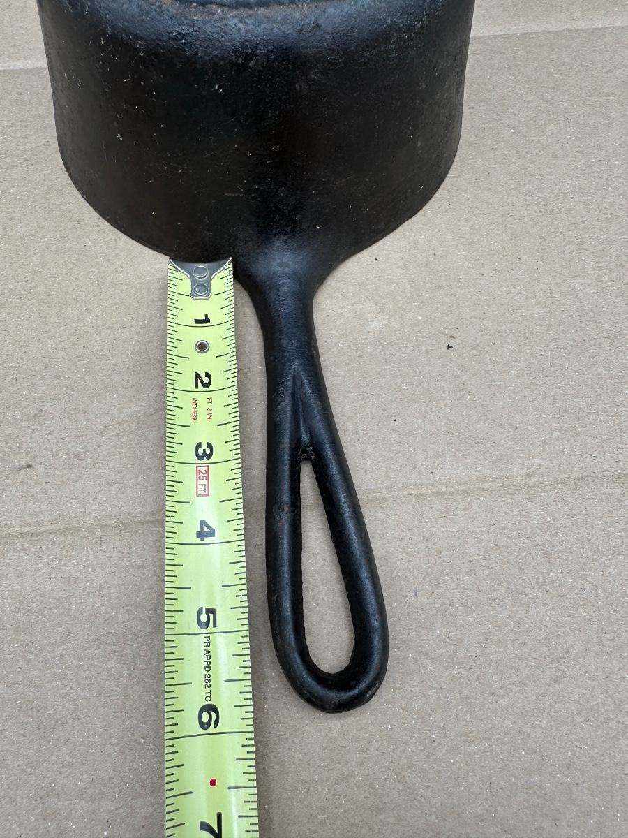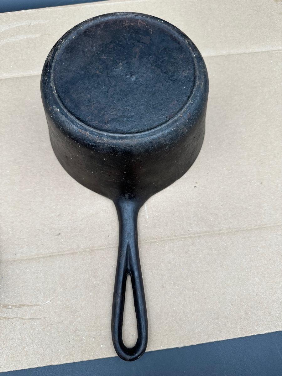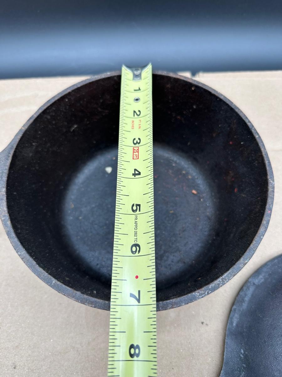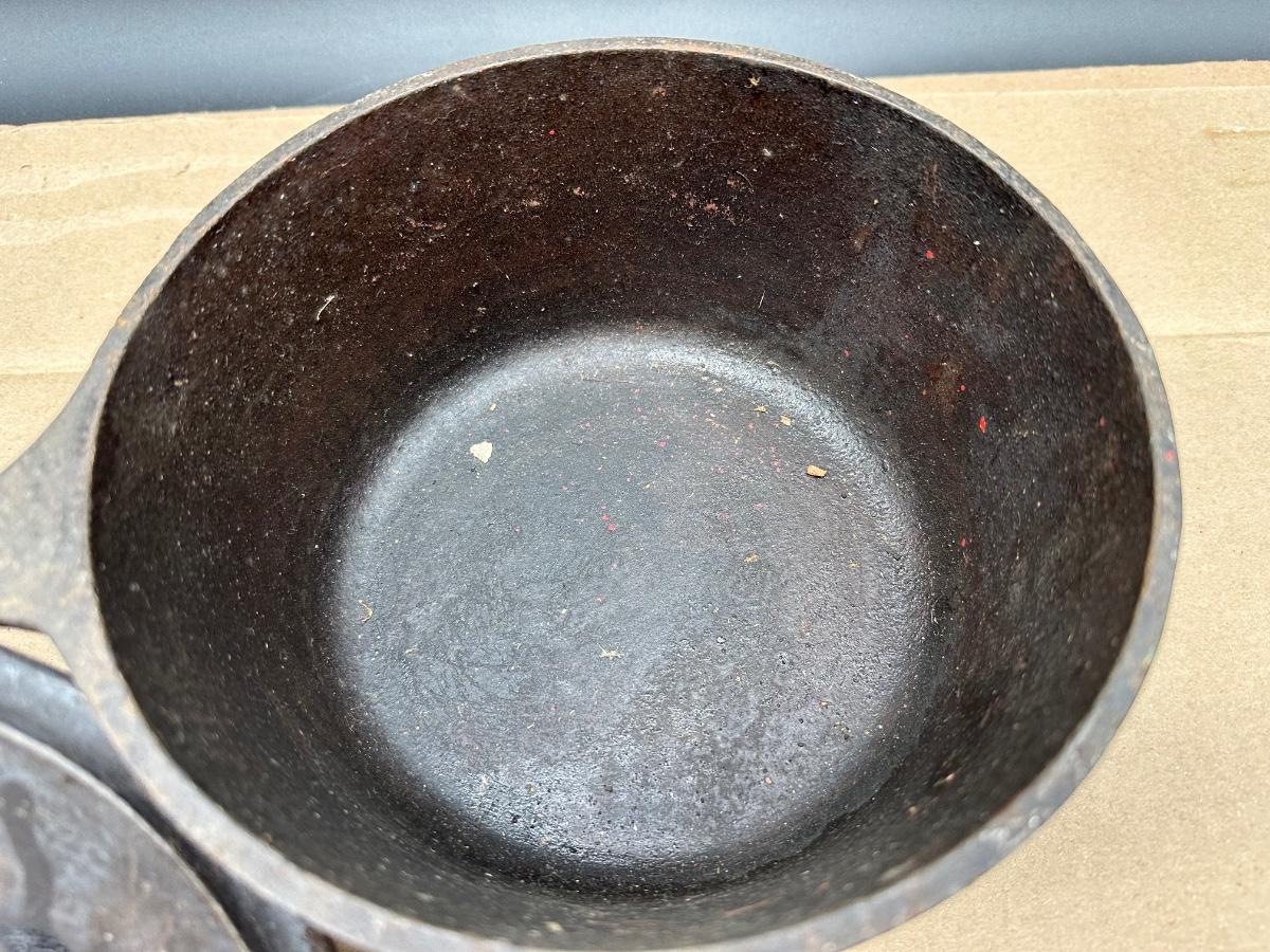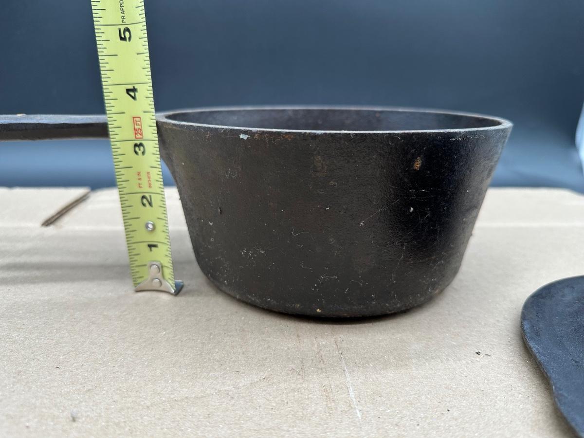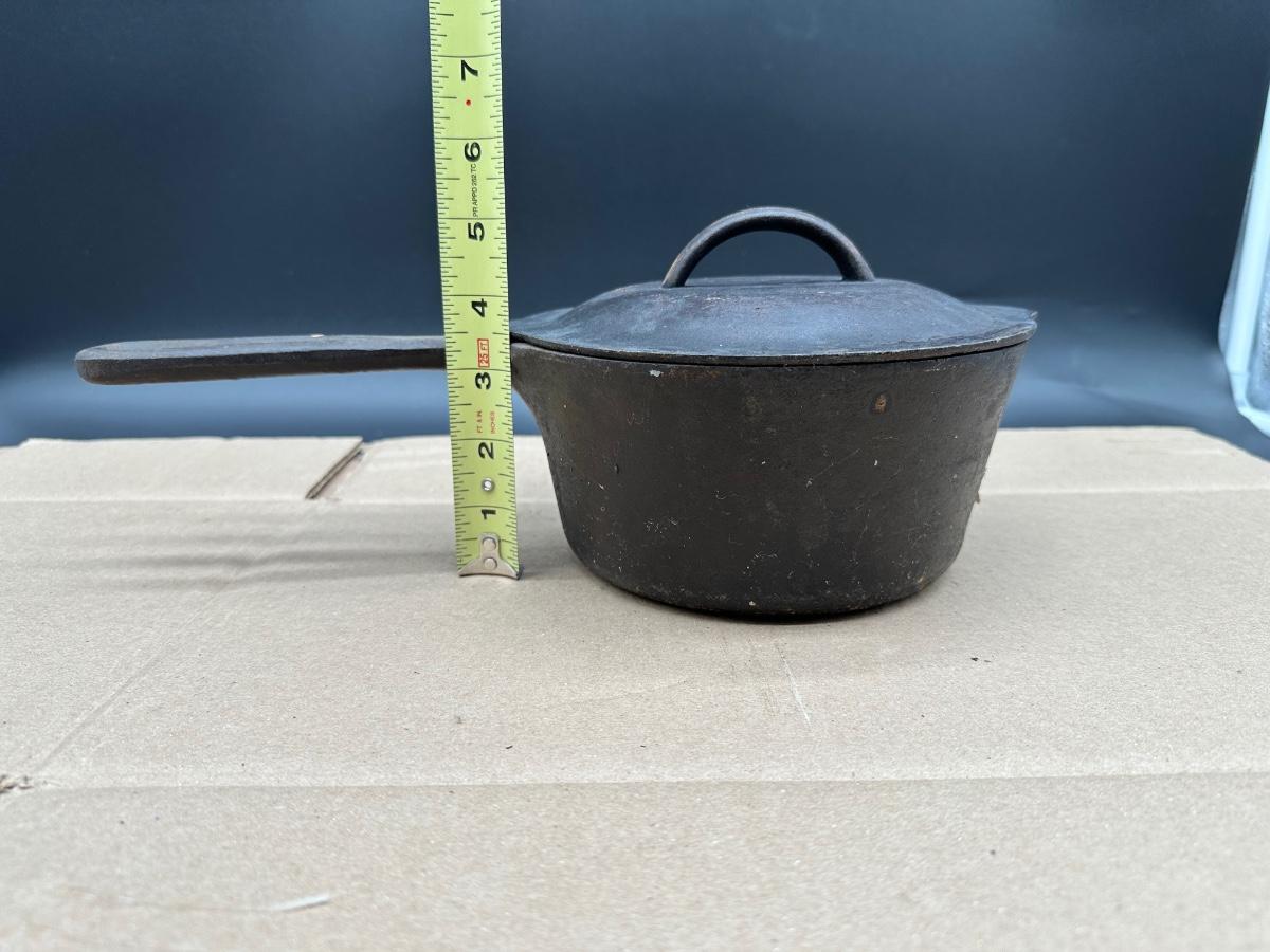 Early unmarked 2 quart cast iron saucepan with matching lid.
