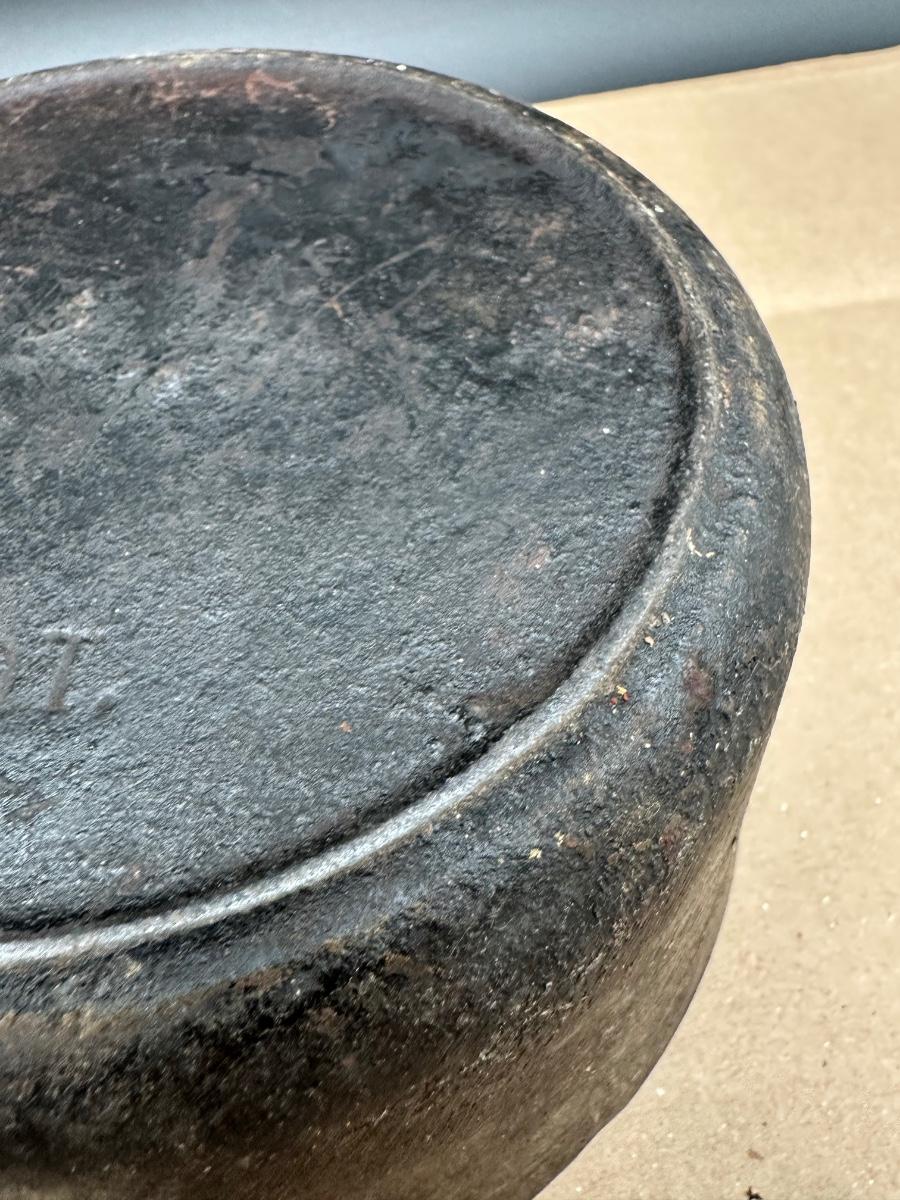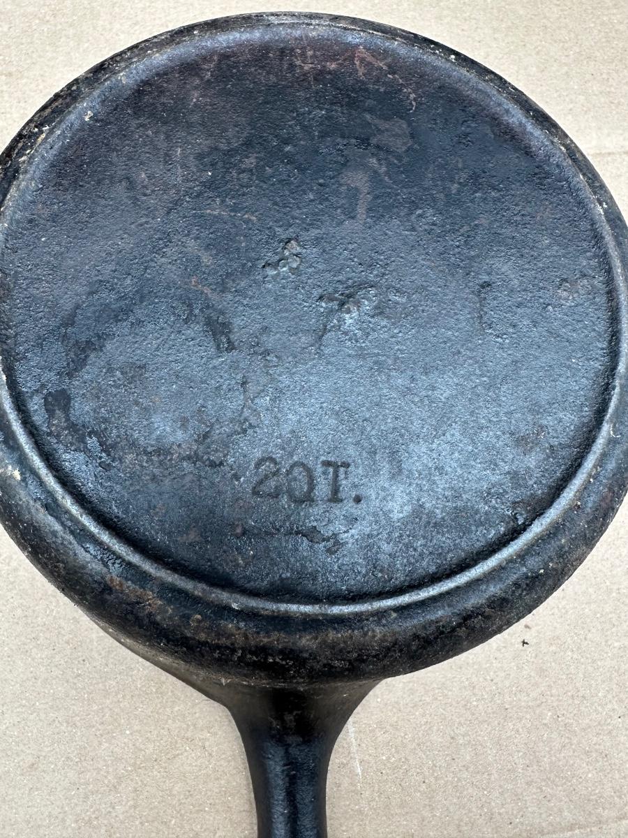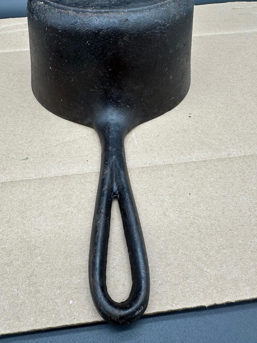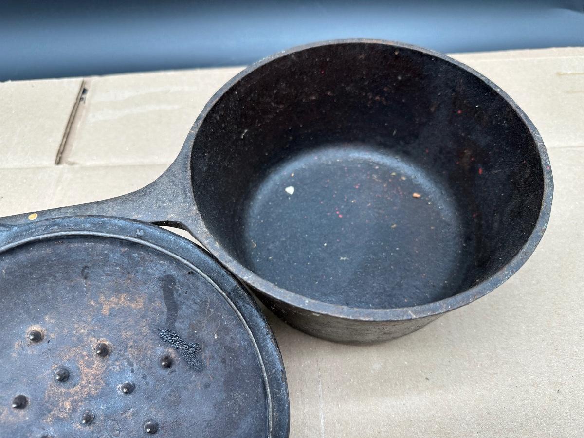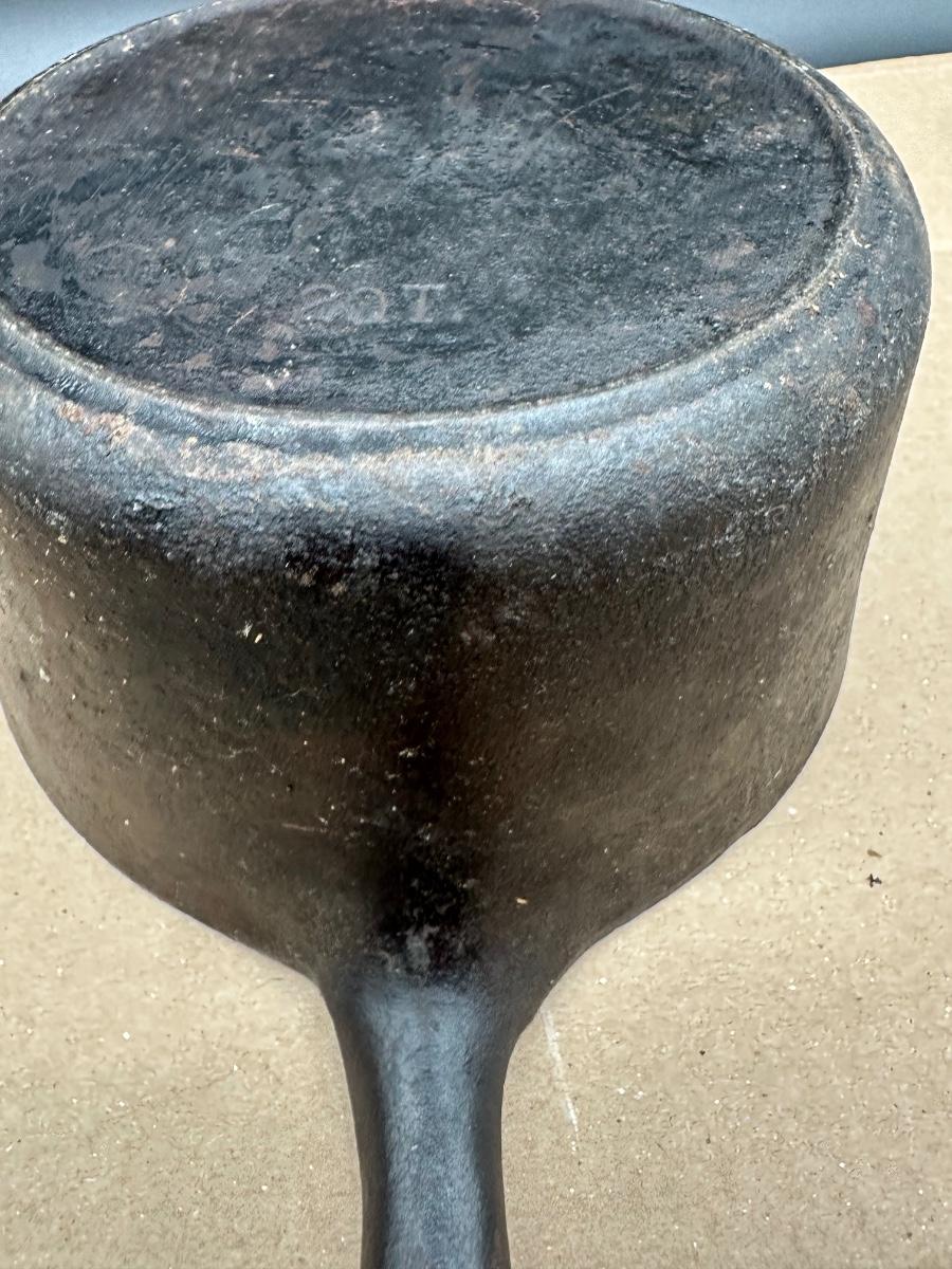 Early unmarked 2 quart cast iron saucepan with matching lid.