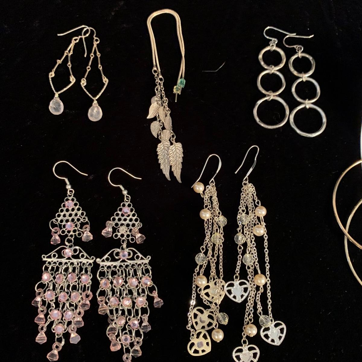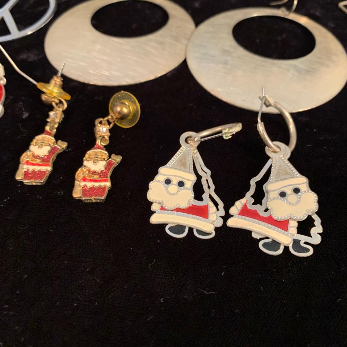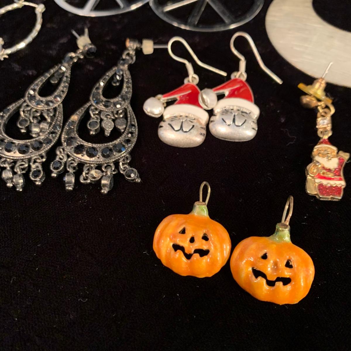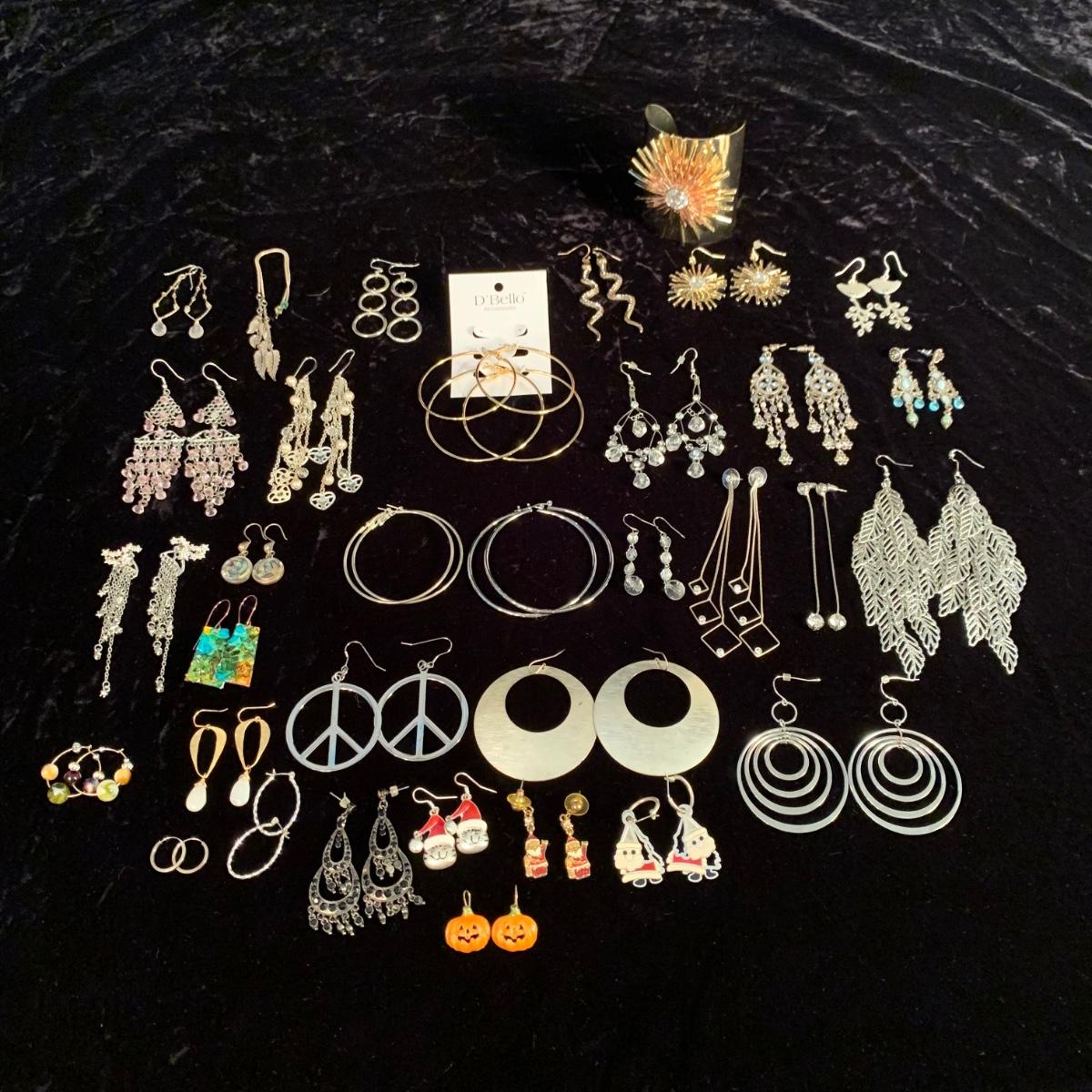 30+ pairs of earrings, with one earring and bracelet cuff set. All earrings are for pierced ears. Lots of styles for various occasions, including hoops, dangly earrings, holiday-themed, and more. One pair is marked “950”. One dangly pair is missing part of a beaded strand, see photos. Two packages of earring backs included as well. Shipping available.