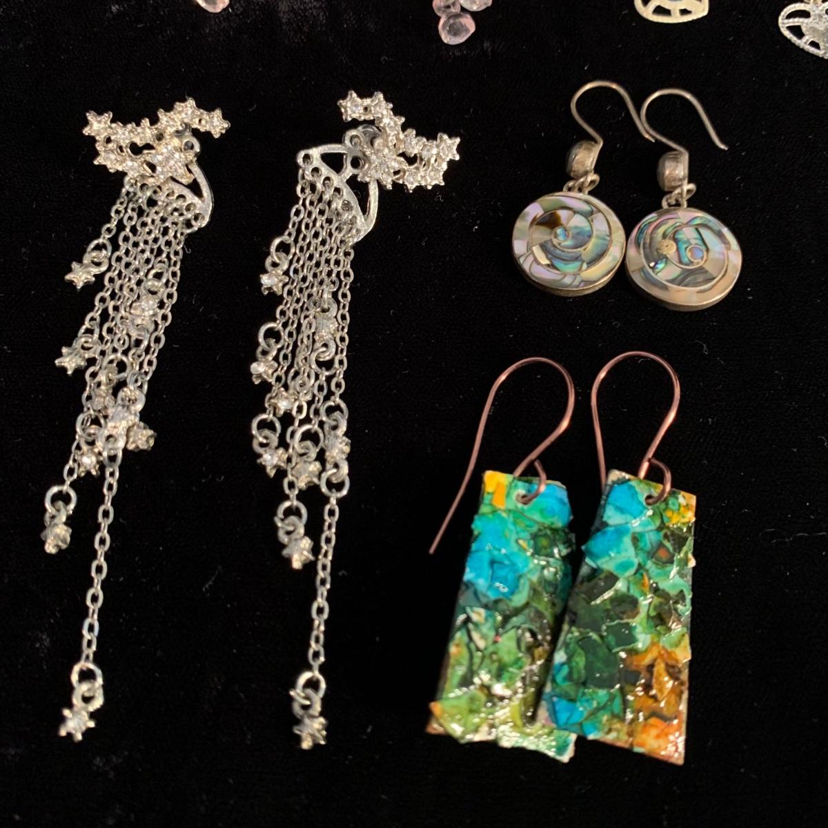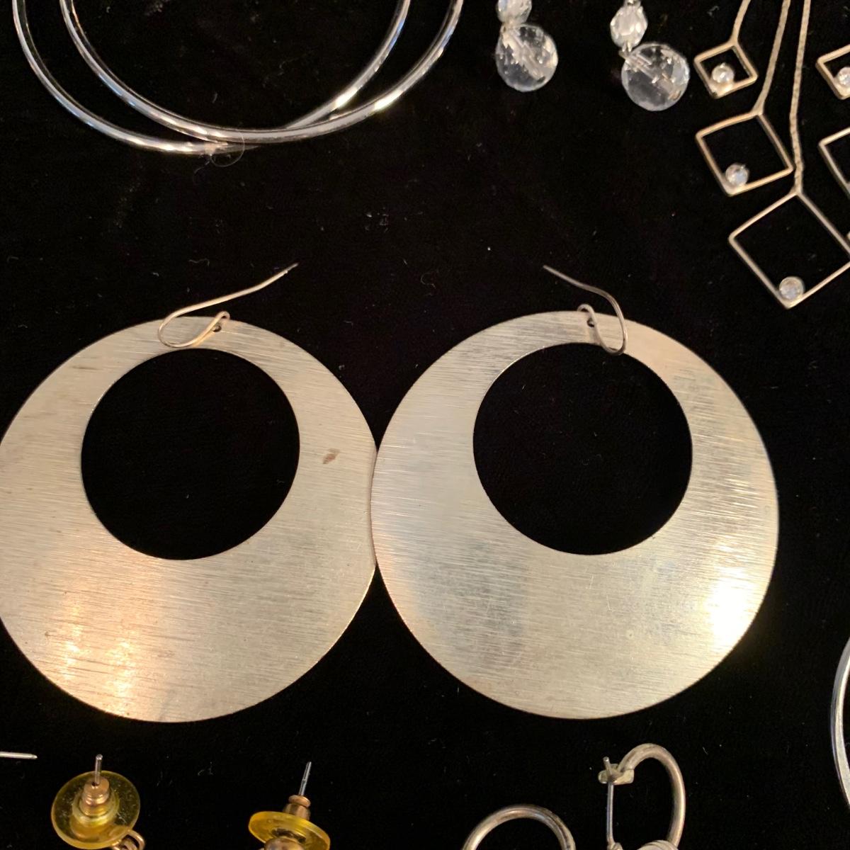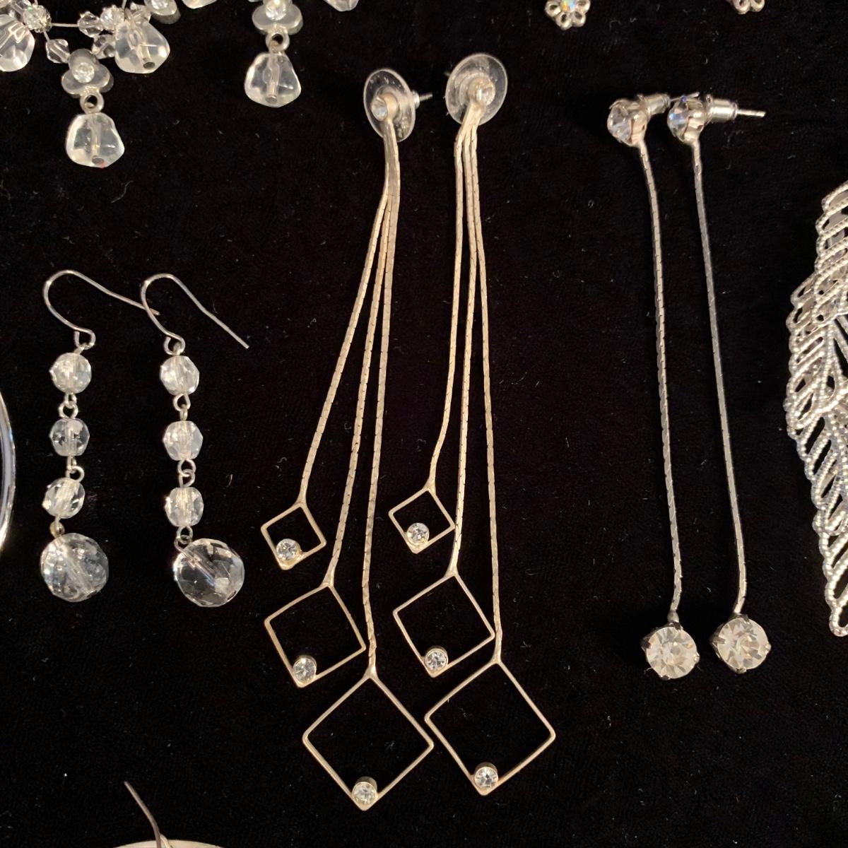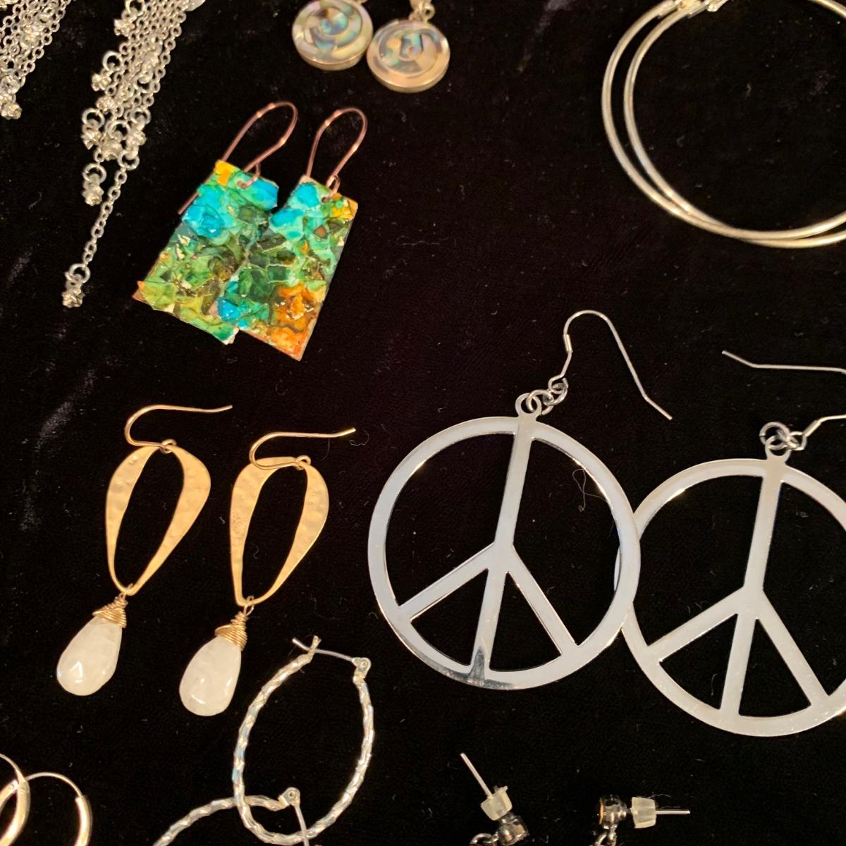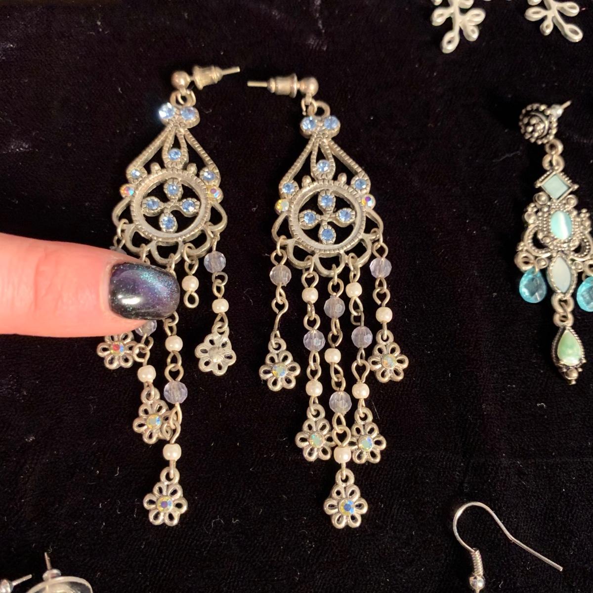 30+ pairs of earrings, with one earring and bracelet cuff set. All earrings are for pierced ears. Lots of styles for various occasions, including hoops, dangly earrings, holiday-themed, and more. One pair is marked “950”. One dangly pair is missing part of a beaded strand, see photos. Two packages of earring backs included as well. Shipping available.