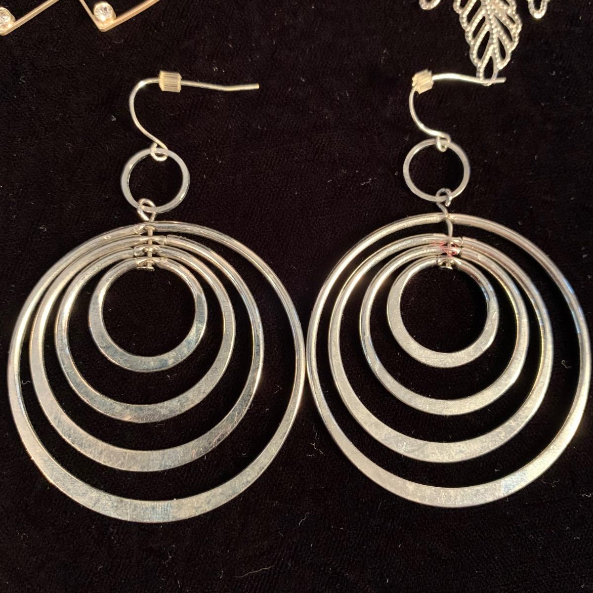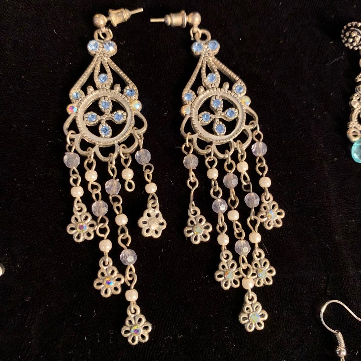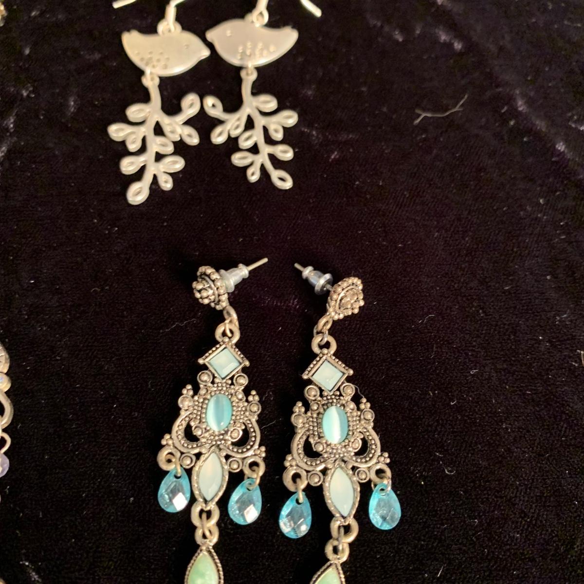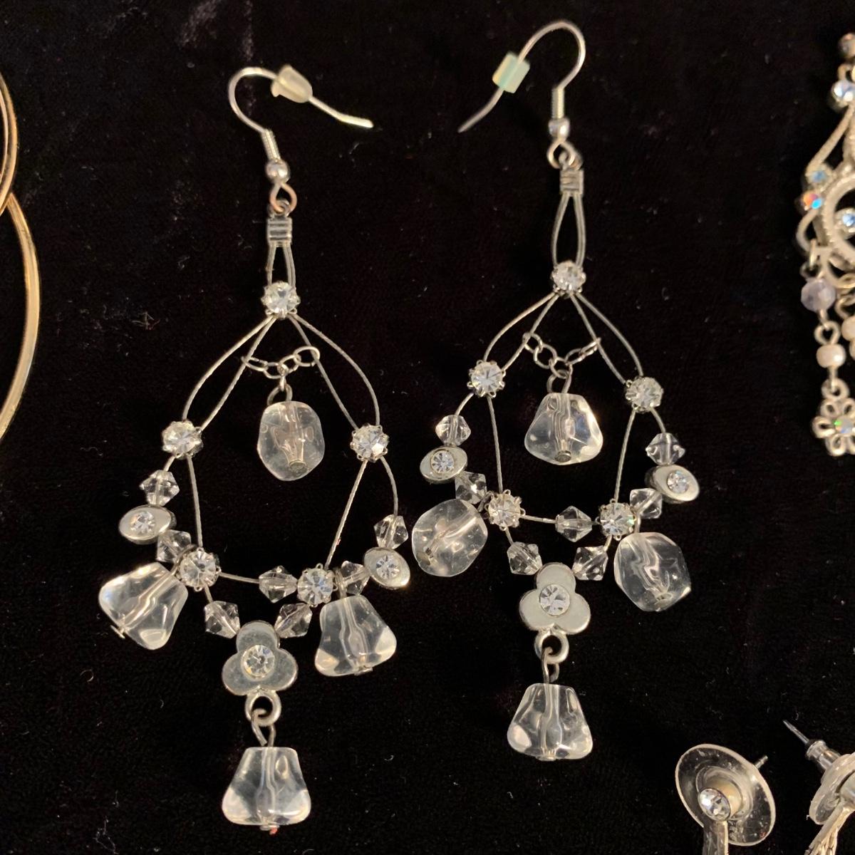 30+ pairs of earrings, with one earring and bracelet cuff set. All earrings are for pierced ears. Lots of styles for various occasions, including hoops, dangly earrings, holiday-themed, and more. One pair is marked “950”. One dangly pair is missing part of a beaded strand, see photos. Two packages of earring backs included as well. Shipping available.