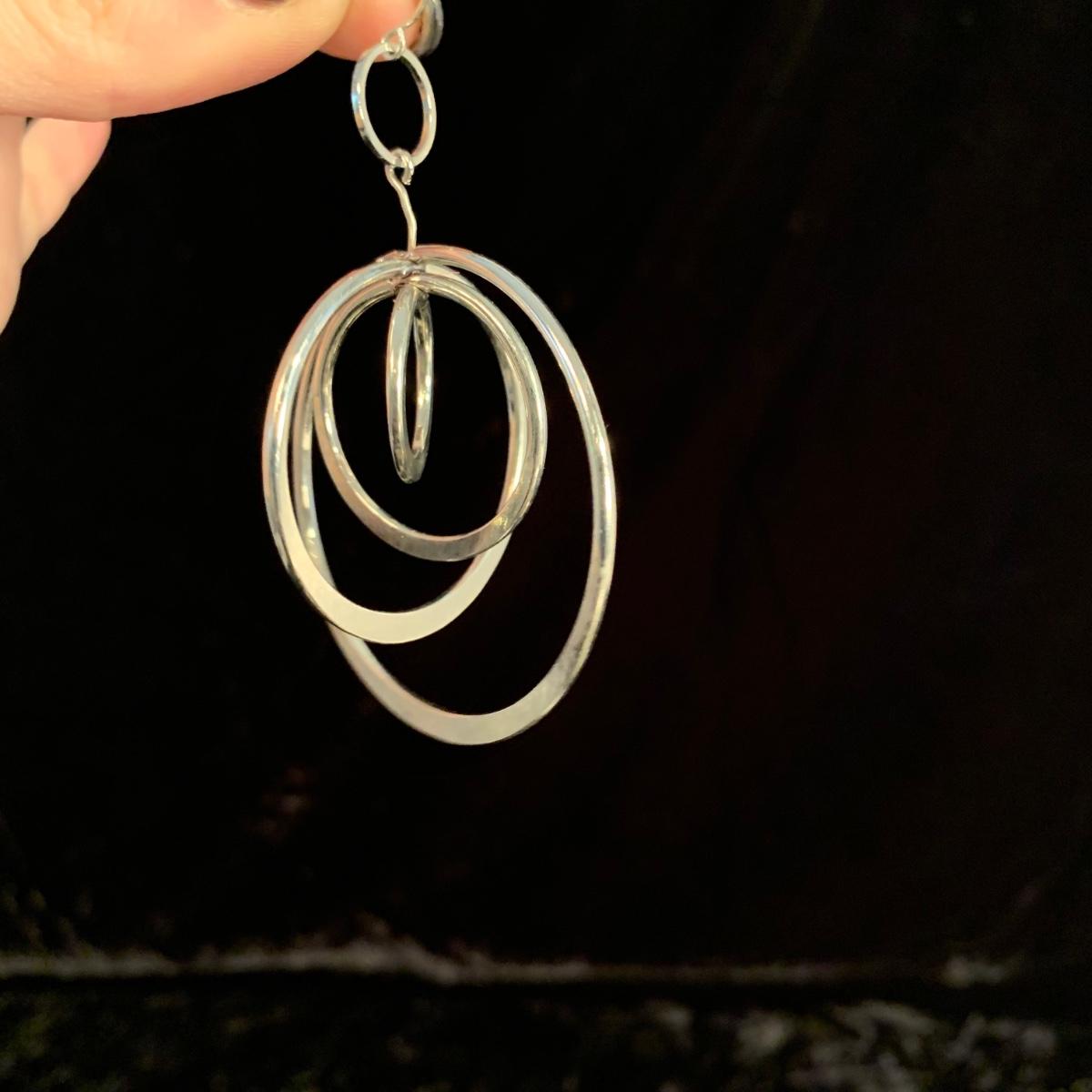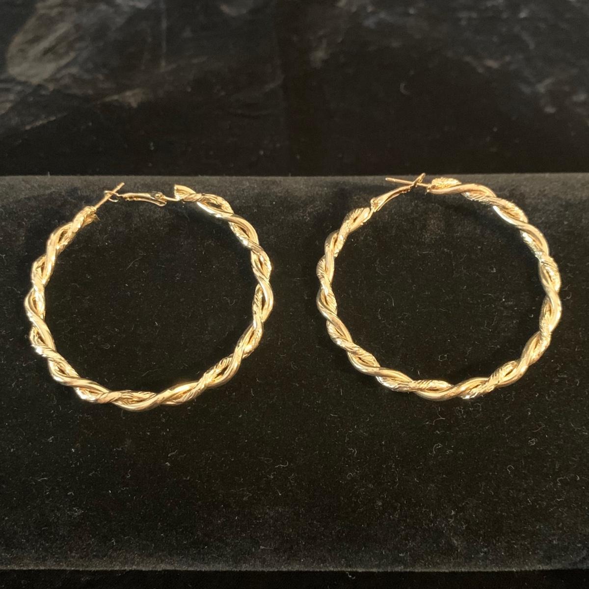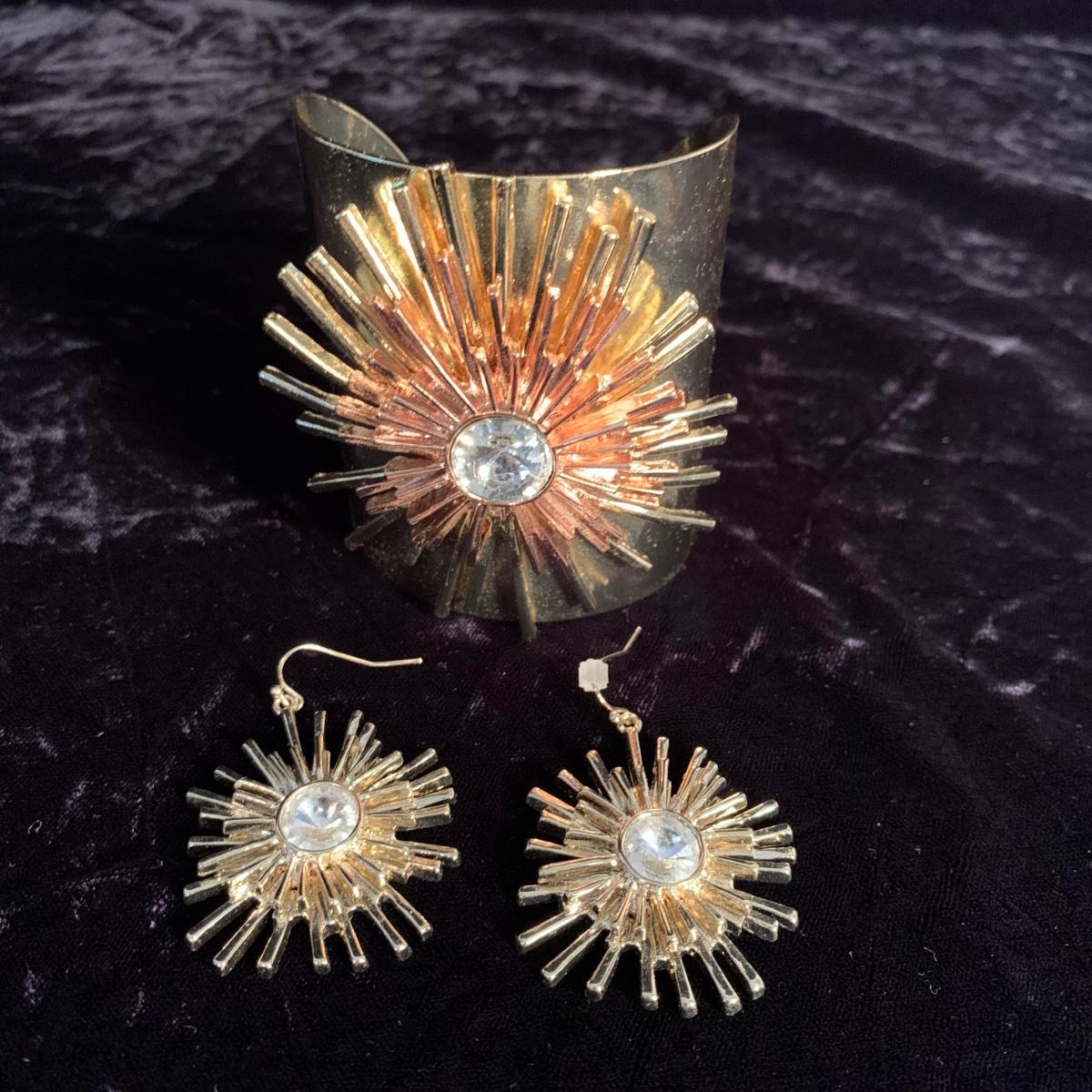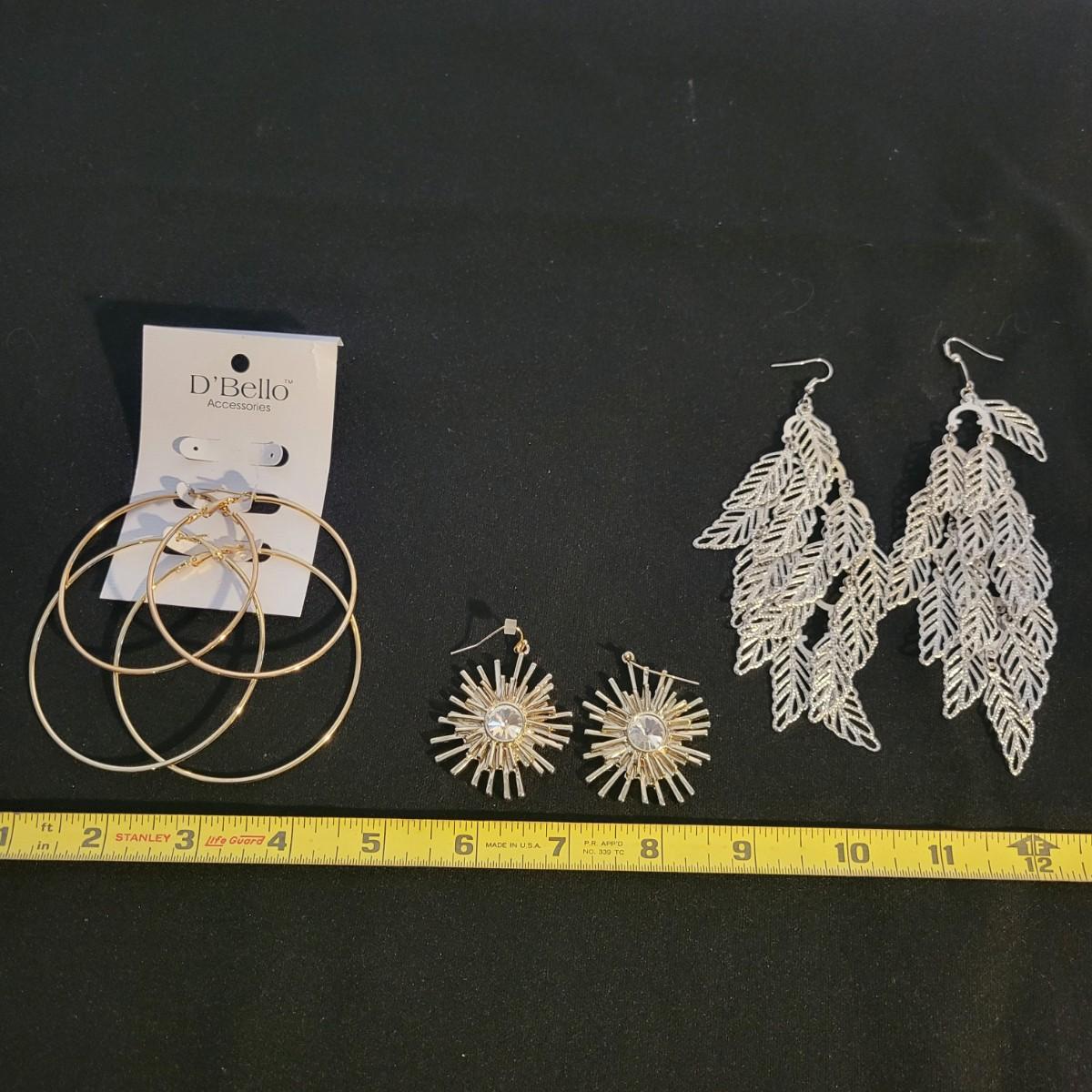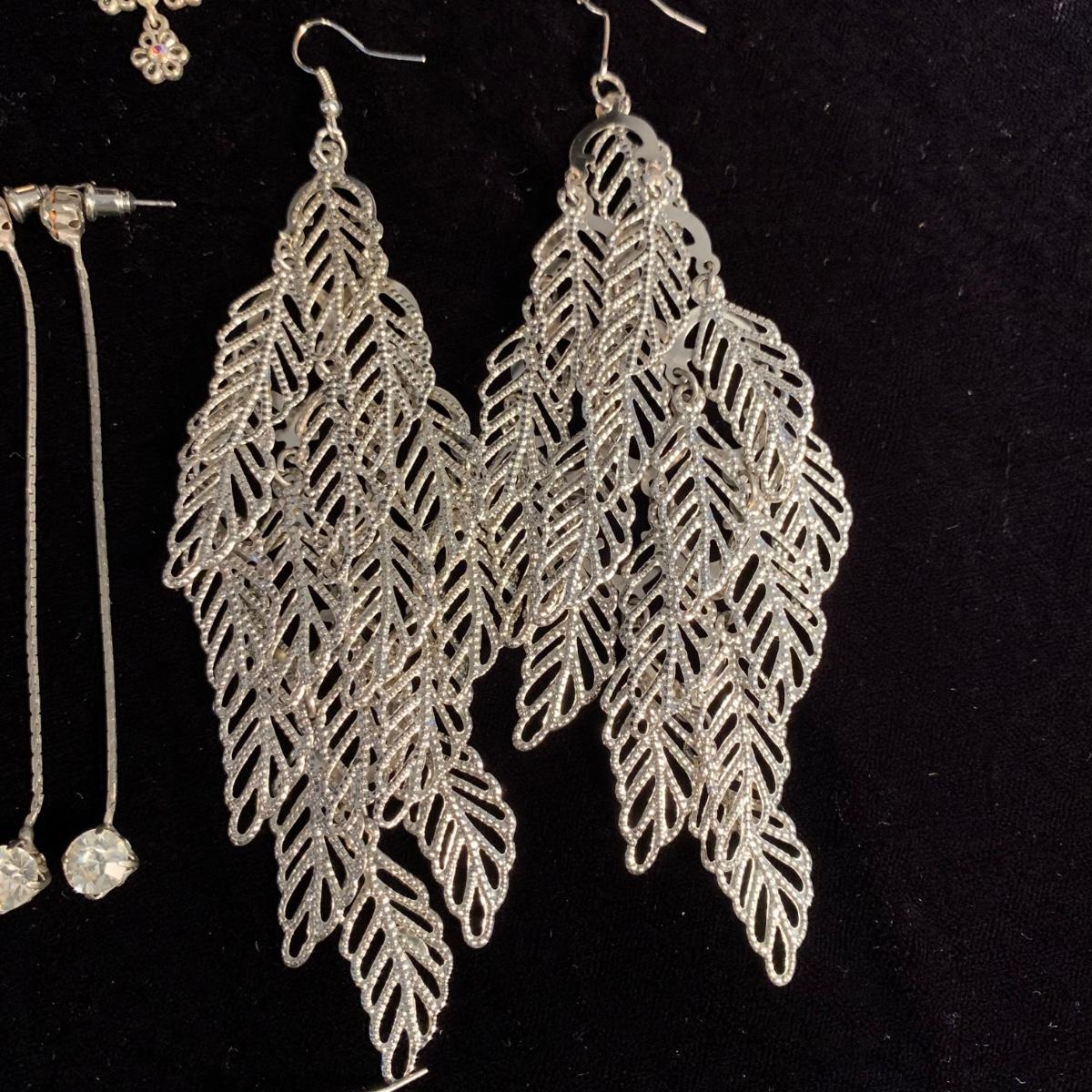 30+ pairs of earrings, with one earring and bracelet cuff set. All earrings are for pierced ears. Lots of styles for various occasions, including hoops, dangly earrings, holiday-themed, and more. One pair is marked “950”. One dangly pair is missing part of a beaded strand, see photos. Two packages of earring backs included as well. Shipping available.