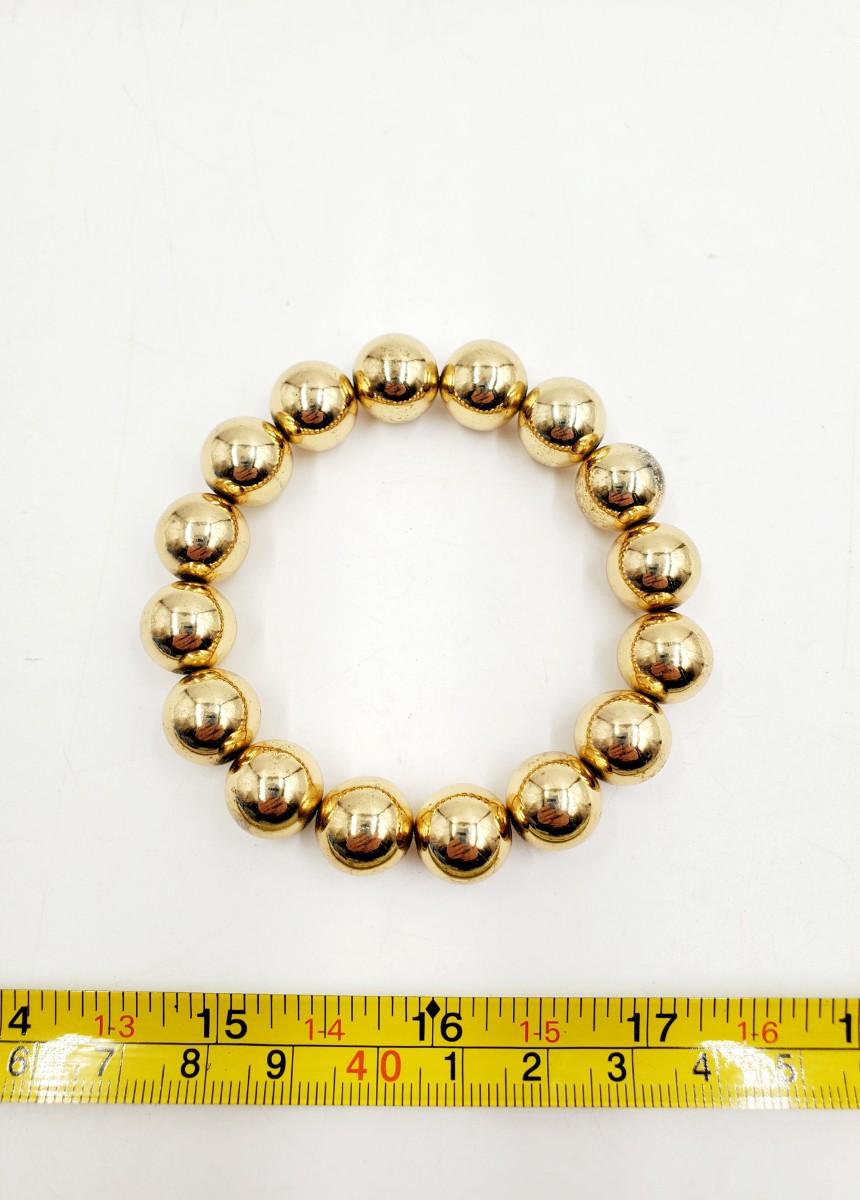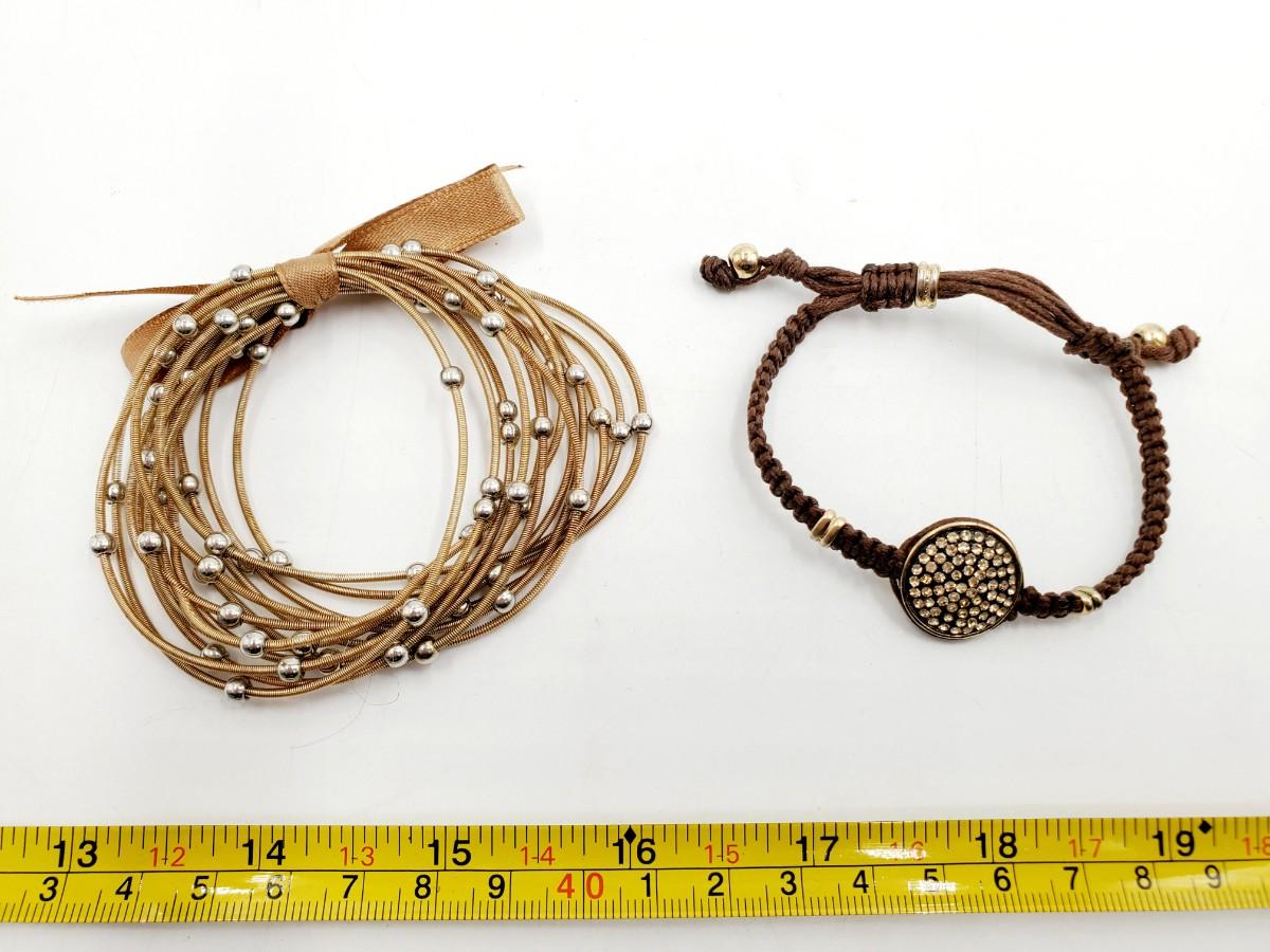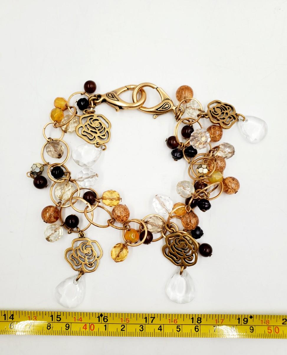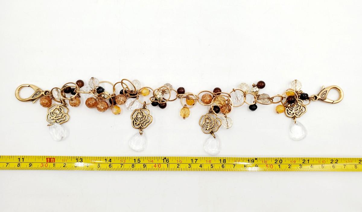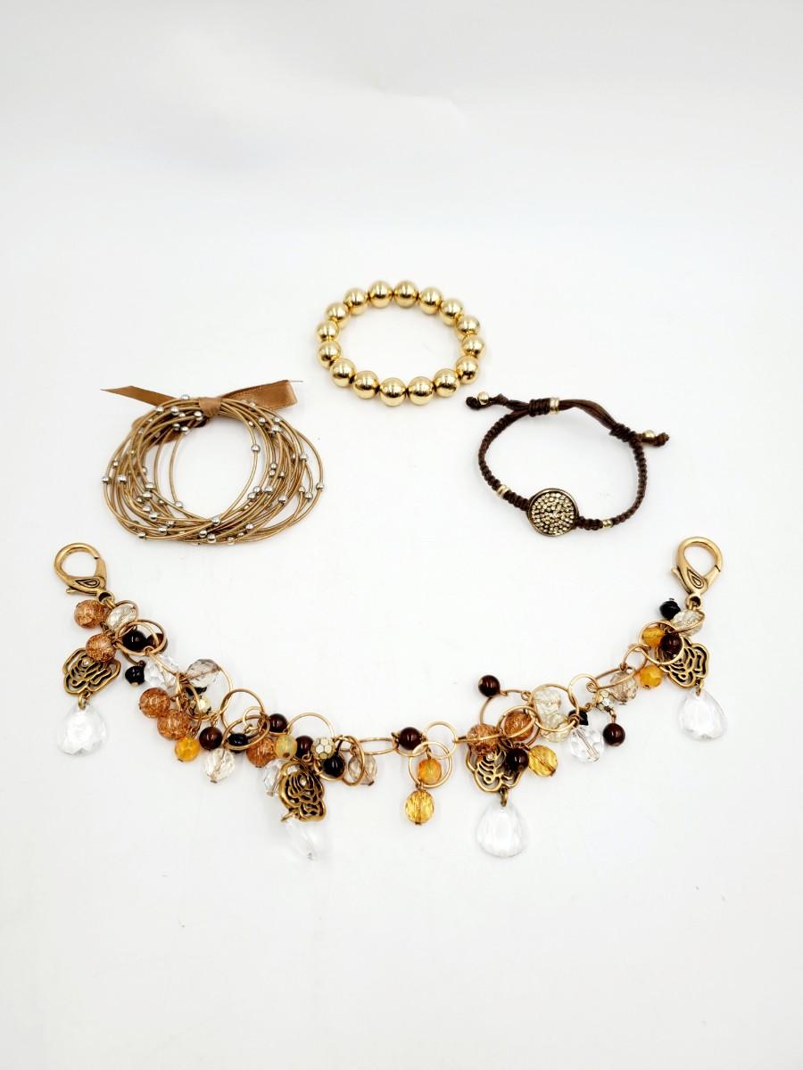 3 pretty gold and or earth toned bracelets. All good condition. Pretty accessory with dangle plastic and metal beads for a belt, DIY necklace, purse or whatever your heart desires, a lobster clasp on either end, good condition