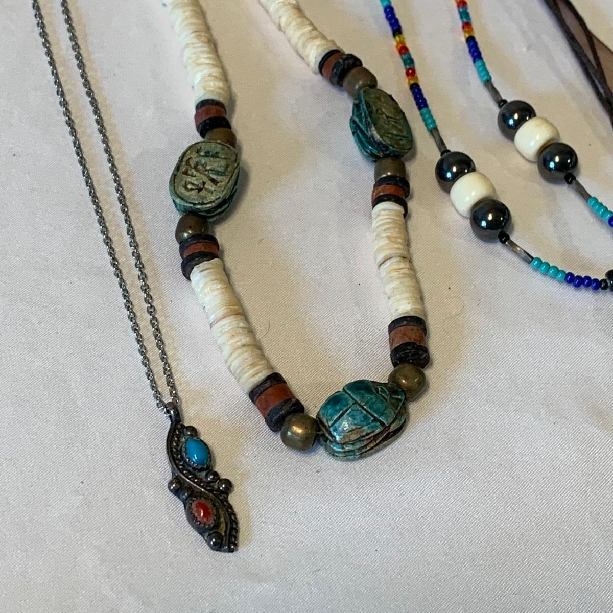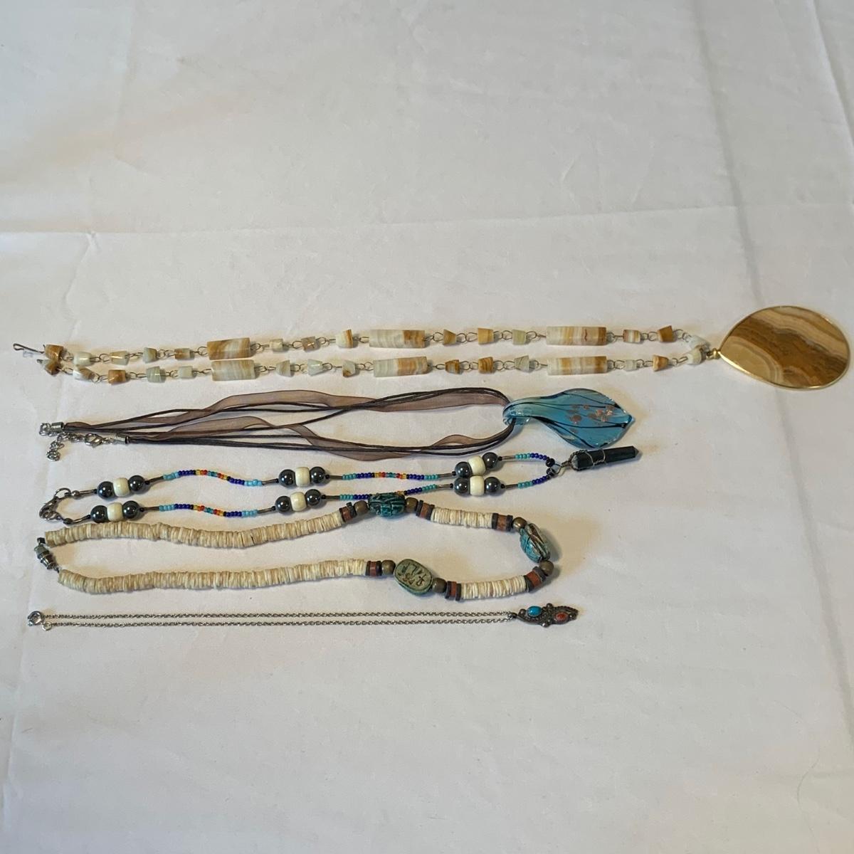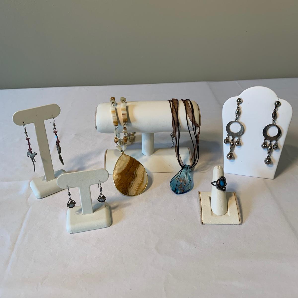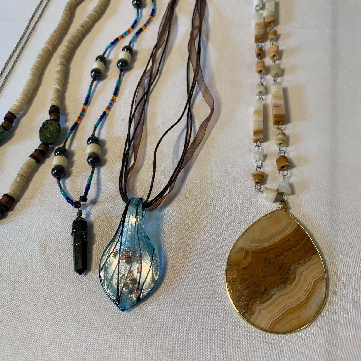 In this lovely collection of earth inspired jewelry, there are six necklaces, two bracelets, a watch, six pairs of earrings for pierced ears, and a ring. The jewelry features beads and stones. The ring appears to be size 6.5. The longest necklace is the one with the large agate-like pendant; its chain is 26”. The agate-like pendant looks like it was cracked and repaired with glue; see photos. The necklace with the blue pendant is glass. The watch is not currently ticking and likely needs its batteries replaced.