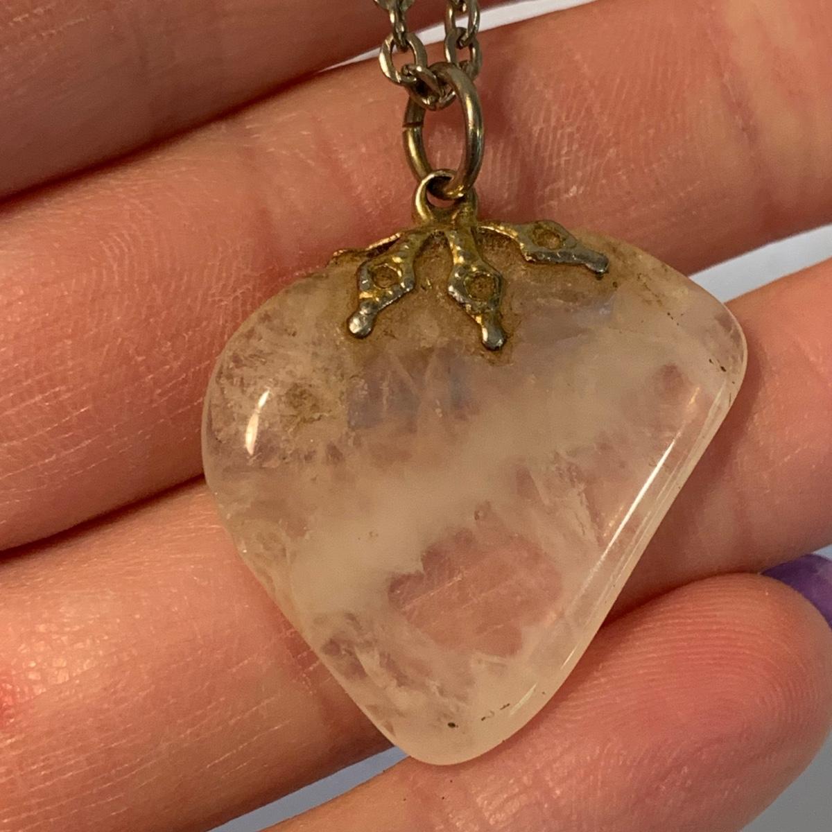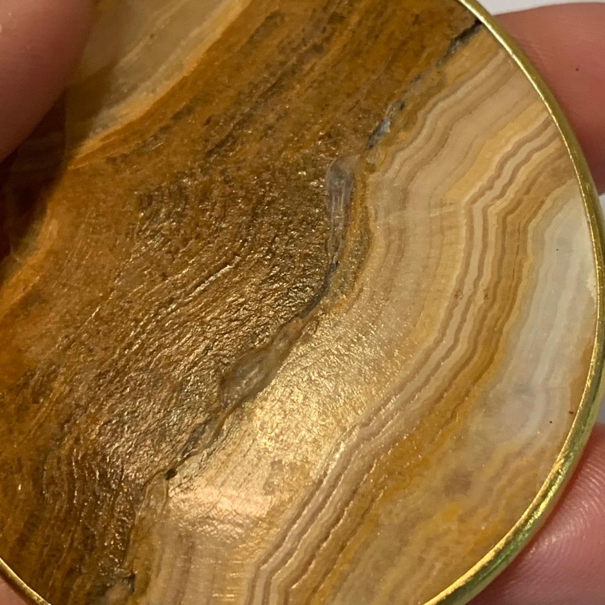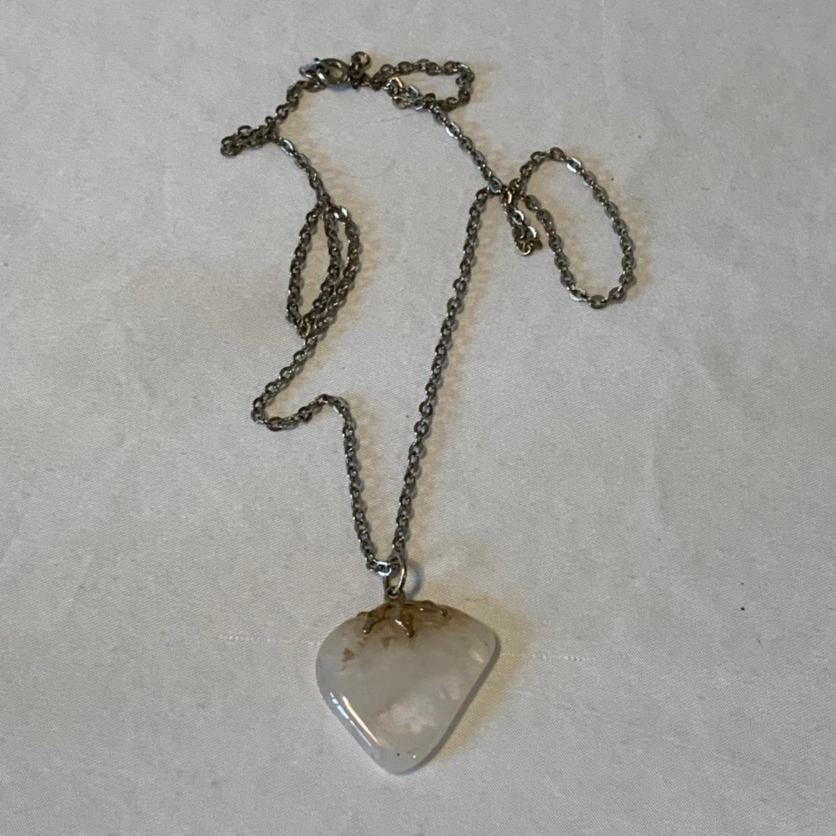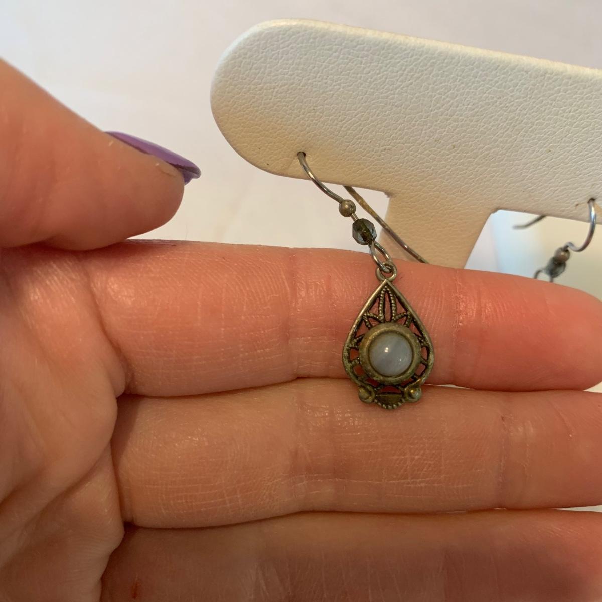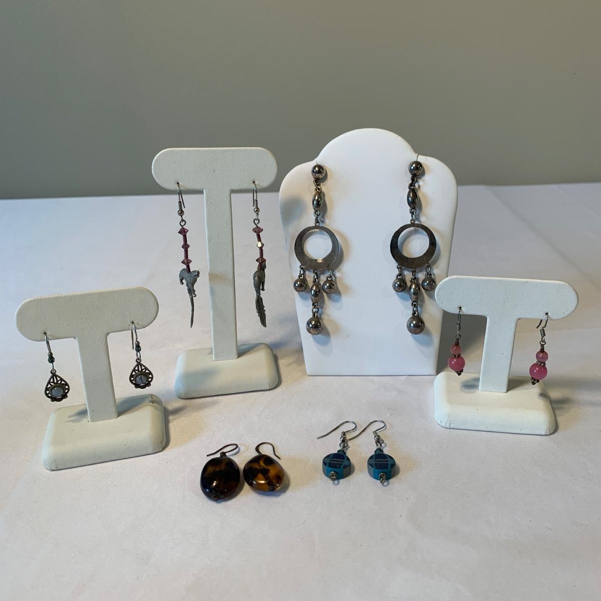 In this lovely collection of earth inspired jewelry, there are six necklaces, two bracelets, a watch, six pairs of earrings for pierced ears, and a ring. The jewelry features beads and stones. The ring appears to be size 6.5. The longest necklace is the one with the large agate-like pendant; its chain is 26”. The agate-like pendant looks like it was cracked and repaired with glue; see photos. The necklace with the blue pendant is glass. The watch is not currently ticking and likely needs its batteries replaced.