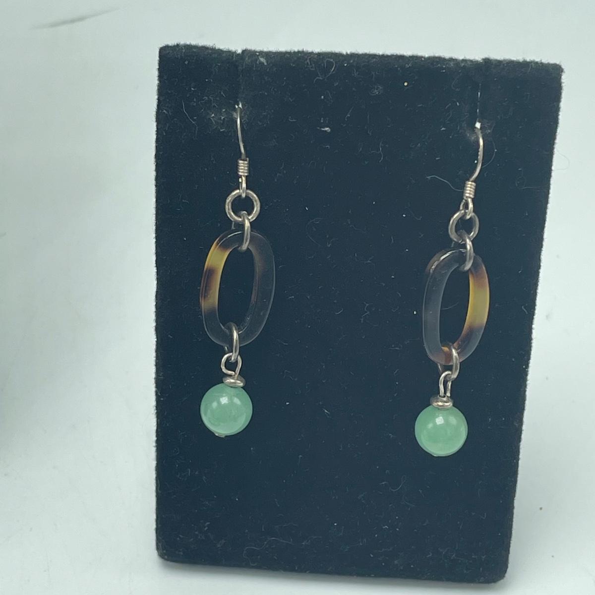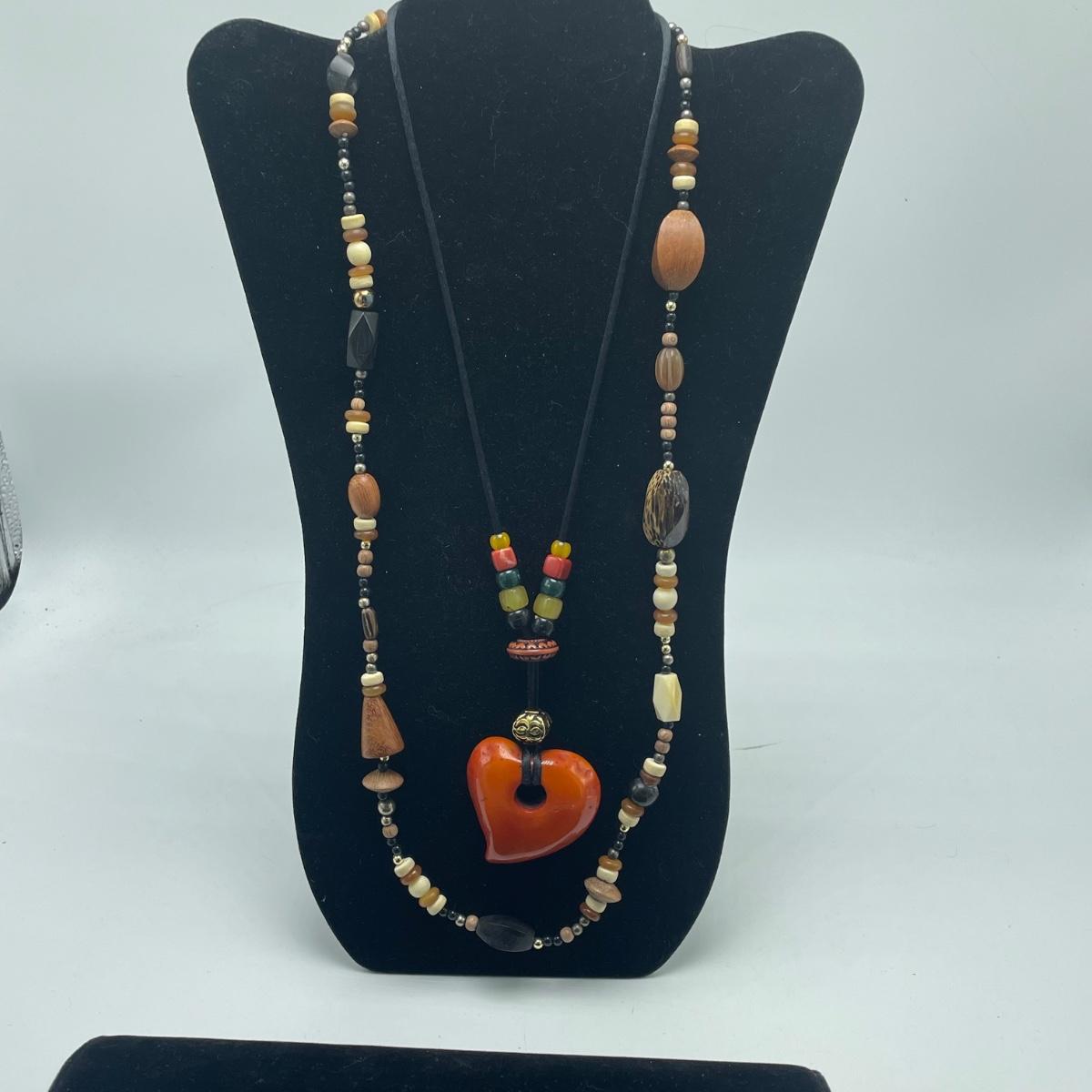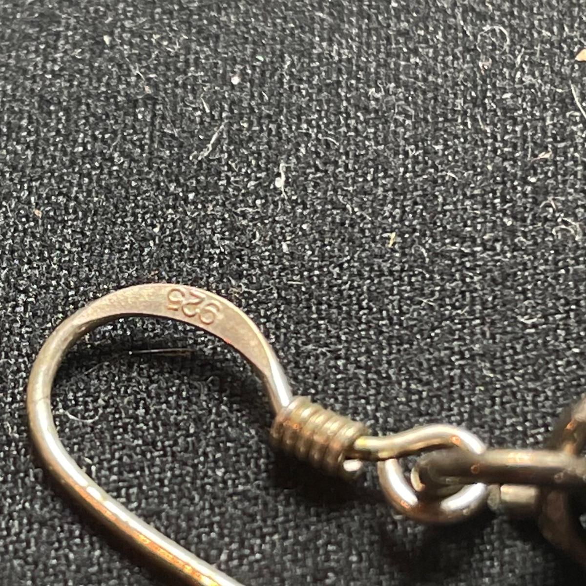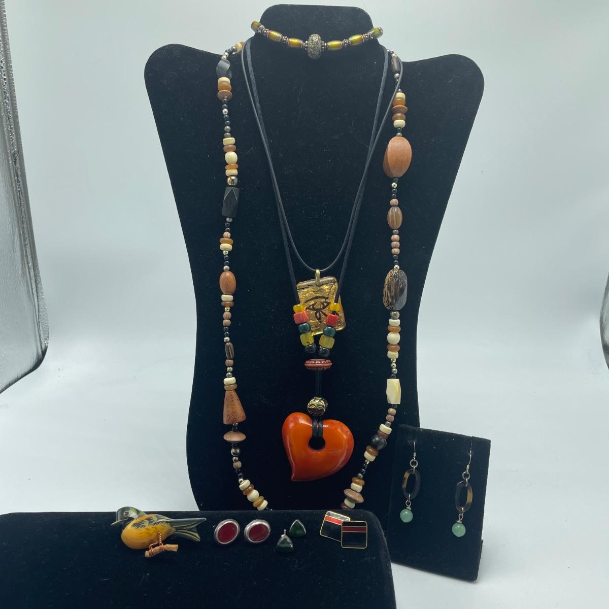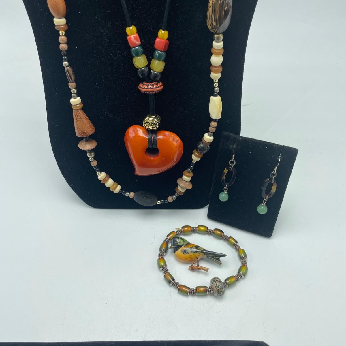 Four out of five of these pairs of earrings (for pierced ears) are marked 925. Square earrings are not. Also included is an adorable bird shaped brooch that is wooden with copper wire legs, three necklaces and a bead/stone bracelet that has some elastic in the band. One necklace is all stones/beads, the other two have corded chains. Longest necklace measures 30”.