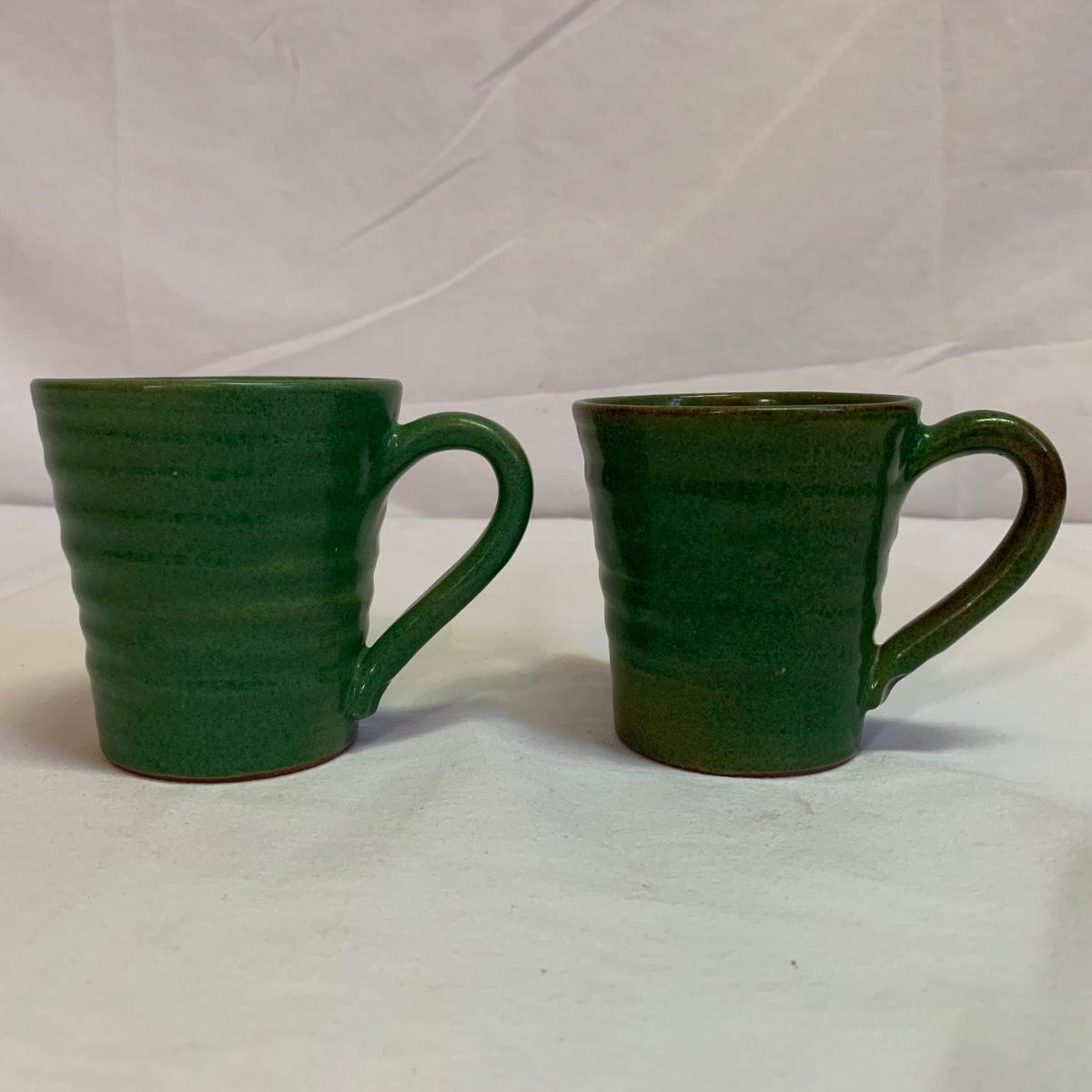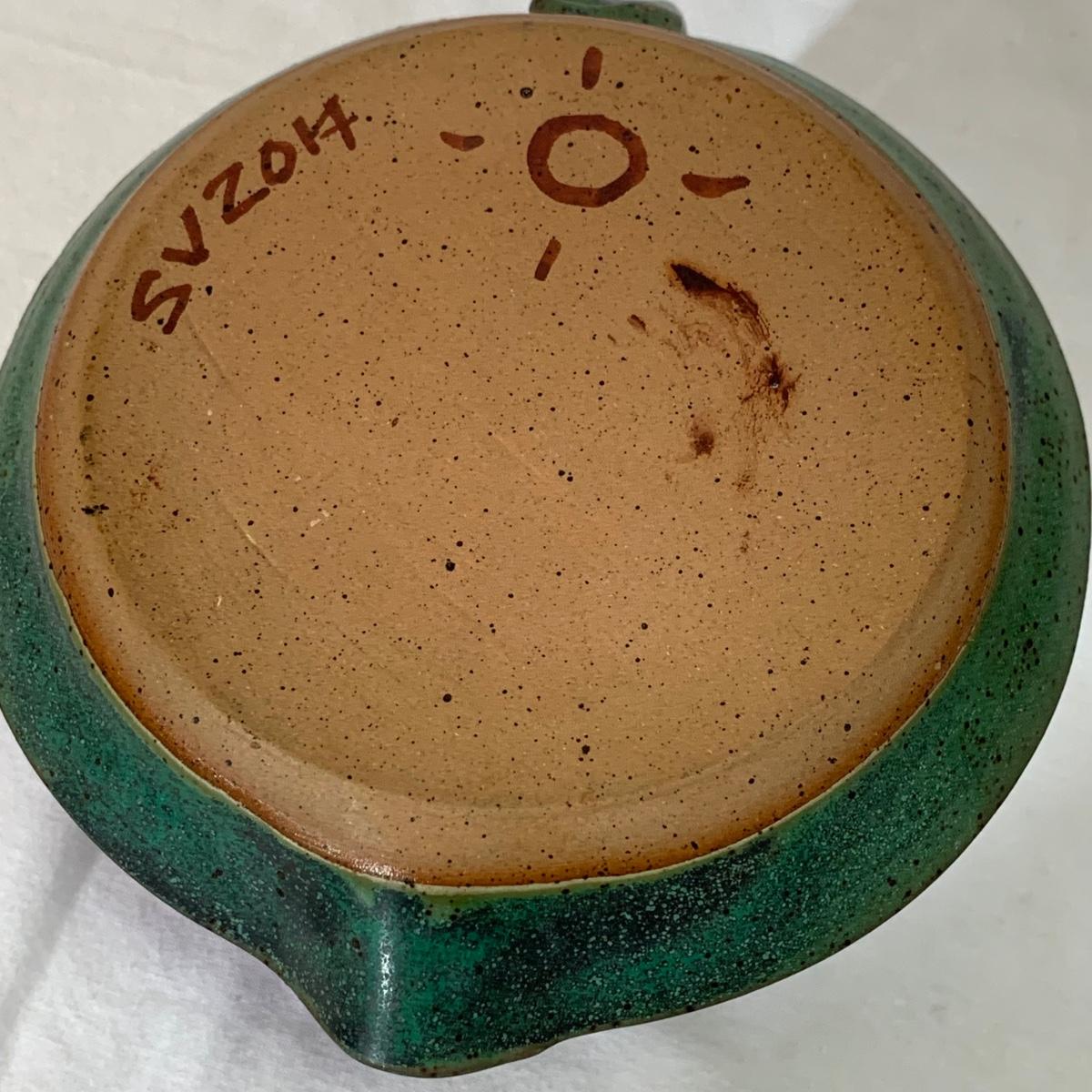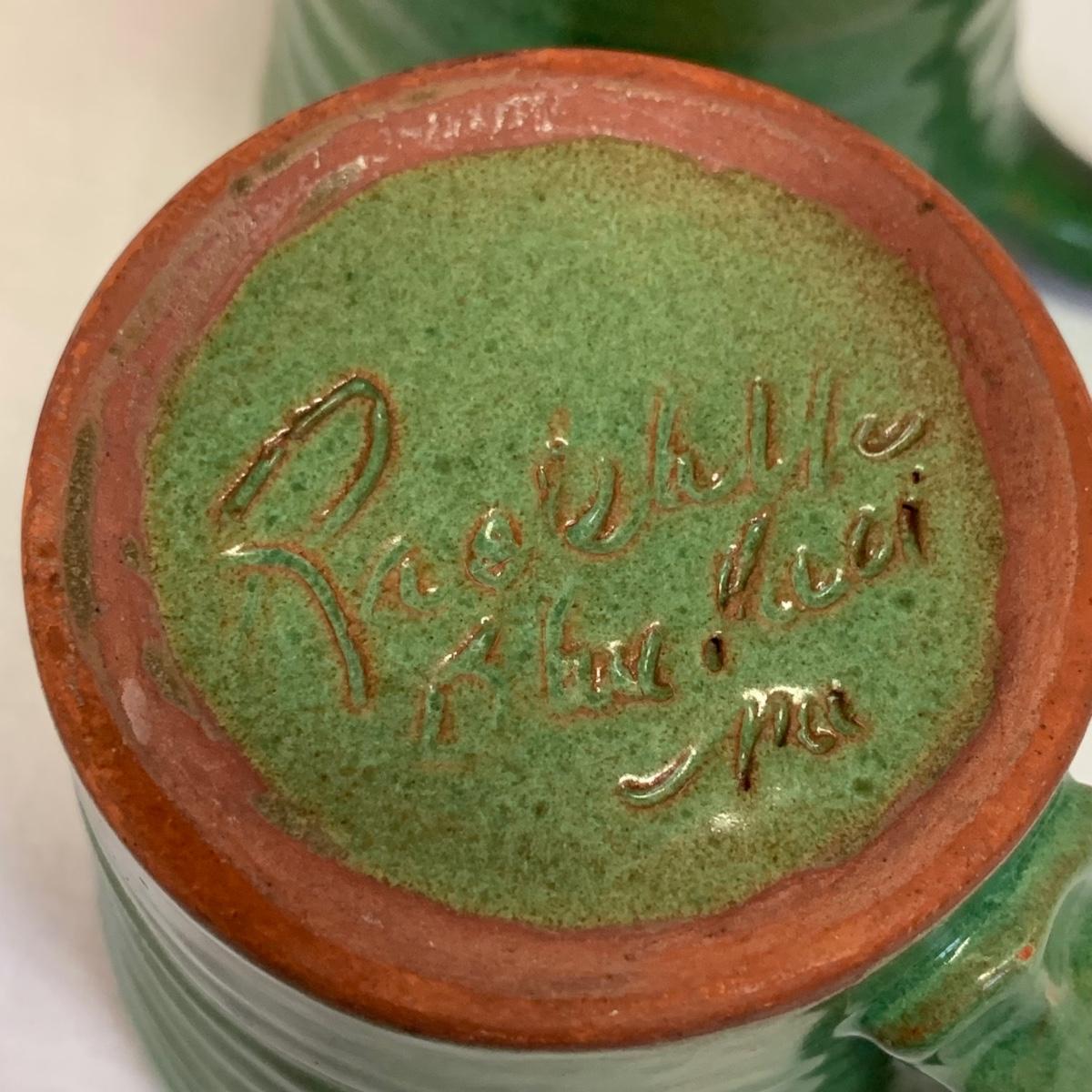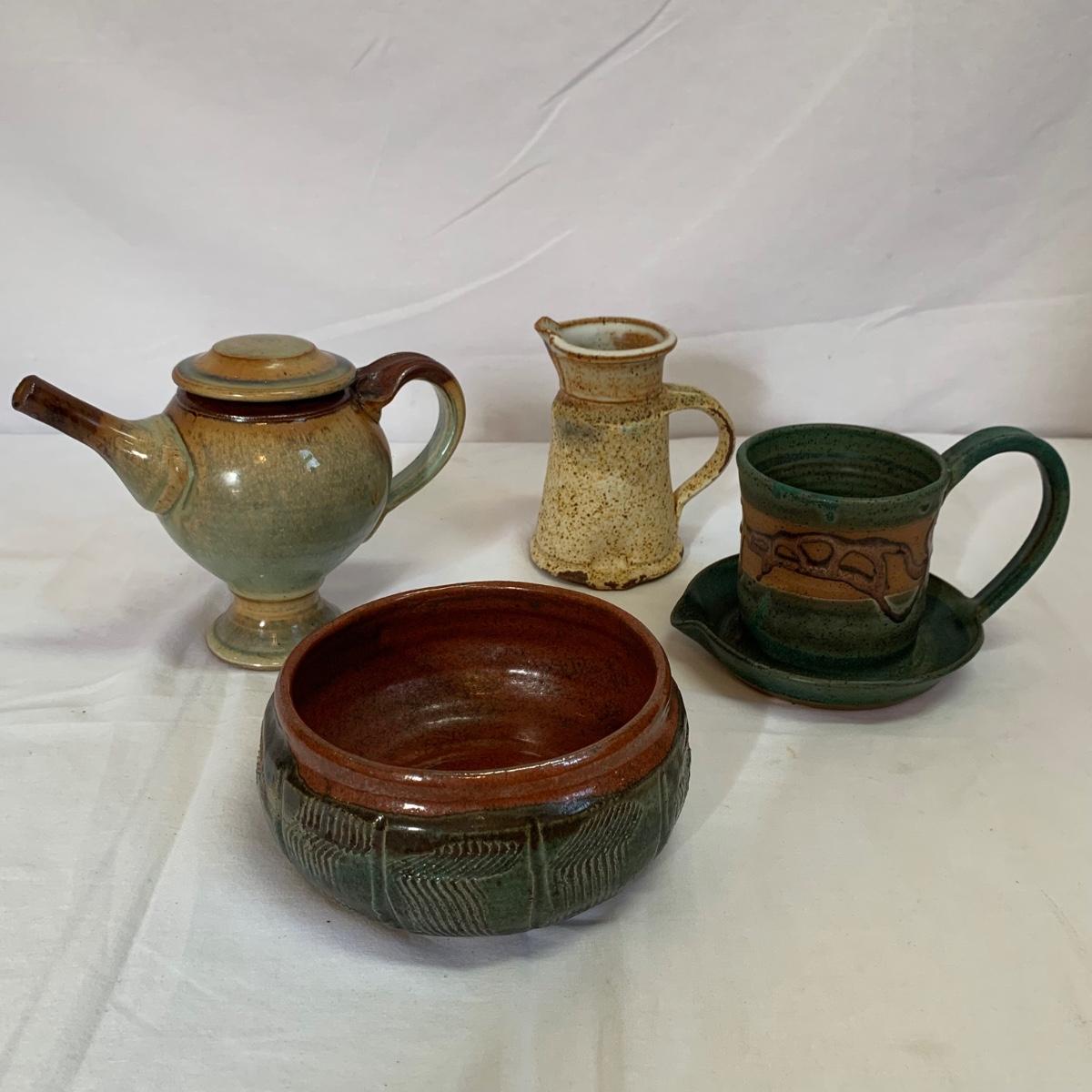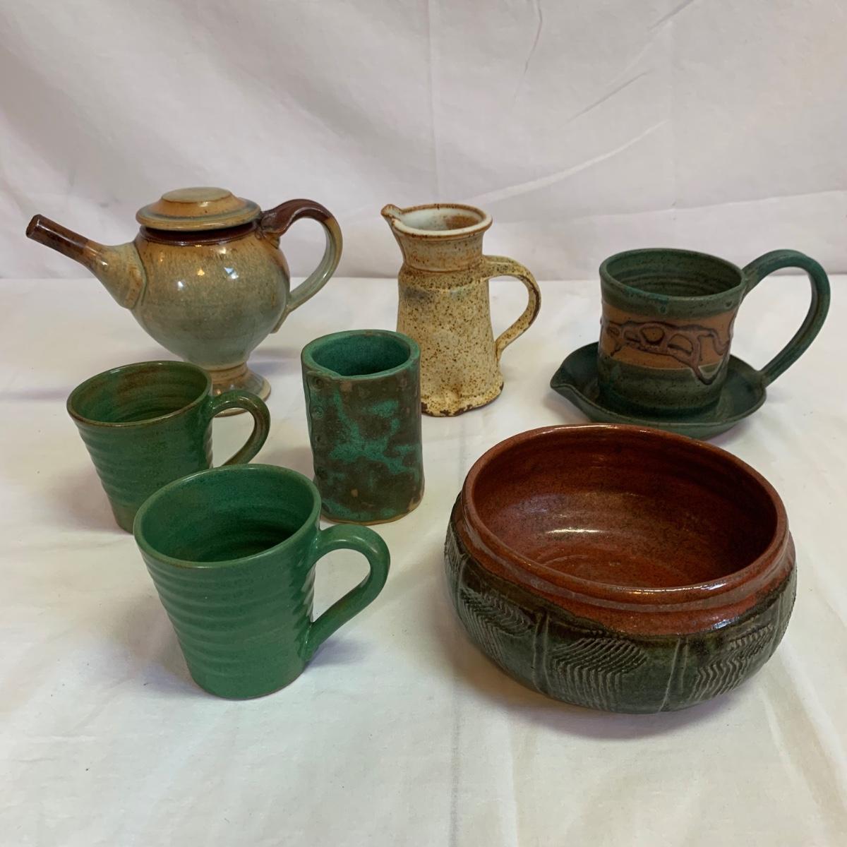 A collection of seven pieces of handmade pottery. There are two matching green mugs, a cylindrical green vessel, a teapot, a pitcher, a bowl, and a bacon cooker. All but one of the pieces (green cylinder) are signed or marked by the artist. For reference, the bowl is approximately 7”D x 3.25”H. The pitcher has some cracks at the base that don’t appear to affect its integrity (might just be cracks in the glaze); it also has a small spot of purple paint.