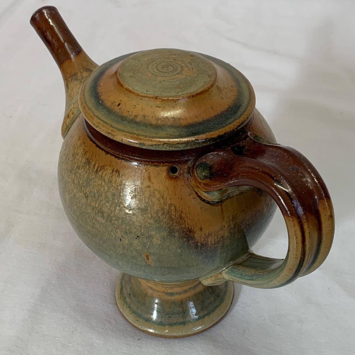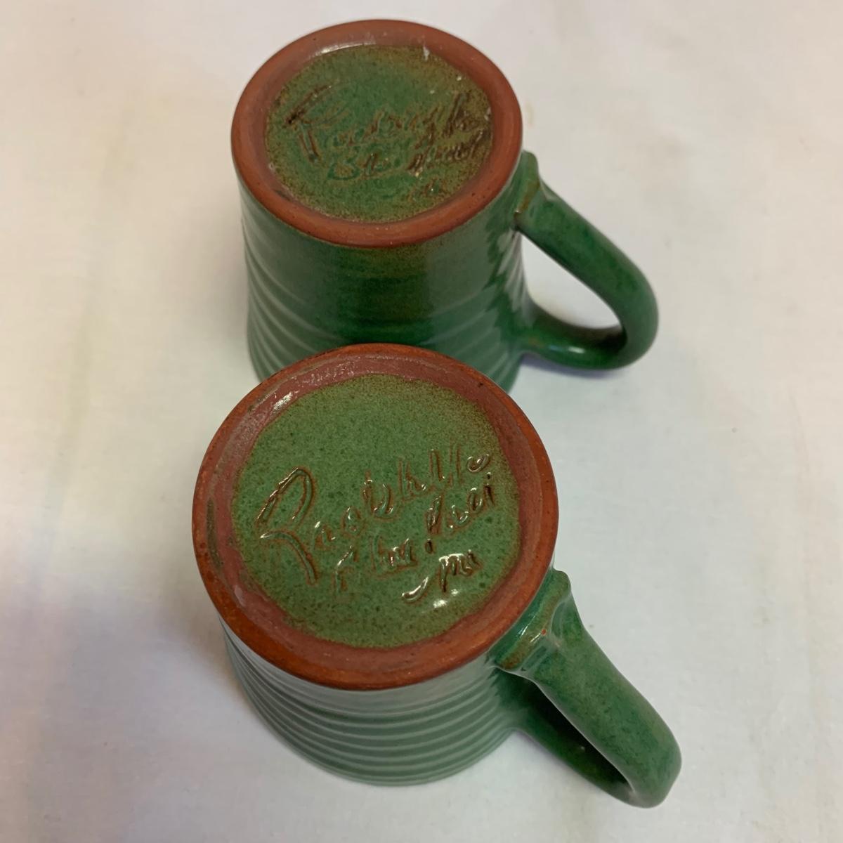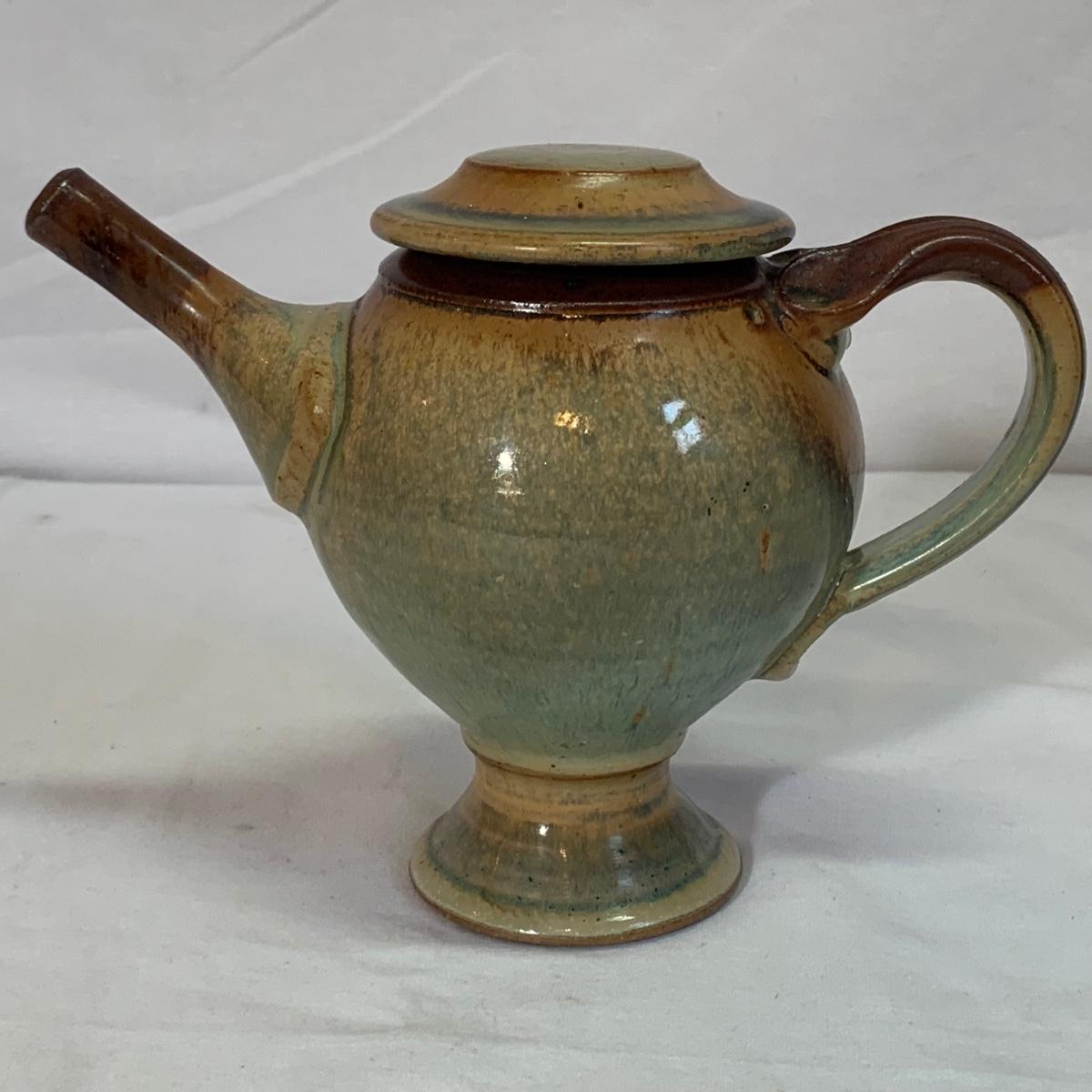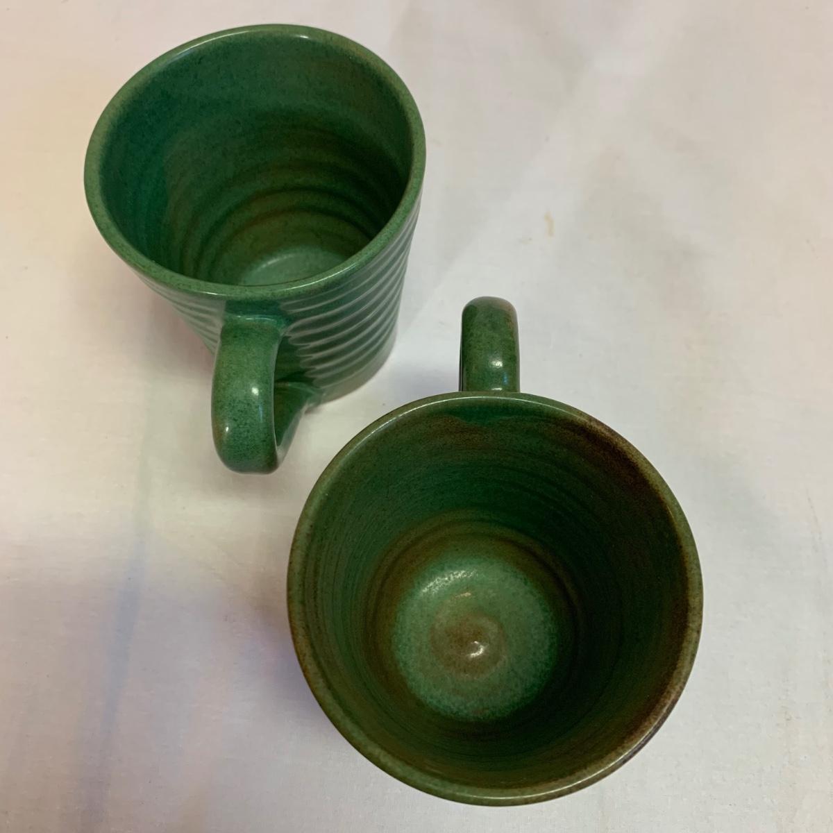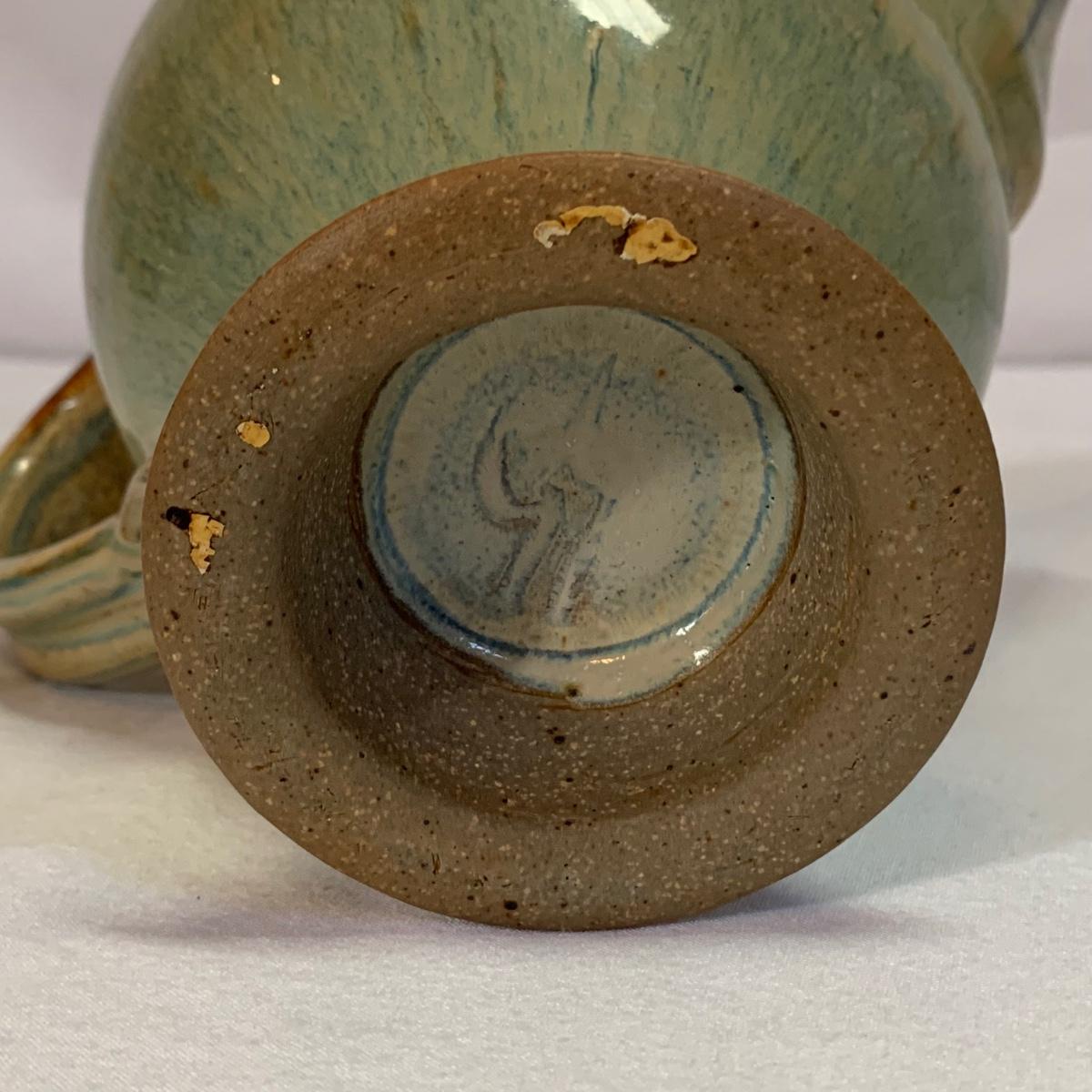 A collection of seven pieces of handmade pottery. There are two matching green mugs, a cylindrical green vessel, a teapot, a pitcher, a bowl, and a bacon cooker. All but one of the pieces (green cylinder) are signed or marked by the artist. For reference, the bowl is approximately 7”D x 3.25”H. The pitcher has some cracks at the base that don’t appear to affect its integrity (might just be cracks in the glaze); it also has a small spot of purple paint.
