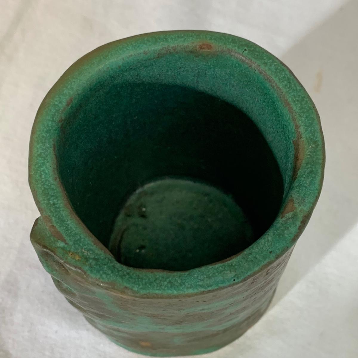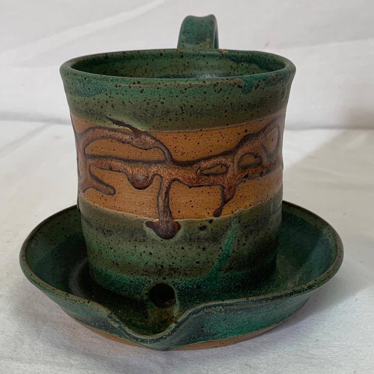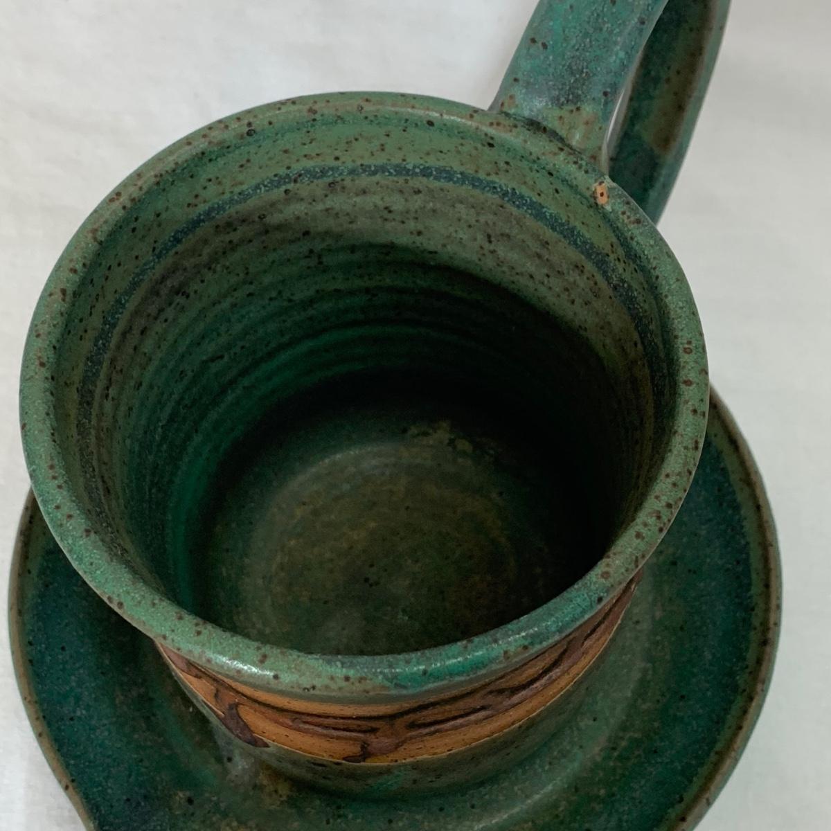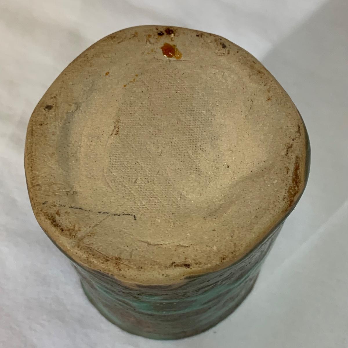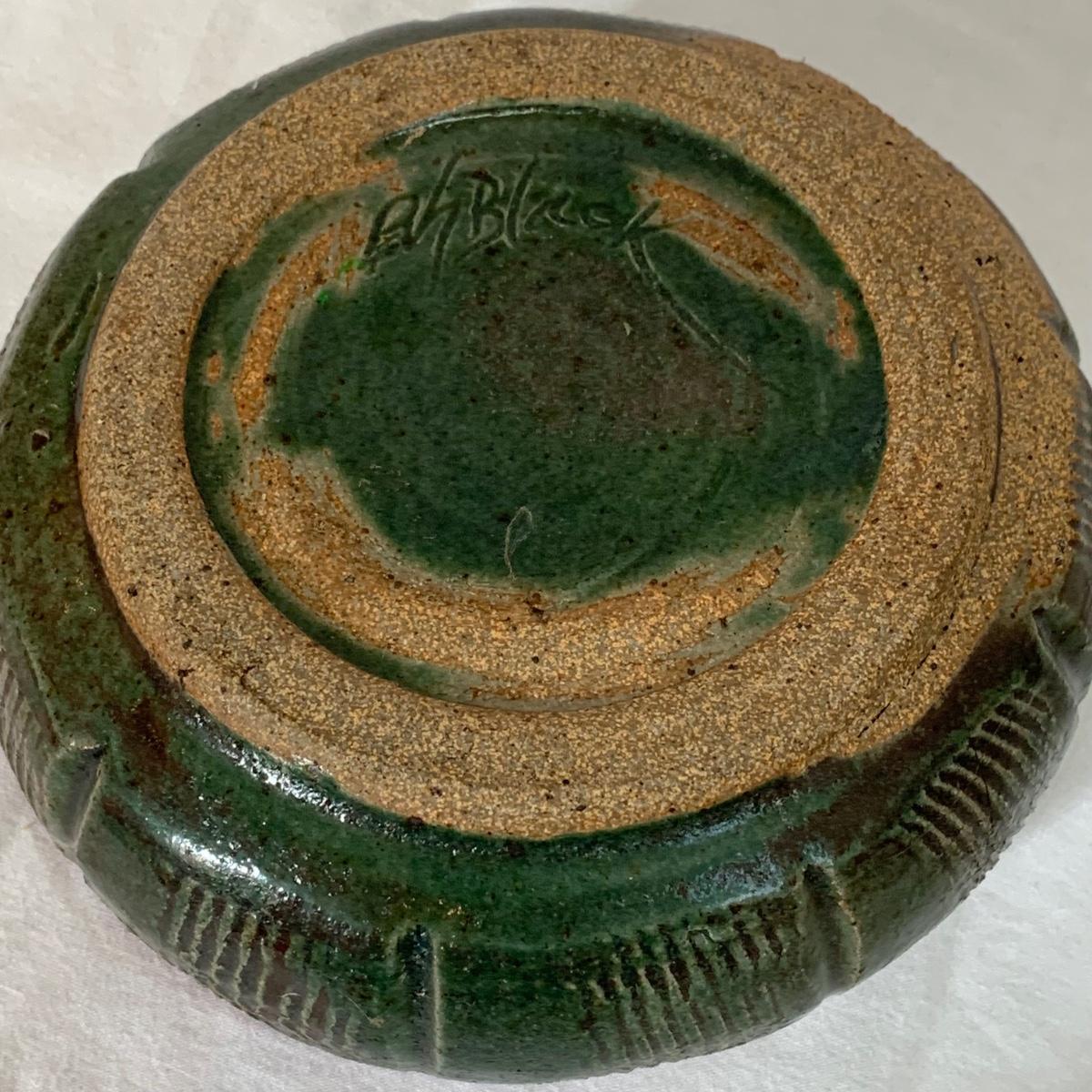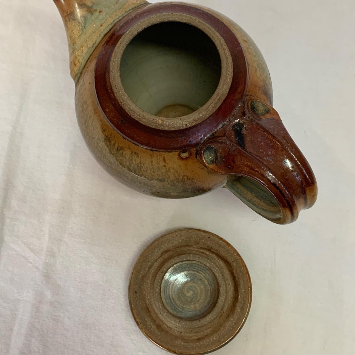 A collection of seven pieces of handmade pottery. There are two matching green mugs, a cylindrical green vessel, a teapot, a pitcher, a bowl, and a bacon cooker. All but one of the pieces (green cylinder) are signed or marked by the artist. For reference, the bowl is approximately 7”D x 3.25”H. The pitcher has some cracks at the base that don’t appear to affect its integrity (might just be cracks in the glaze); it also has a small spot of purple paint.