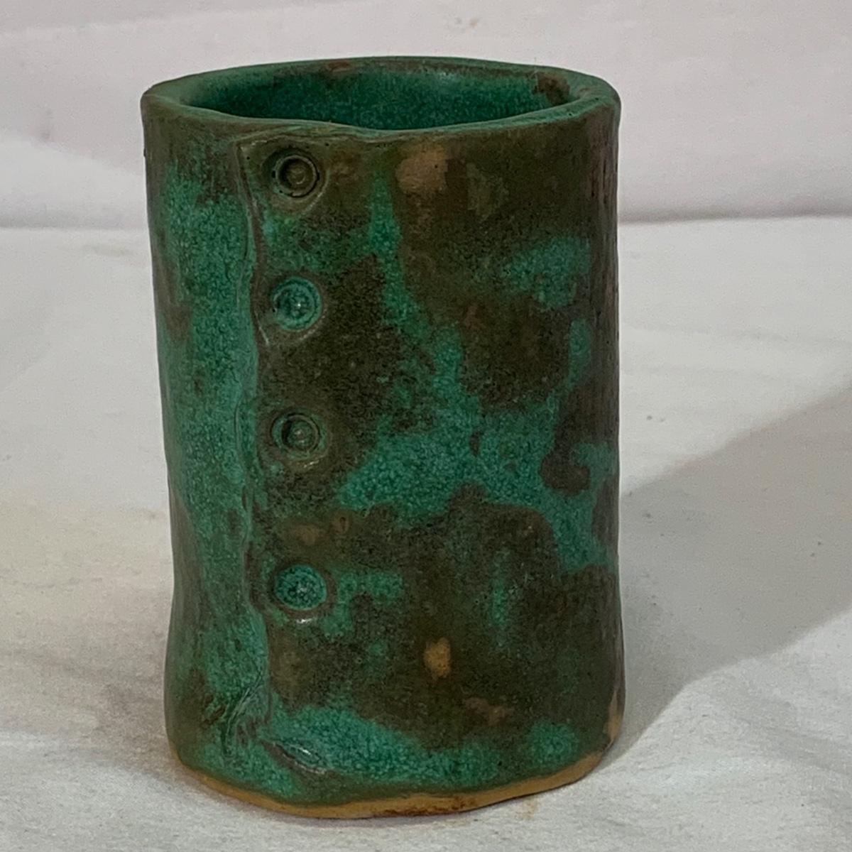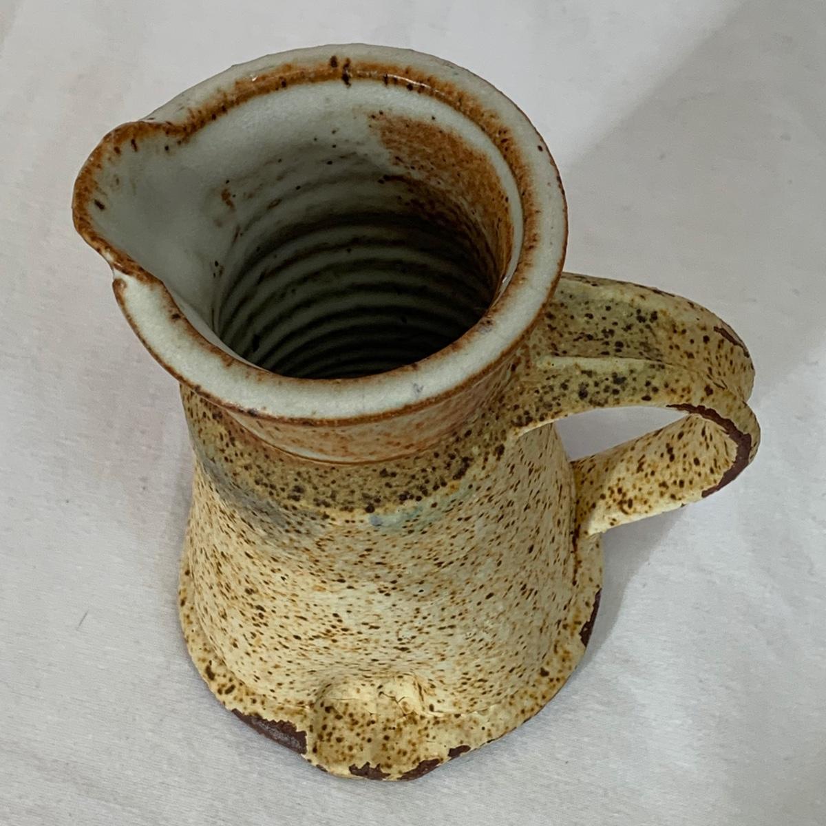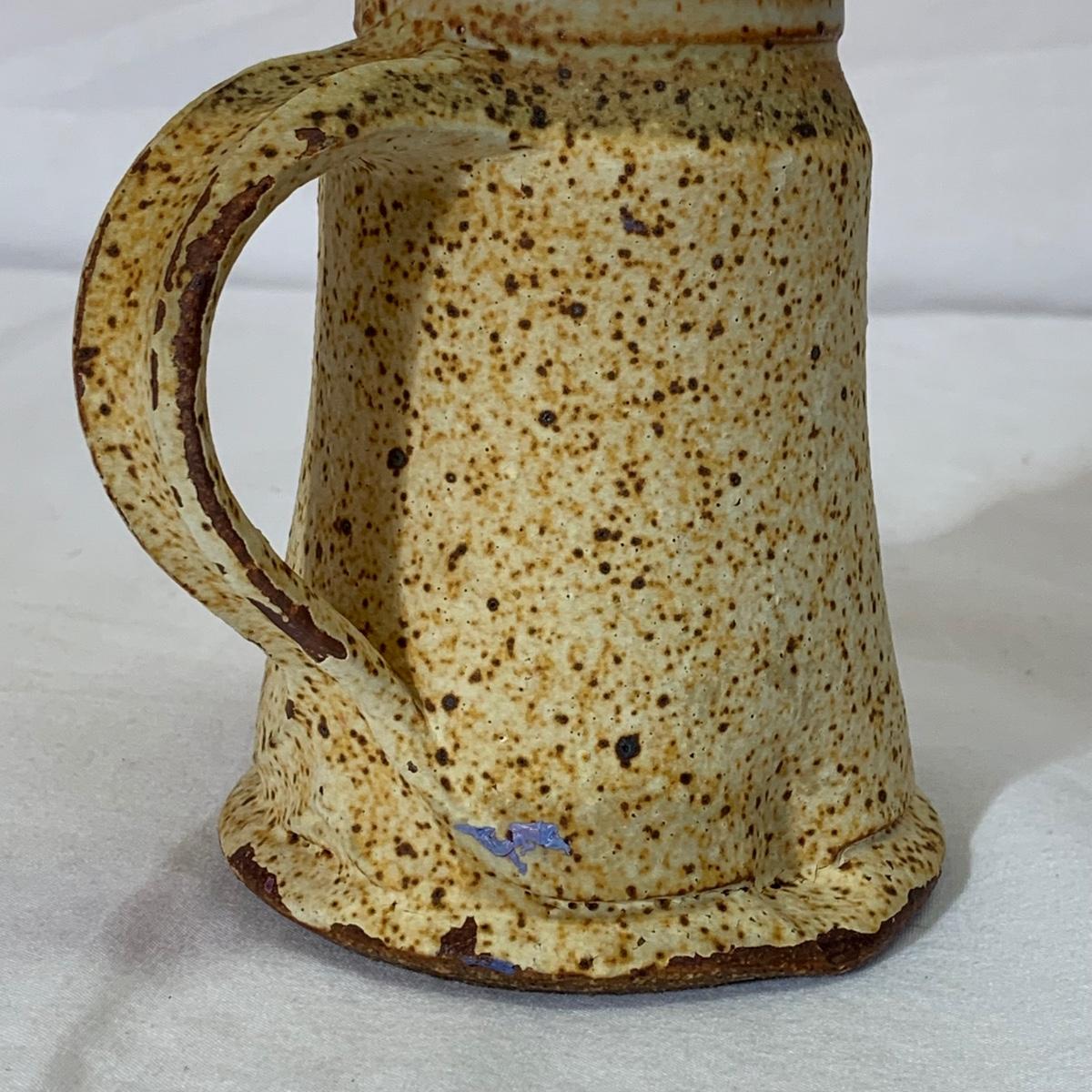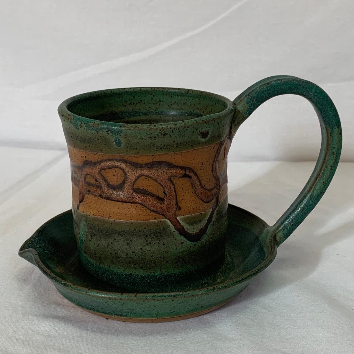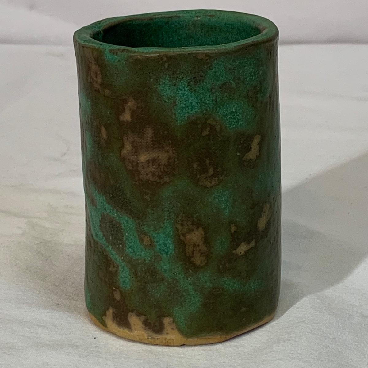 A collection of seven pieces of handmade pottery. There are two matching green mugs, a cylindrical green vessel, a teapot, a pitcher, a bowl, and a bacon cooker. All but one of the pieces (green cylinder) are signed or marked by the artist. For reference, the bowl is approximately 7”D x 3.25”H. The pitcher has some cracks at the base that don’t appear to affect its integrity (might just be cracks in the glaze); it also has a small spot of purple paint.