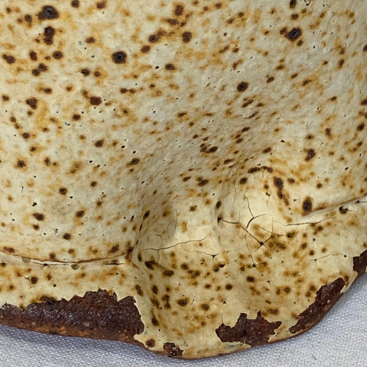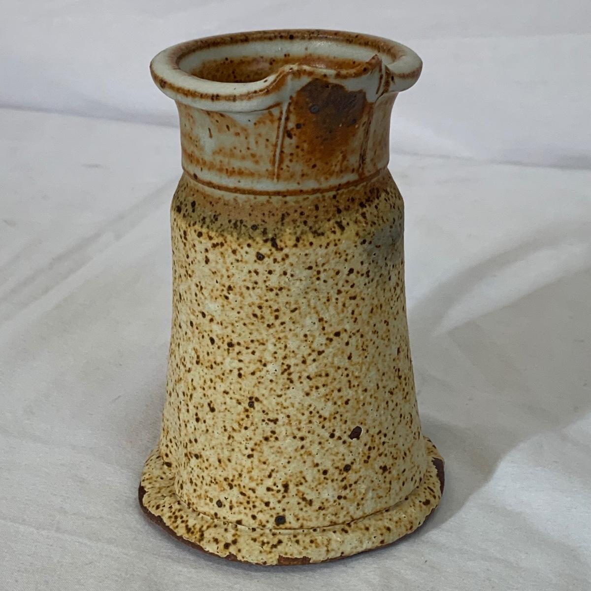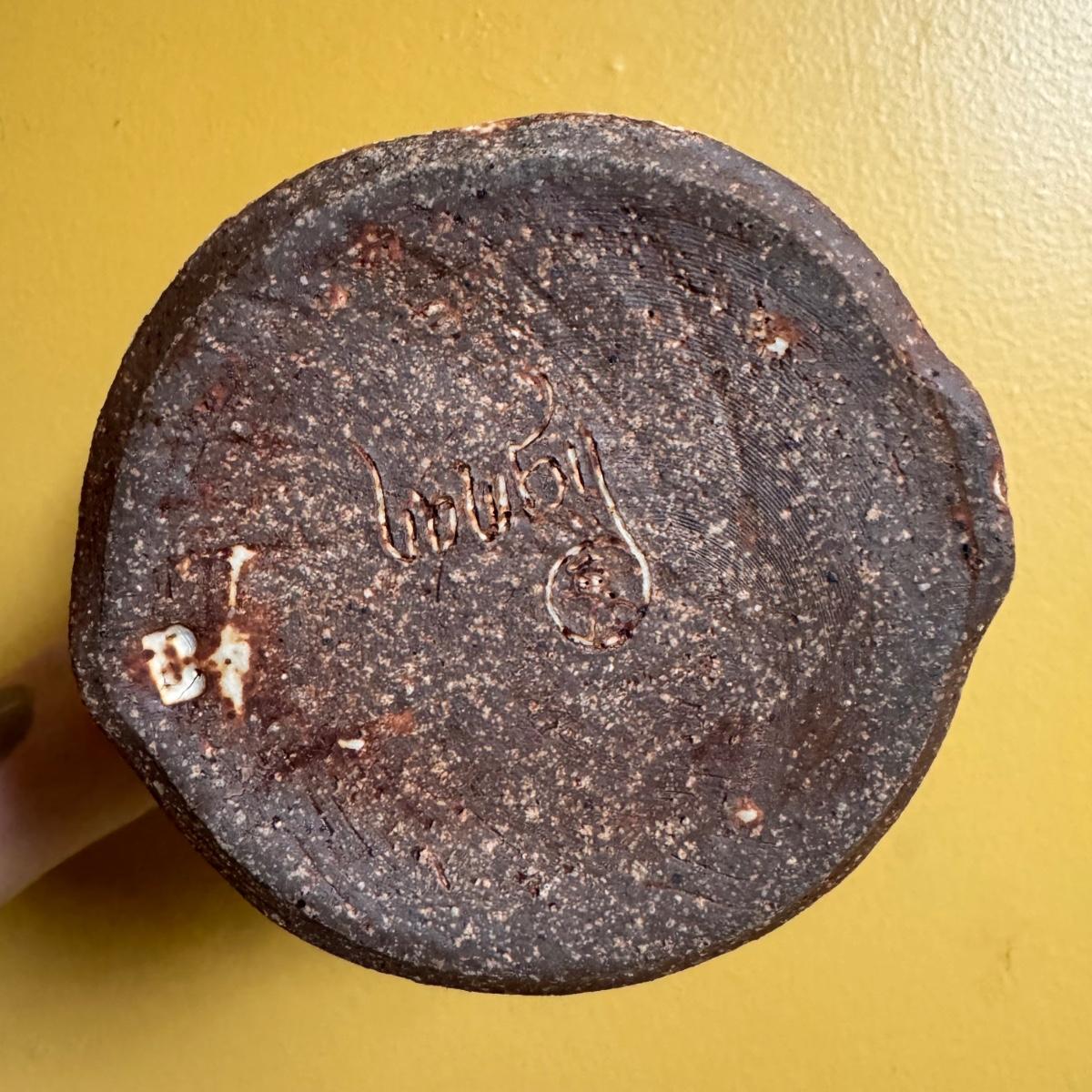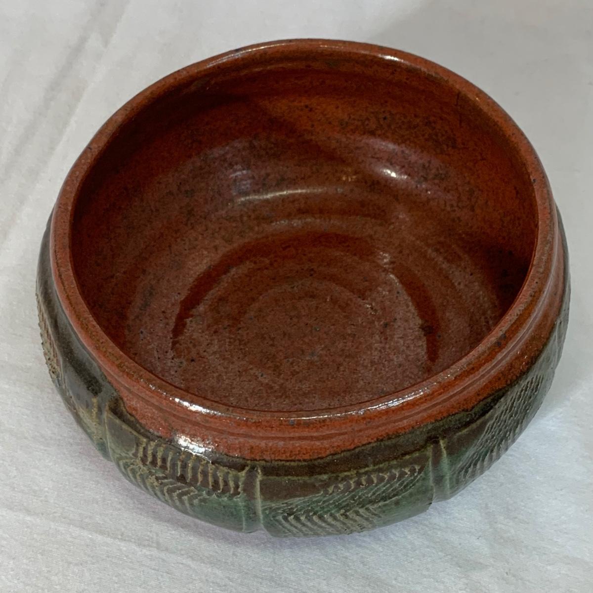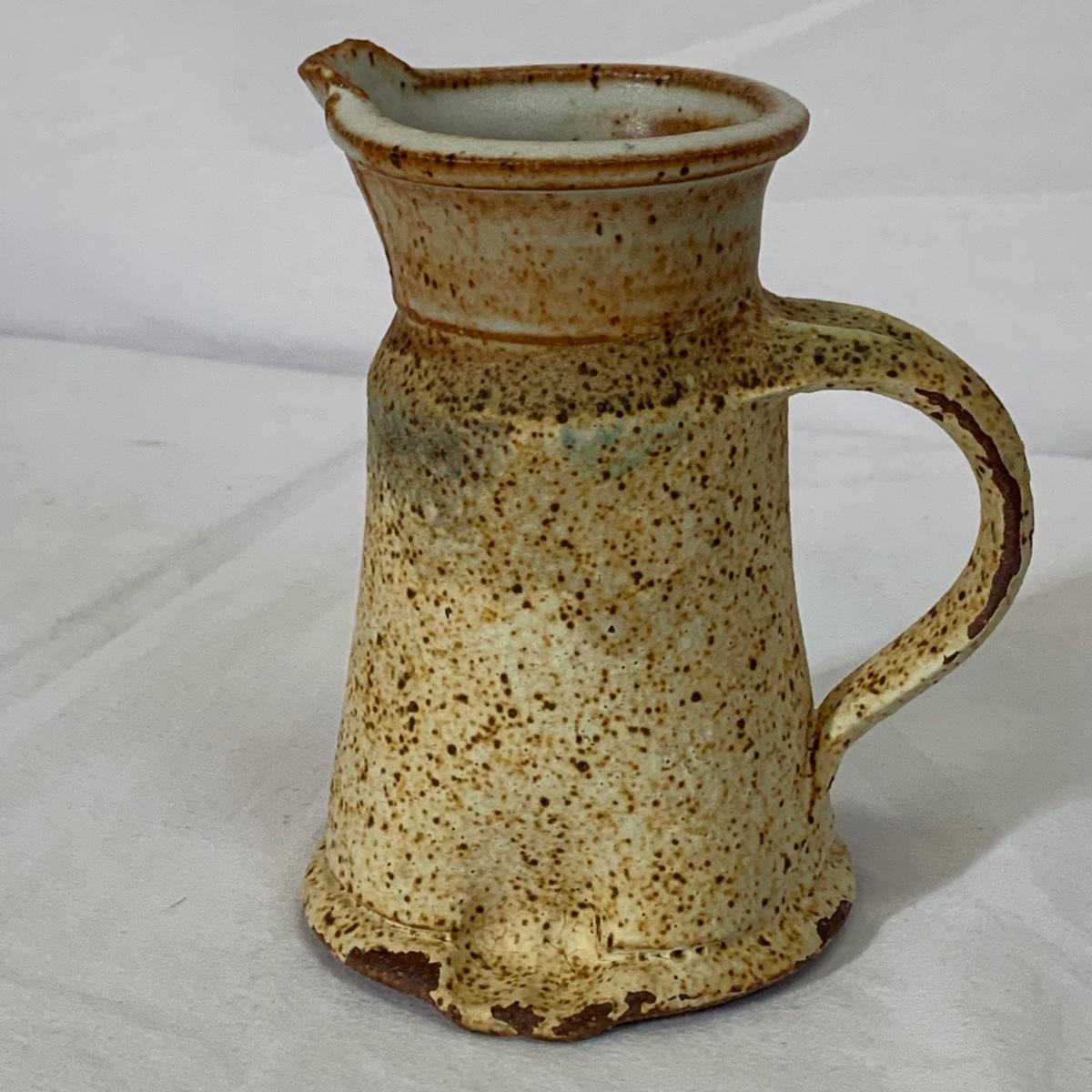 A collection of seven pieces of handmade pottery. There are two matching green mugs, a cylindrical green vessel, a teapot, a pitcher, a bowl, and a bacon cooker. All but one of the pieces (green cylinder) are signed or marked by the artist. For reference, the bowl is approximately 7”D x 3.25”H. The pitcher has some cracks at the base that don’t appear to affect its integrity (might just be cracks in the glaze); it also has a small spot of purple paint.