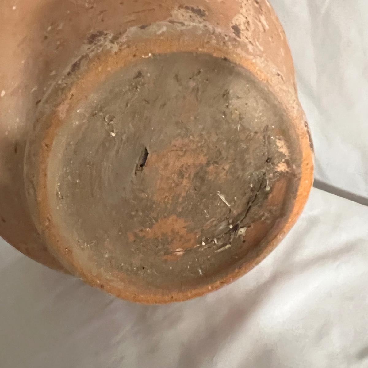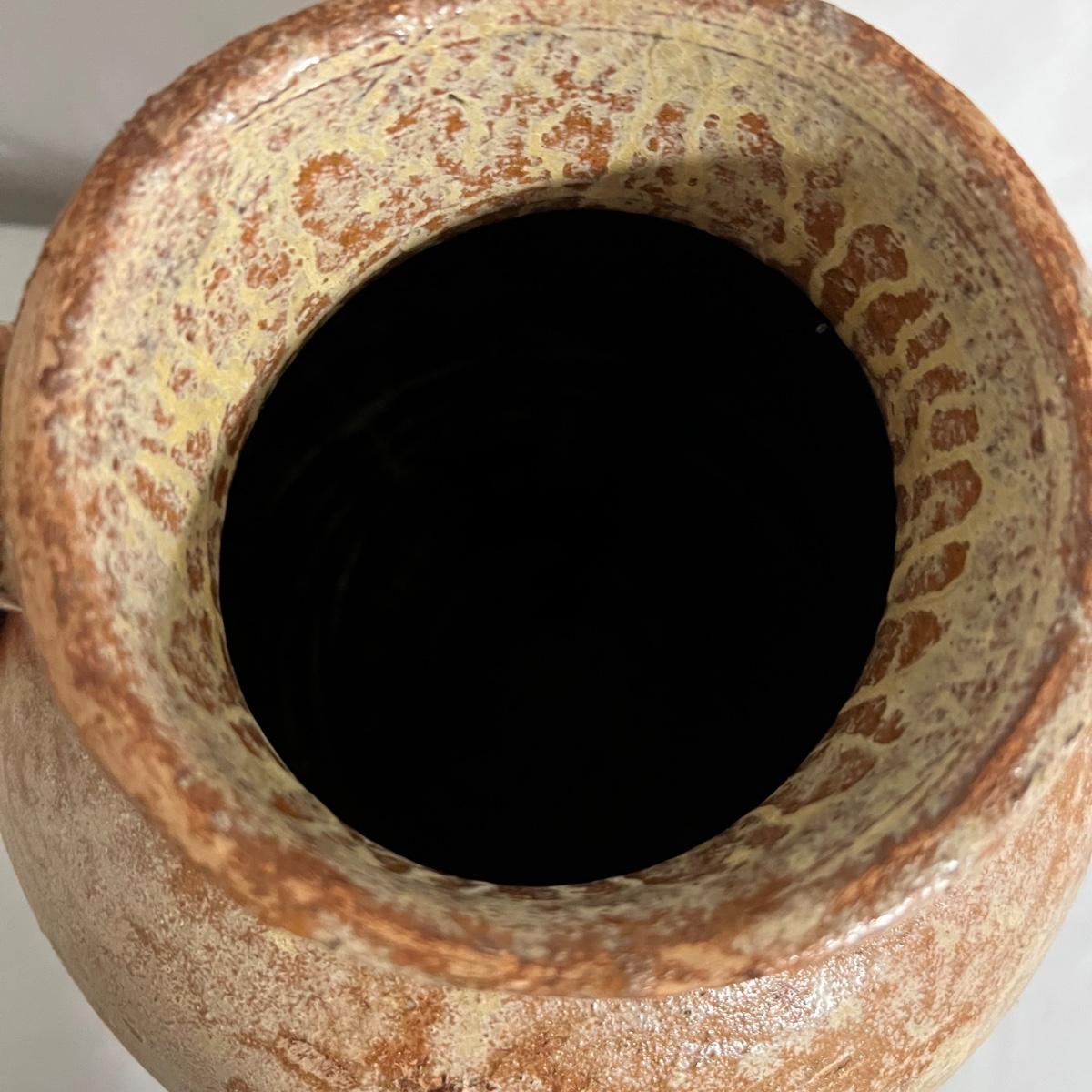 Attractive earthenware pot has a glazed upper portion with the lower section left unglazed. Has two handles.