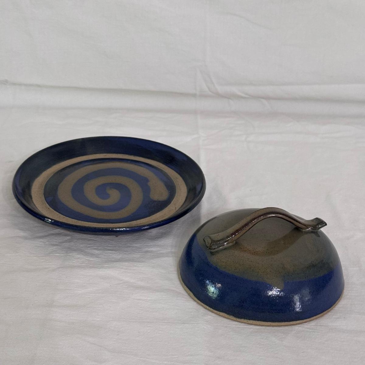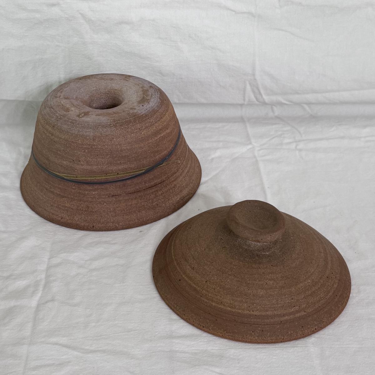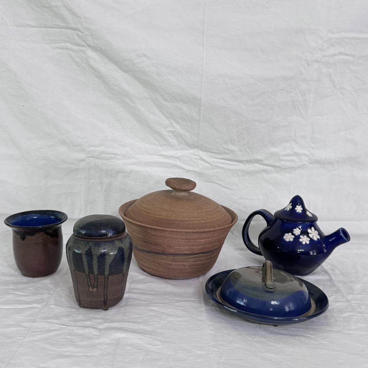 This lot includes five pieces of pottery in earth-tones. You’ll find one teapot with a lid, one Bundt cake dish with lid, one serving plate with a removable lid, one jar with lid, and one vase. Please see pictures for signatures. The Bundt cake dish measures 9.5”D x 4.5”H. Shipping available.