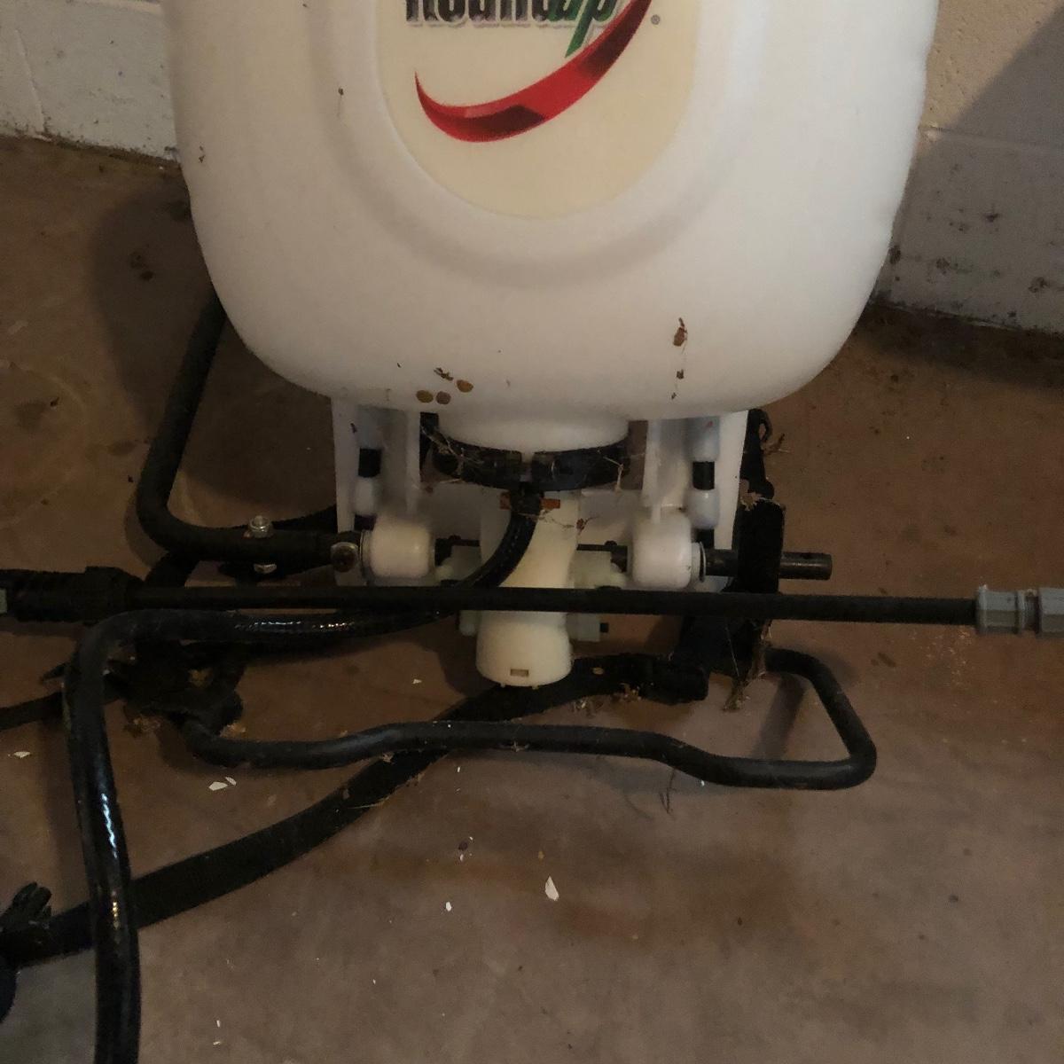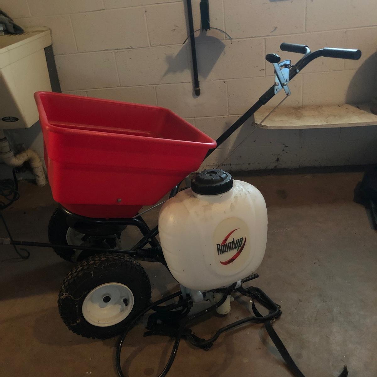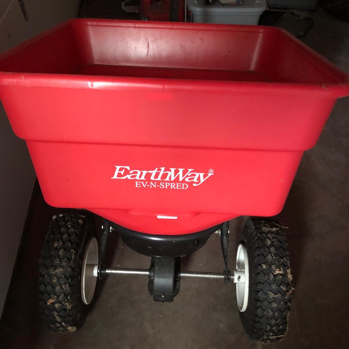 Lot includes a Earthway plastic body spreader with pneumatic tires and a four gallon backpack sprayer. Both items are dusty, but appear to be in good shape.
