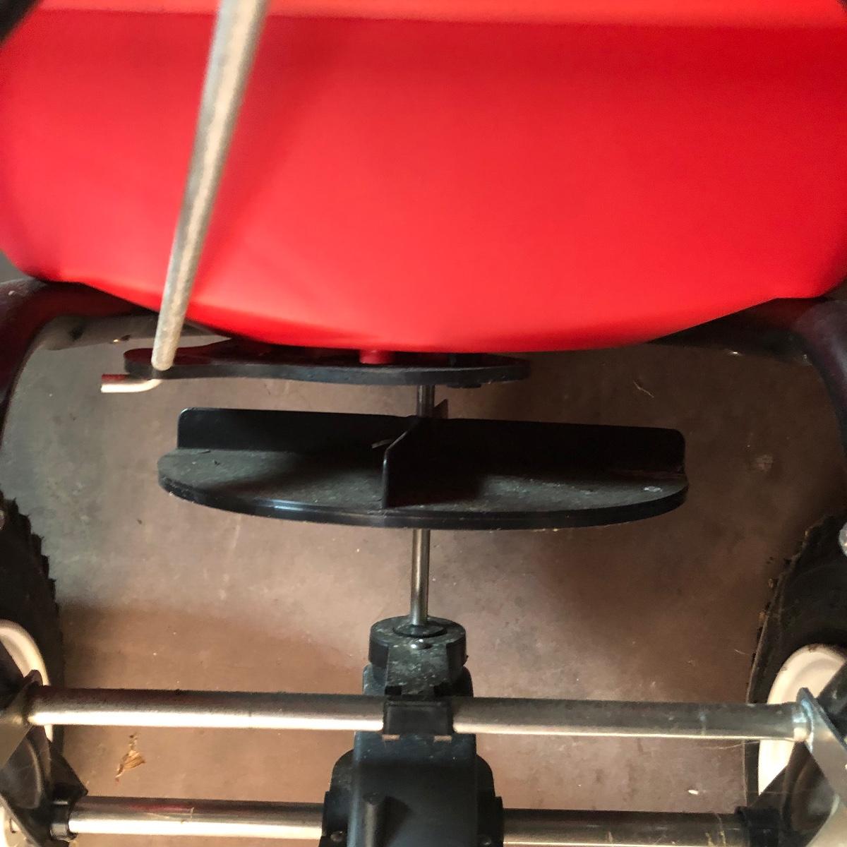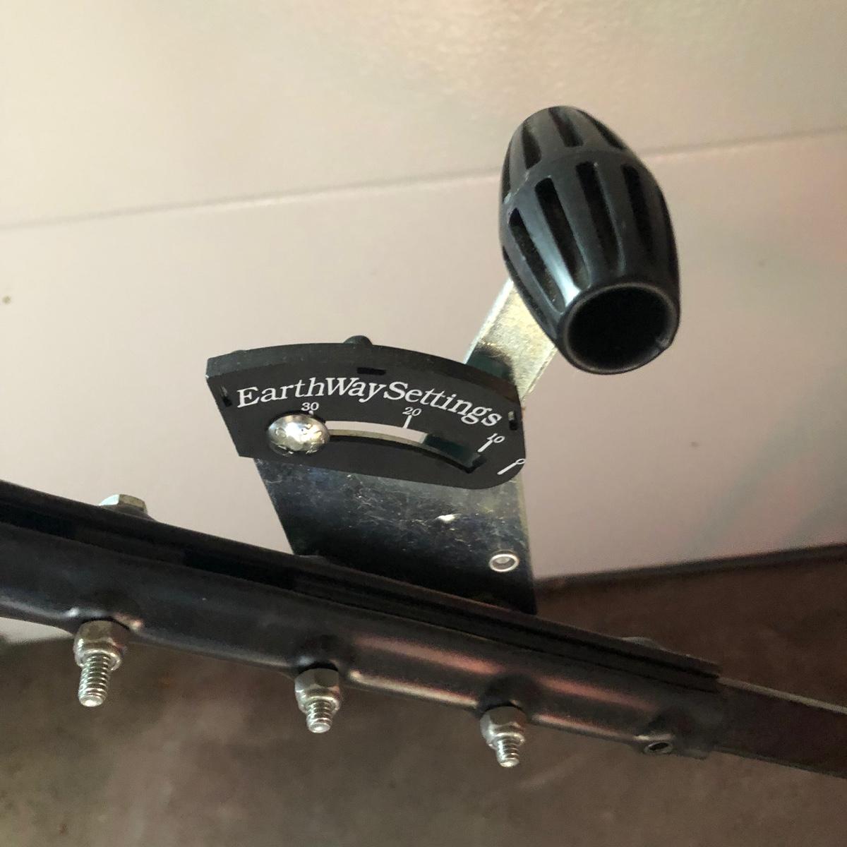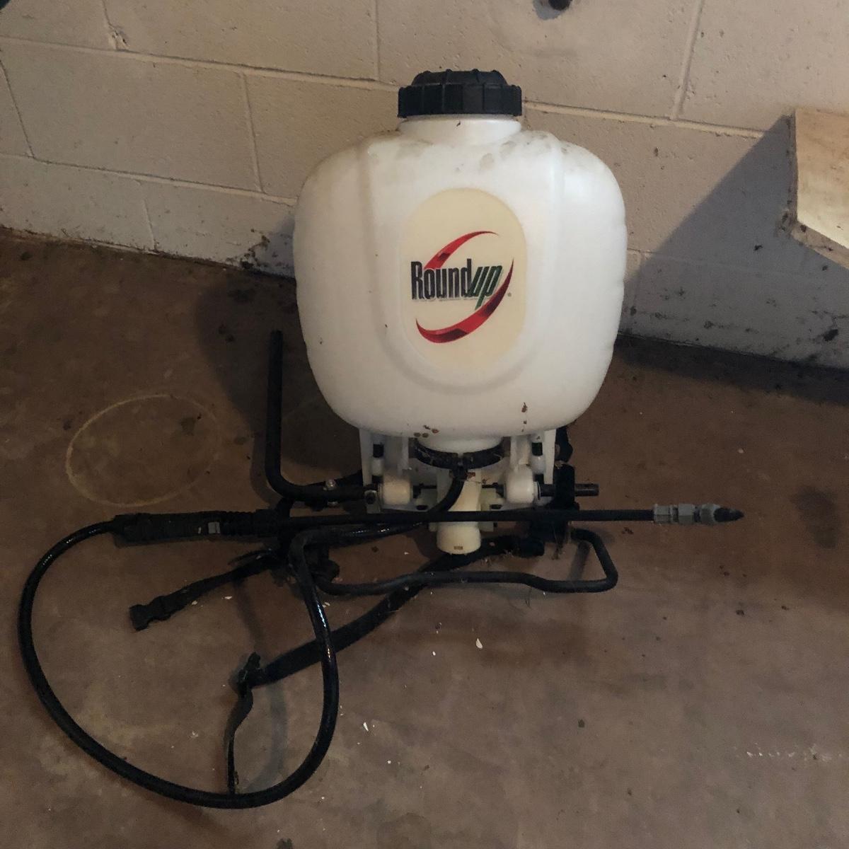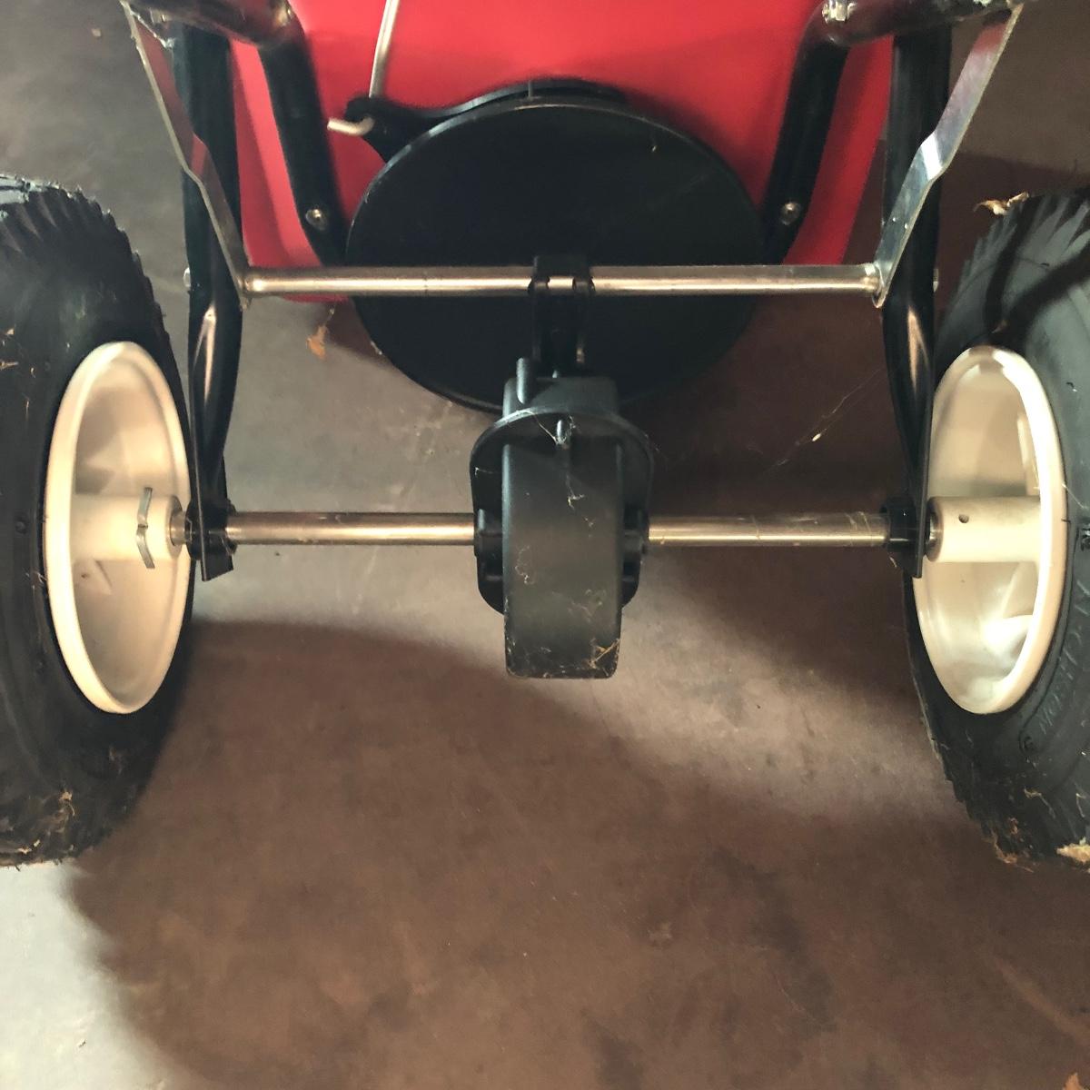 Lot includes a Earthway plastic body spreader with pneumatic tires and a four gallon backpack sprayer. Both items are dusty, but appear to be in good shape.
