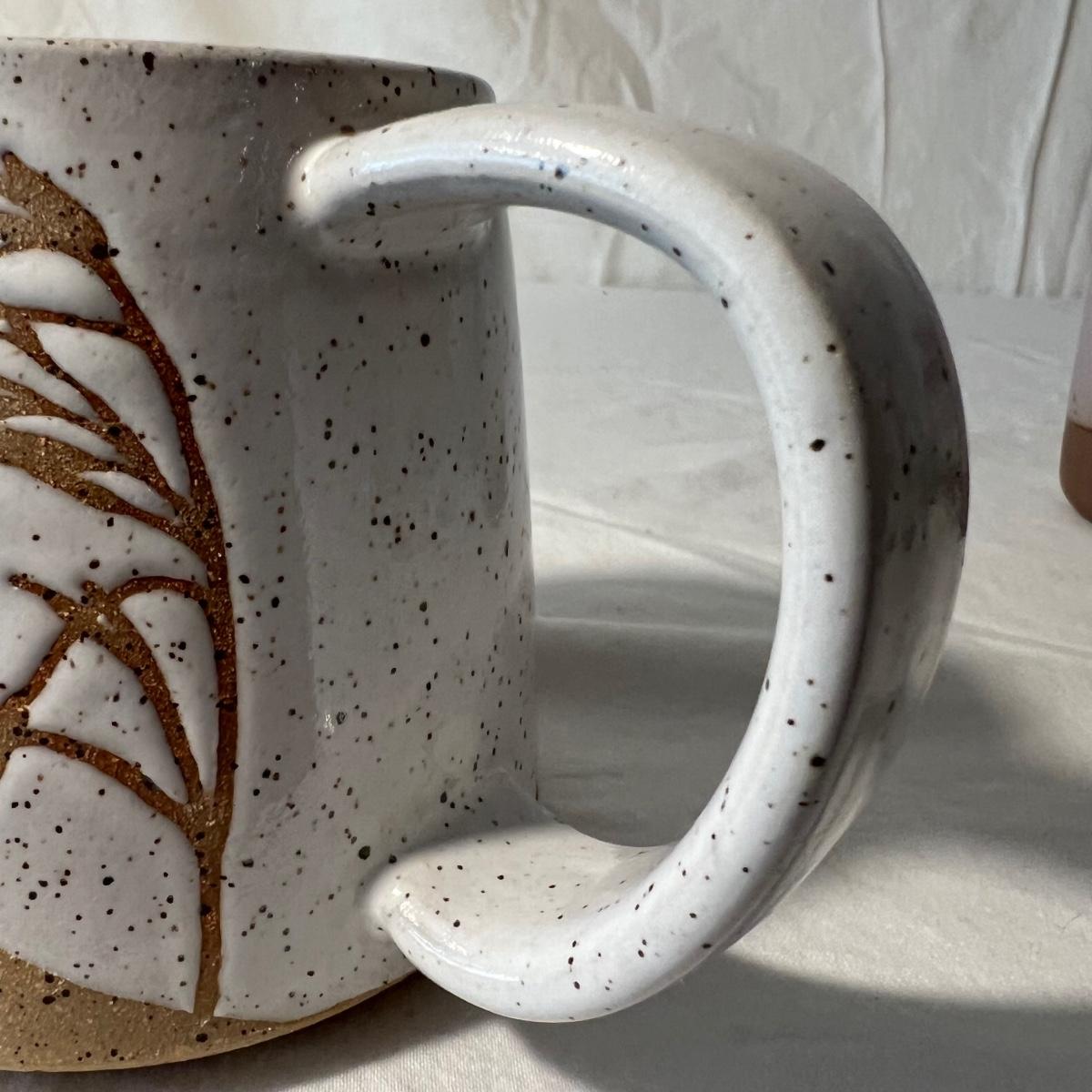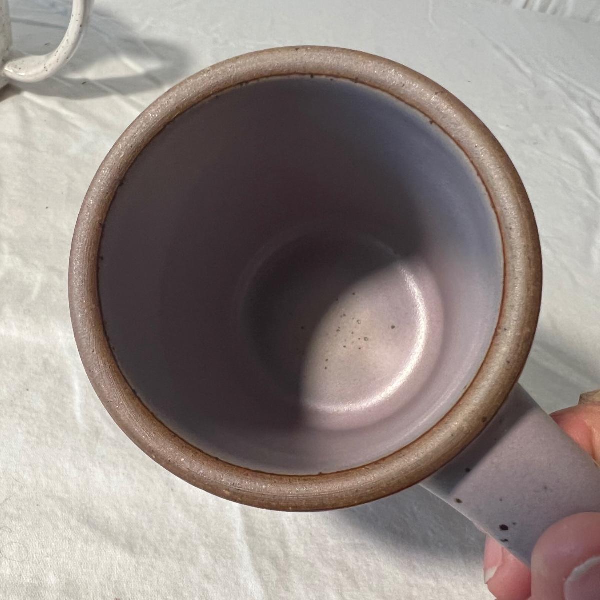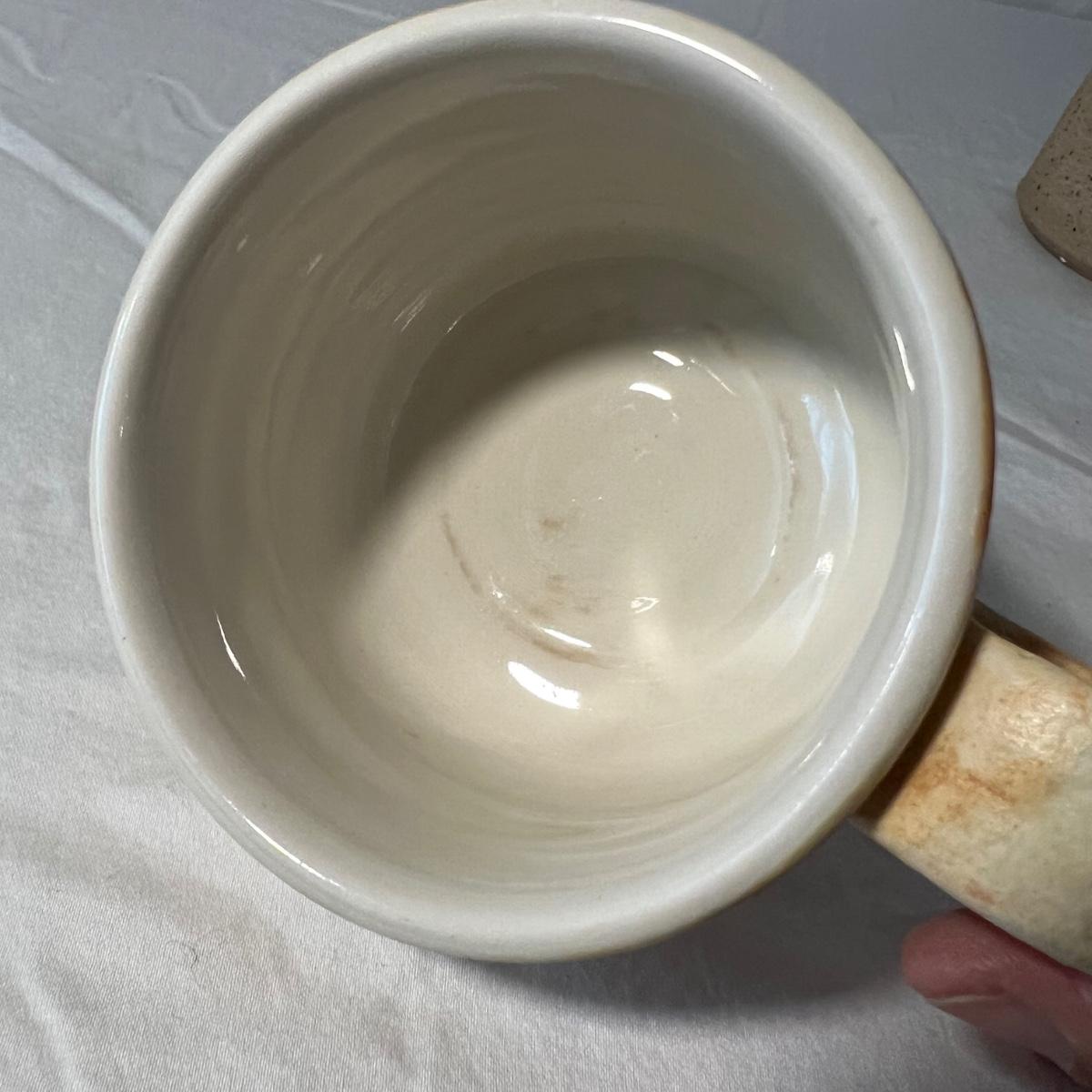 Three quality stoneware mugs that includes local Asheville - East Fork Pottery mug that measures 3” D x 4”H. It has a light purple glaze that appear to be Taro. The smallest mug is signed Myra Hage. It has some dark marks on the inside that might be light stains. The largest, generously sized mug with tree design