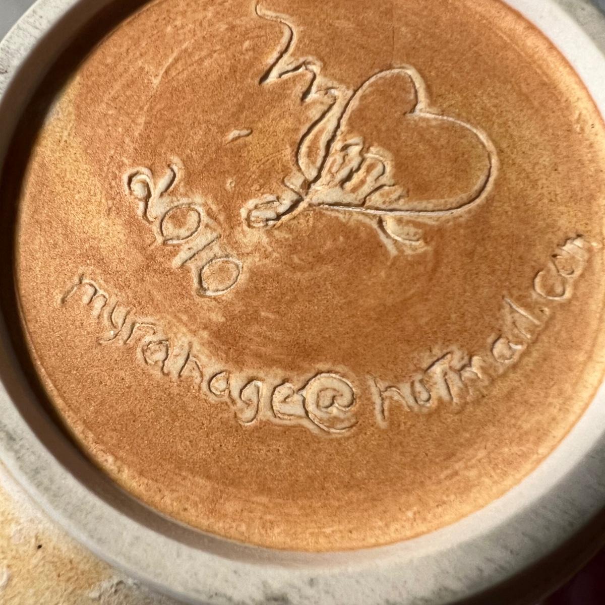 measures 4”D x 4”H; it has a tiny glaze drop on its base. Shipping Available
