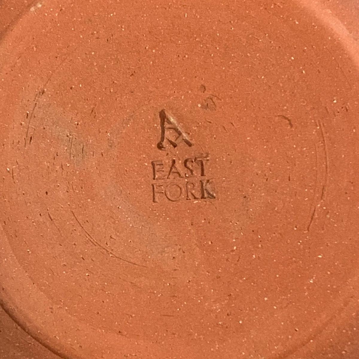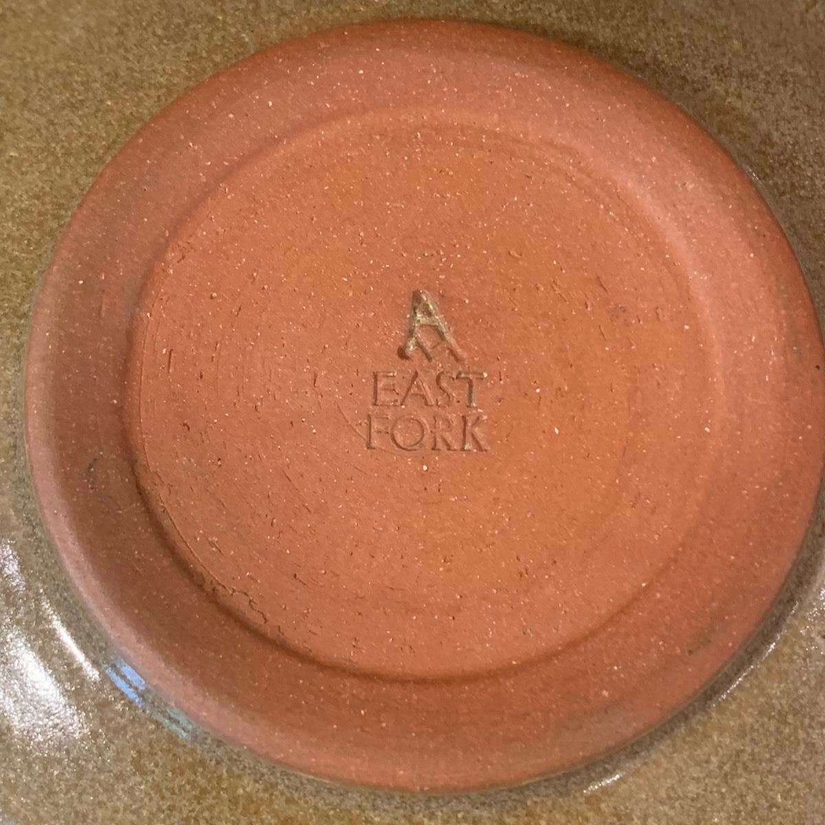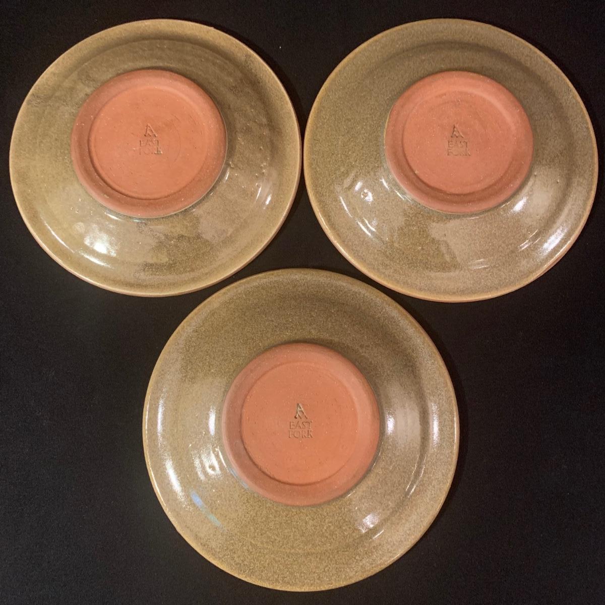 This lot includes original pieces by local artist Alex Matisse. Each piece is hand thrown, wood-kiln fired, and stamped, “AM East Fork." This is the personal stamp of lead potter and founder Alex Matisse of East Fork Pottery used circa 2011-2014. Lot includes three salad plates and three dinner plates. Salad plates measure, 9”D x 1.25”H and dinner plates measure, 11”D x 1.5”H.