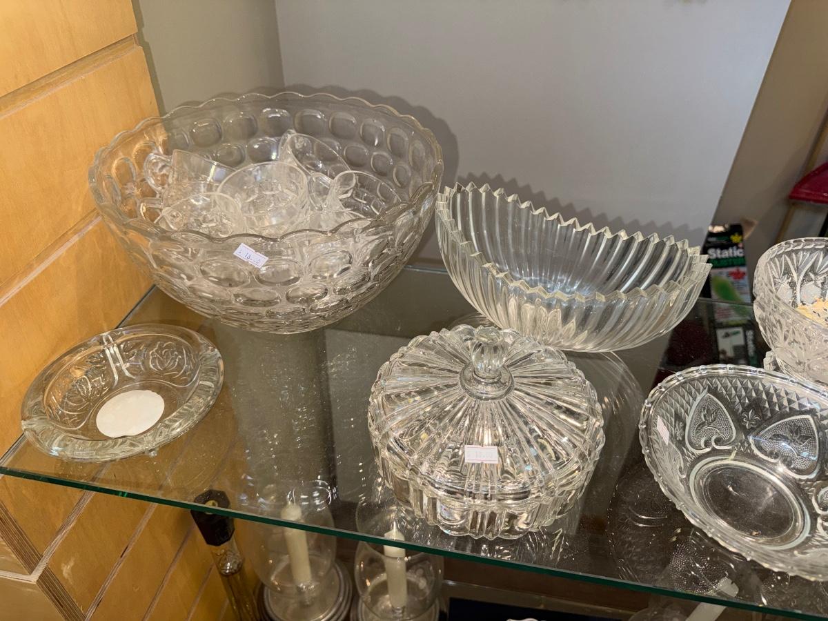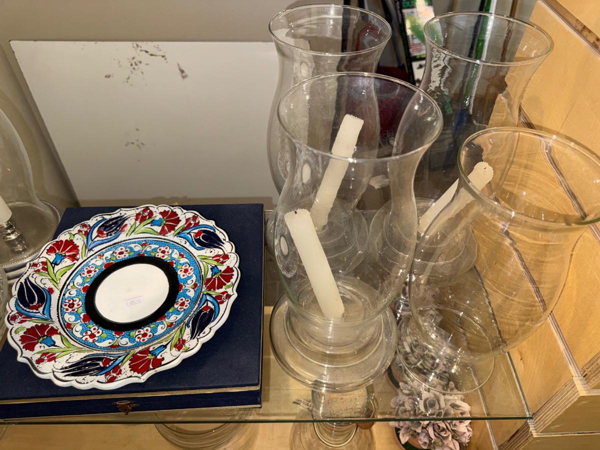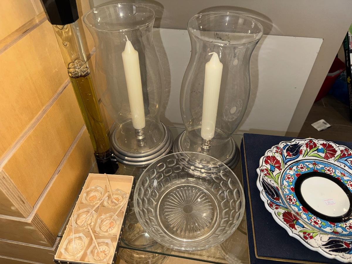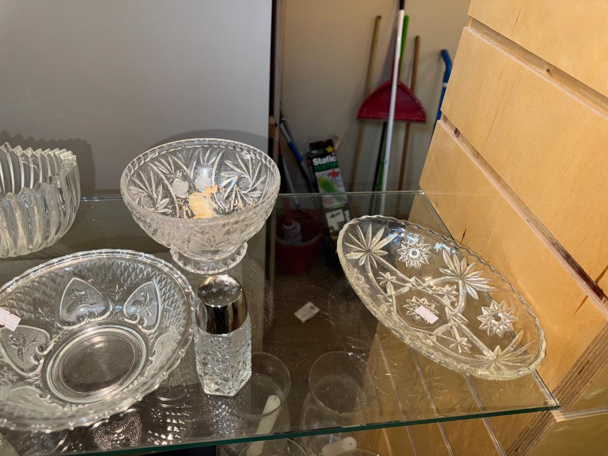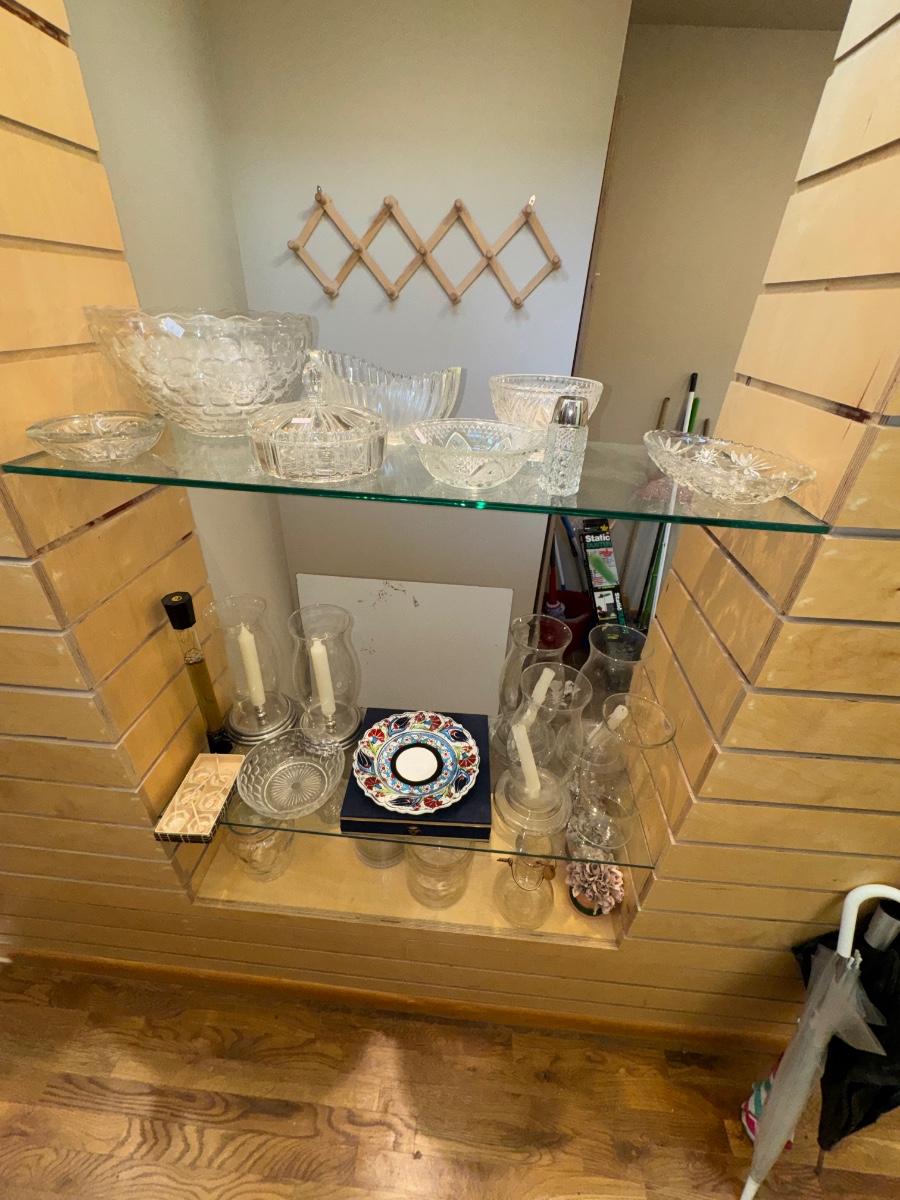 EAST HALLWAY SHELVE LOT - CRYSTAL, HAND PAINTED PLATE