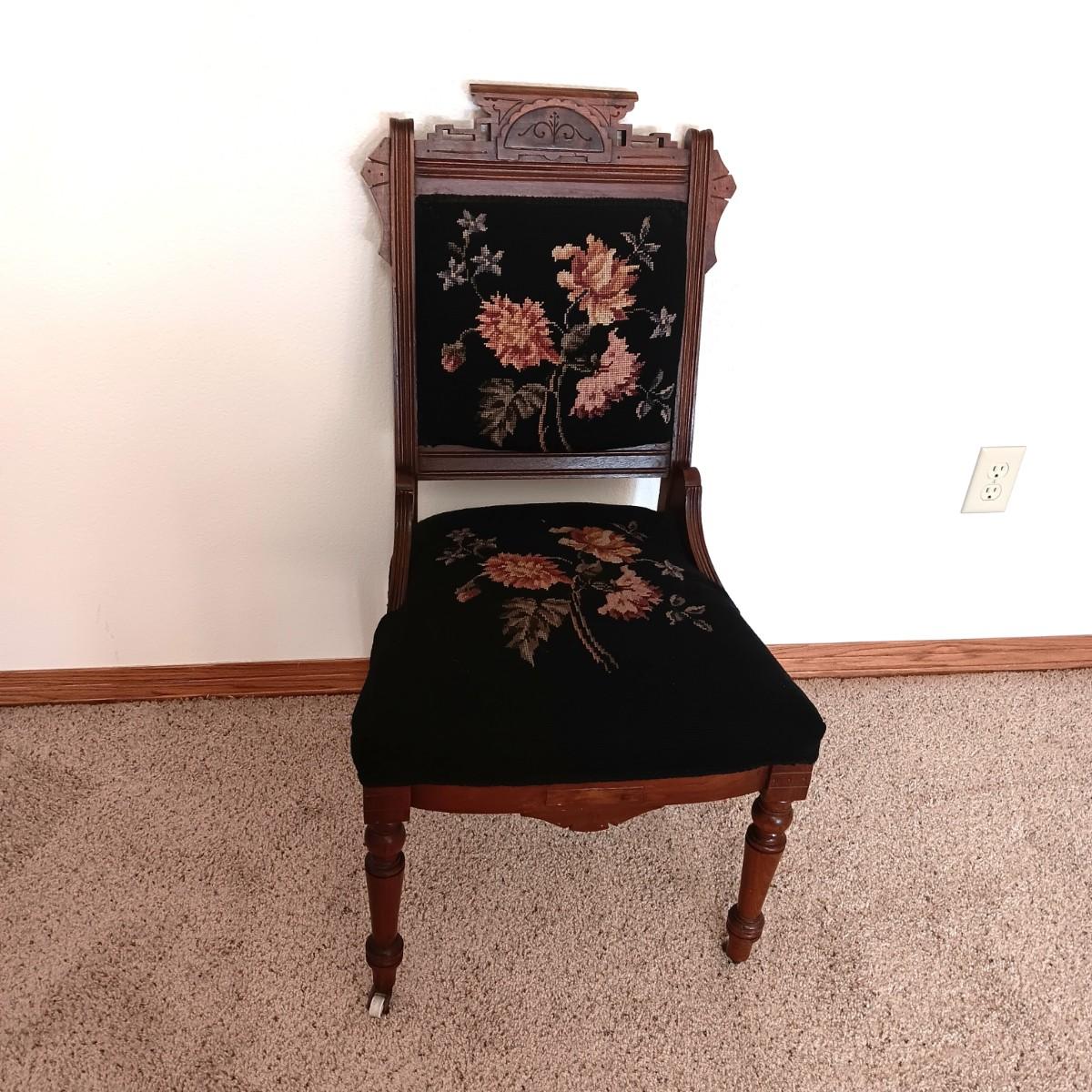 EAST LAKE ANTIQUE CHAIR WITH HAND CRAFTED NEEDLE POINT BACK AND SEAT