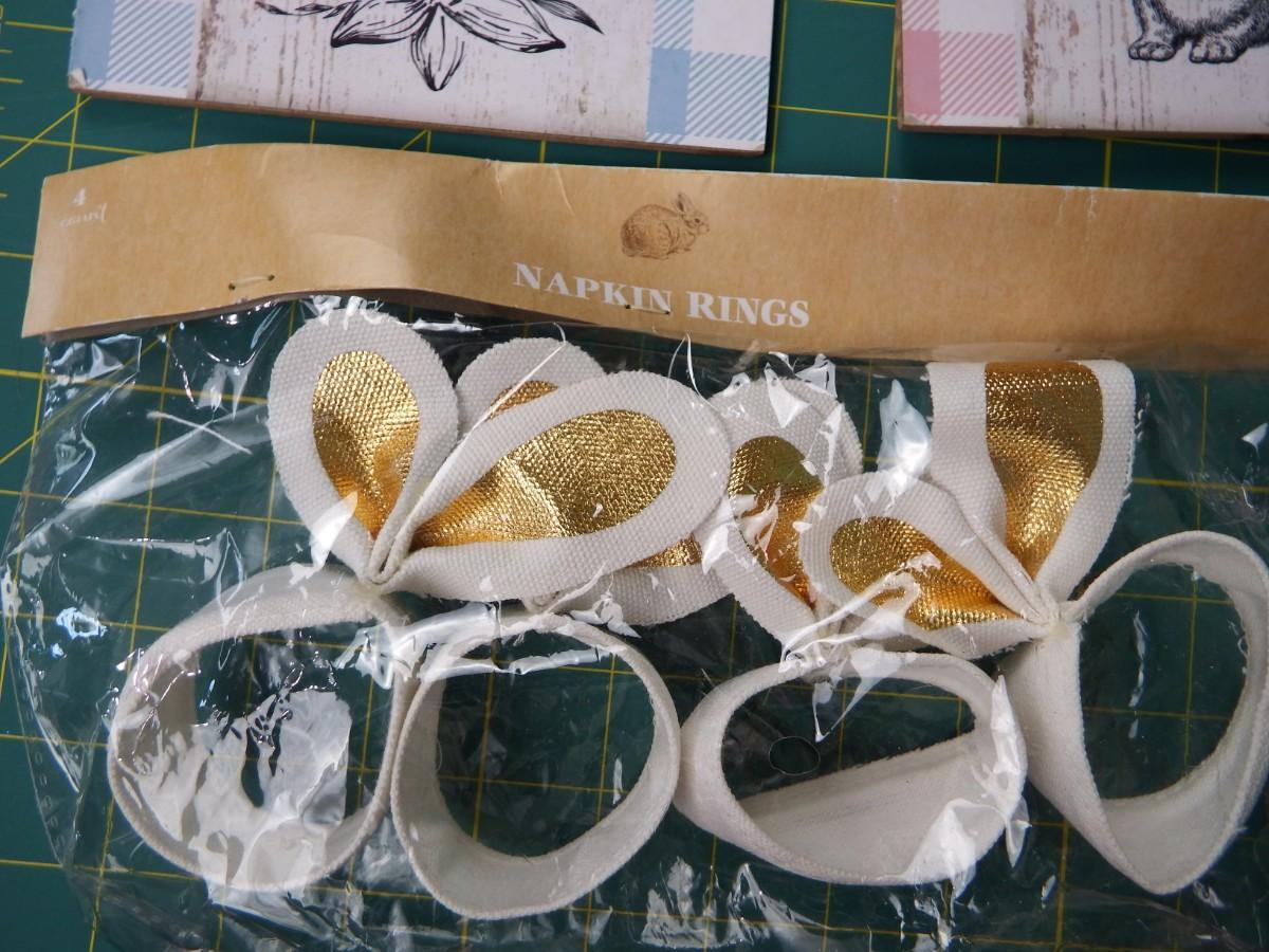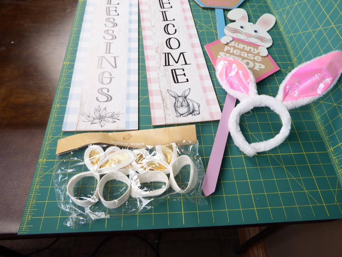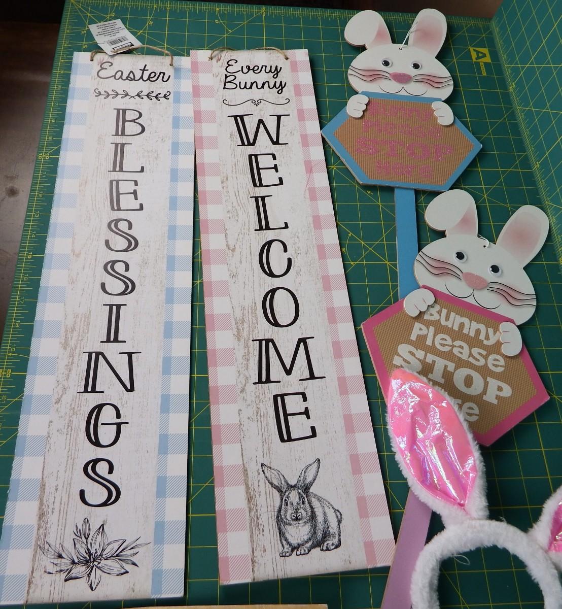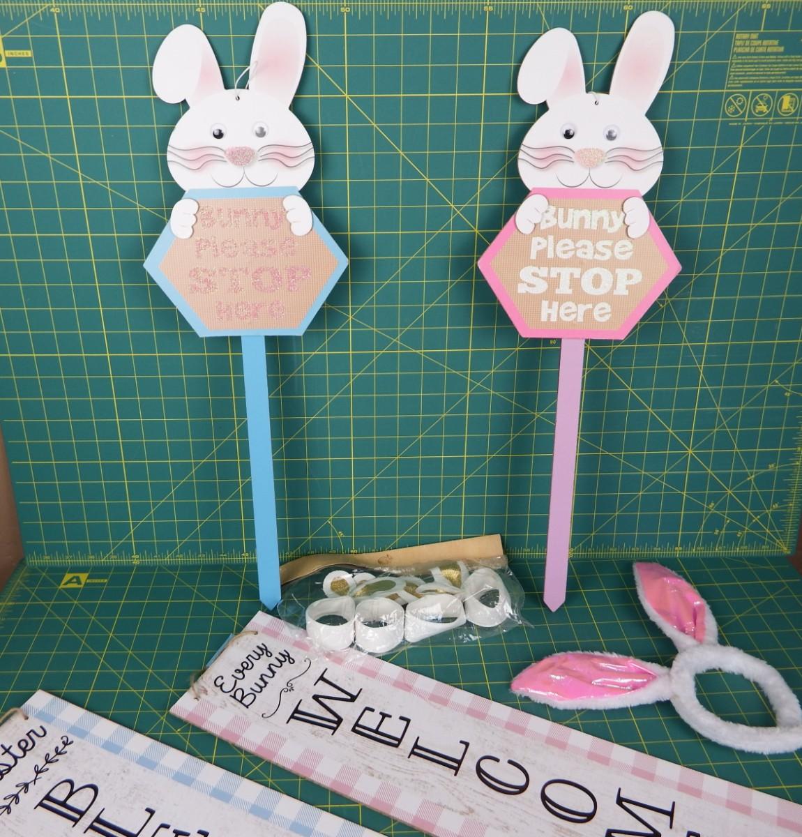 Two sets of matching Bunny please stop here & welcome signs. Bunny ear napkin rings.