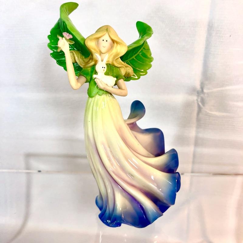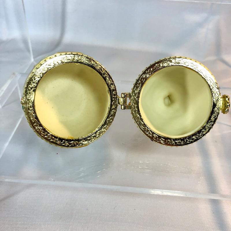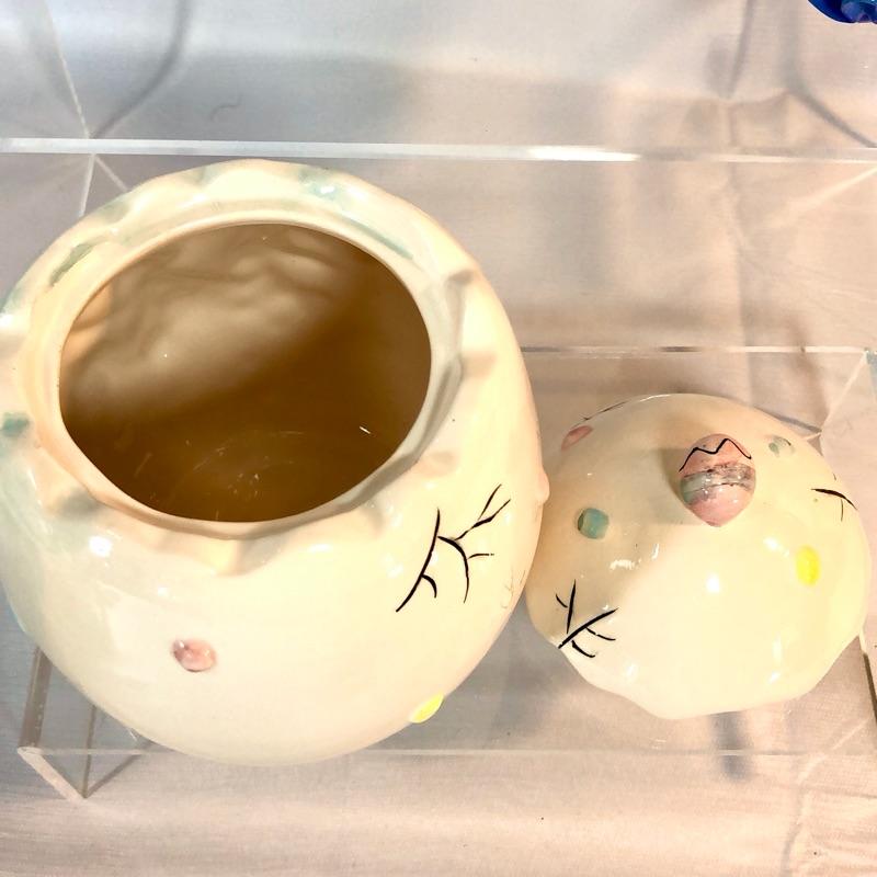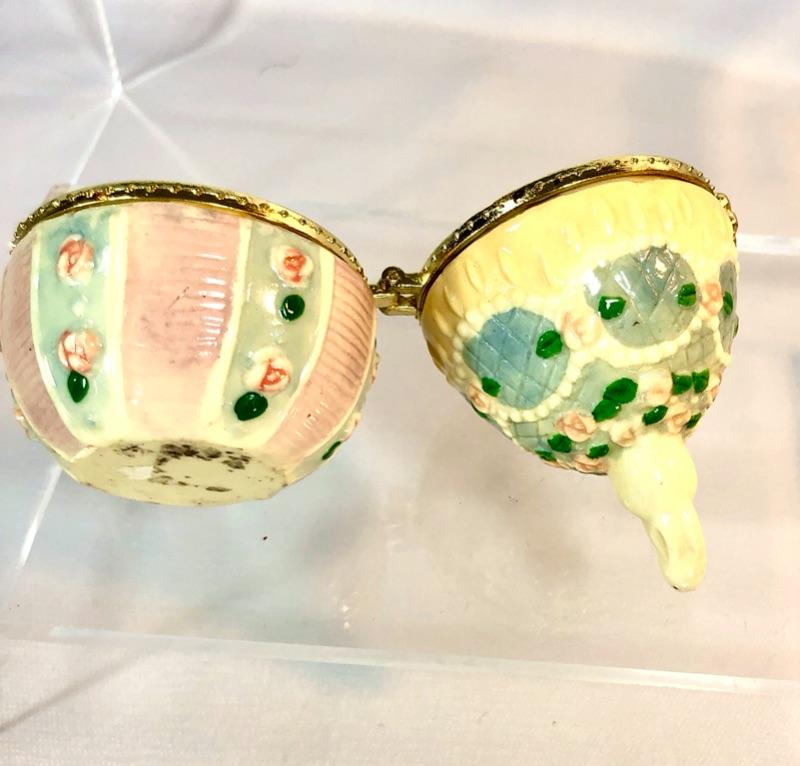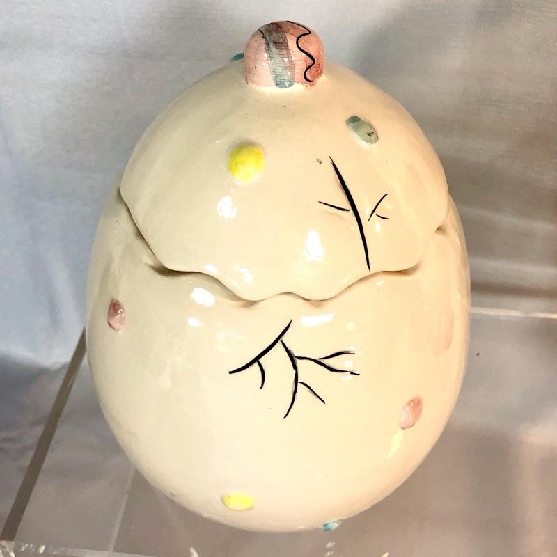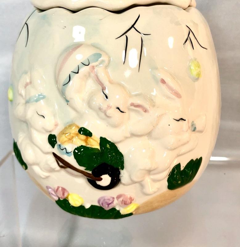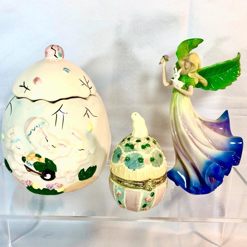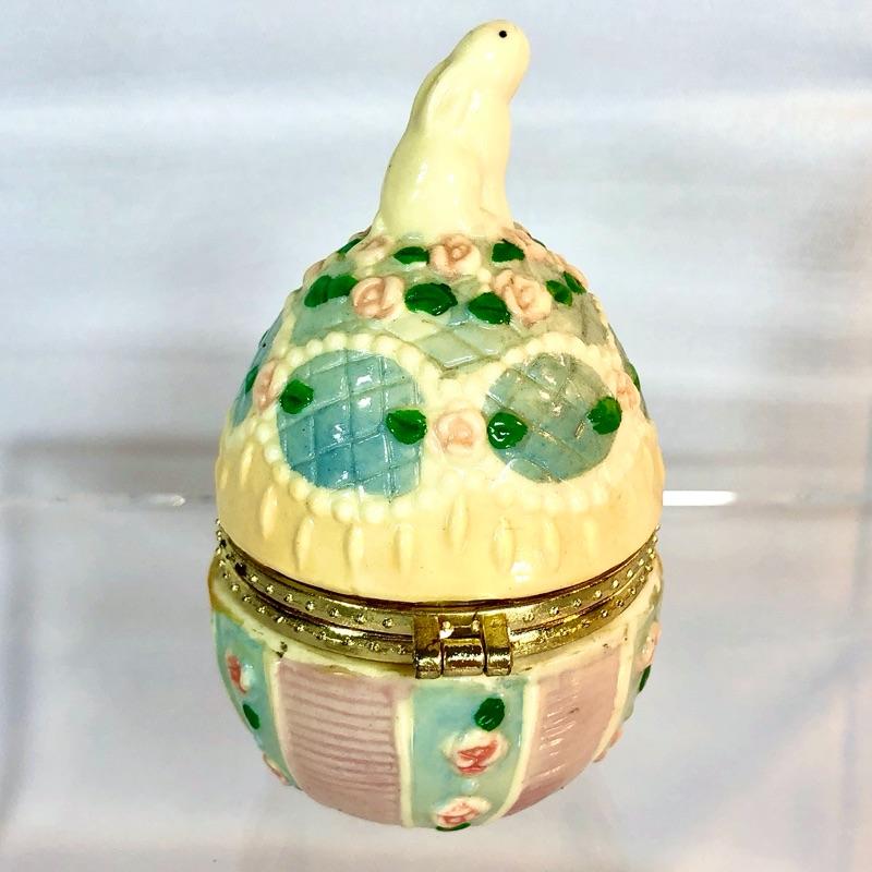 Vintage Easter egg candy dish with a gardening bunny trio. Ceramic. 6.25" high; Easter angel holding a bunny and flower. The ombre skirt adds a nice touch. High gloss finish, bright colors. Lovely and unusual. Hinged Easter egg porcelain box with rabbit on top.