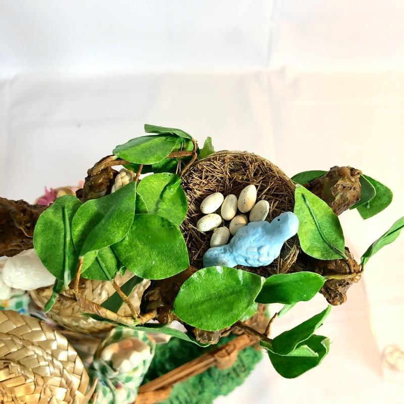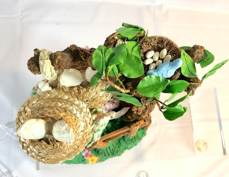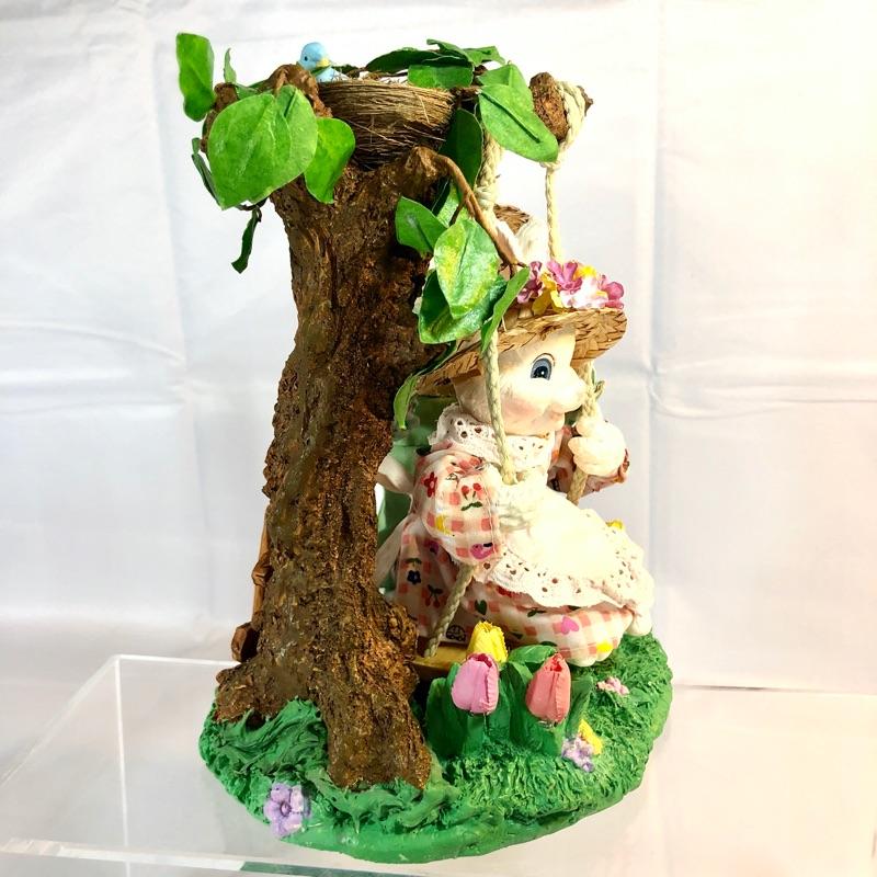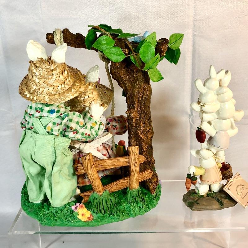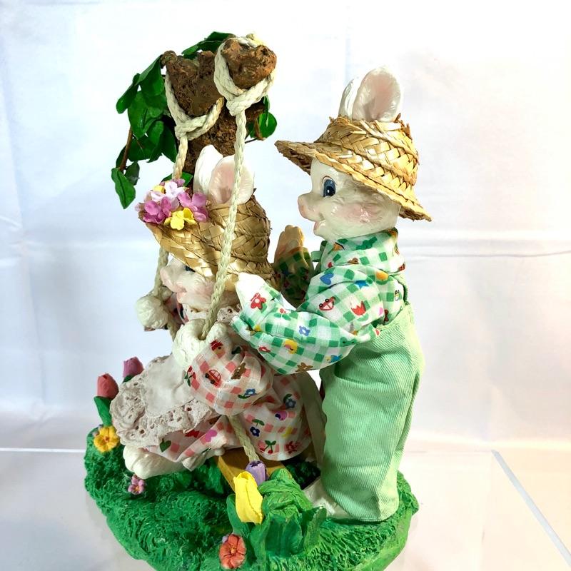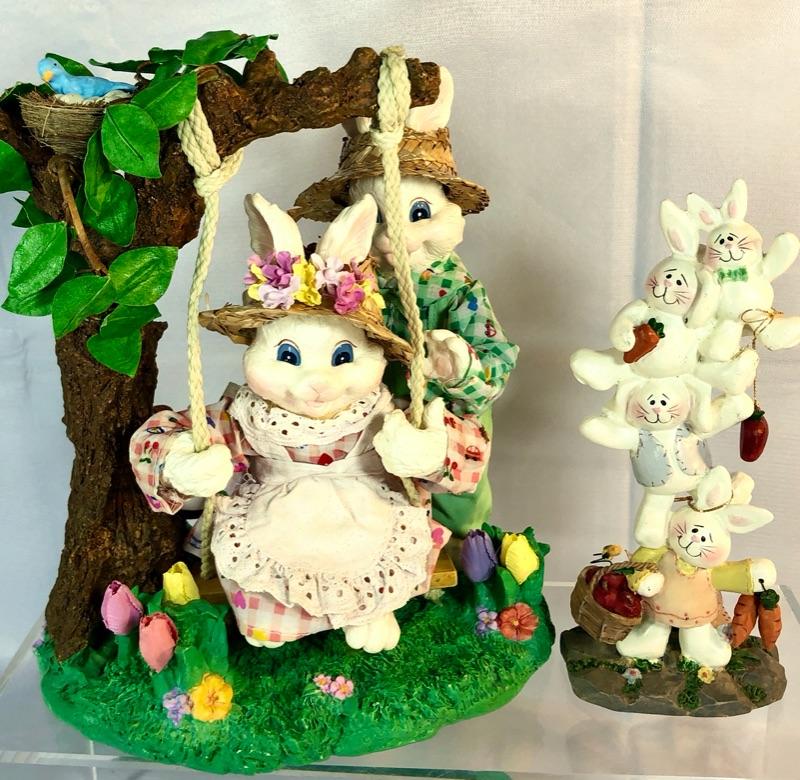 One centerpiece-sized décor features two Easter bunnies playing on a tree swing.