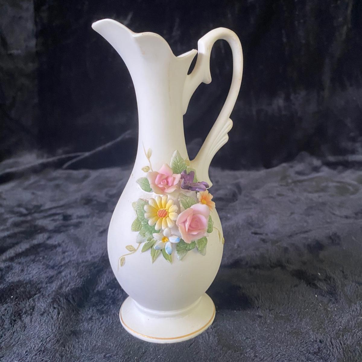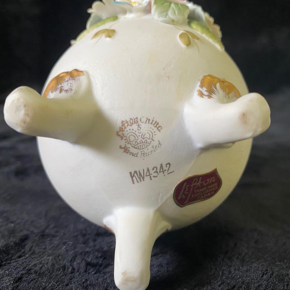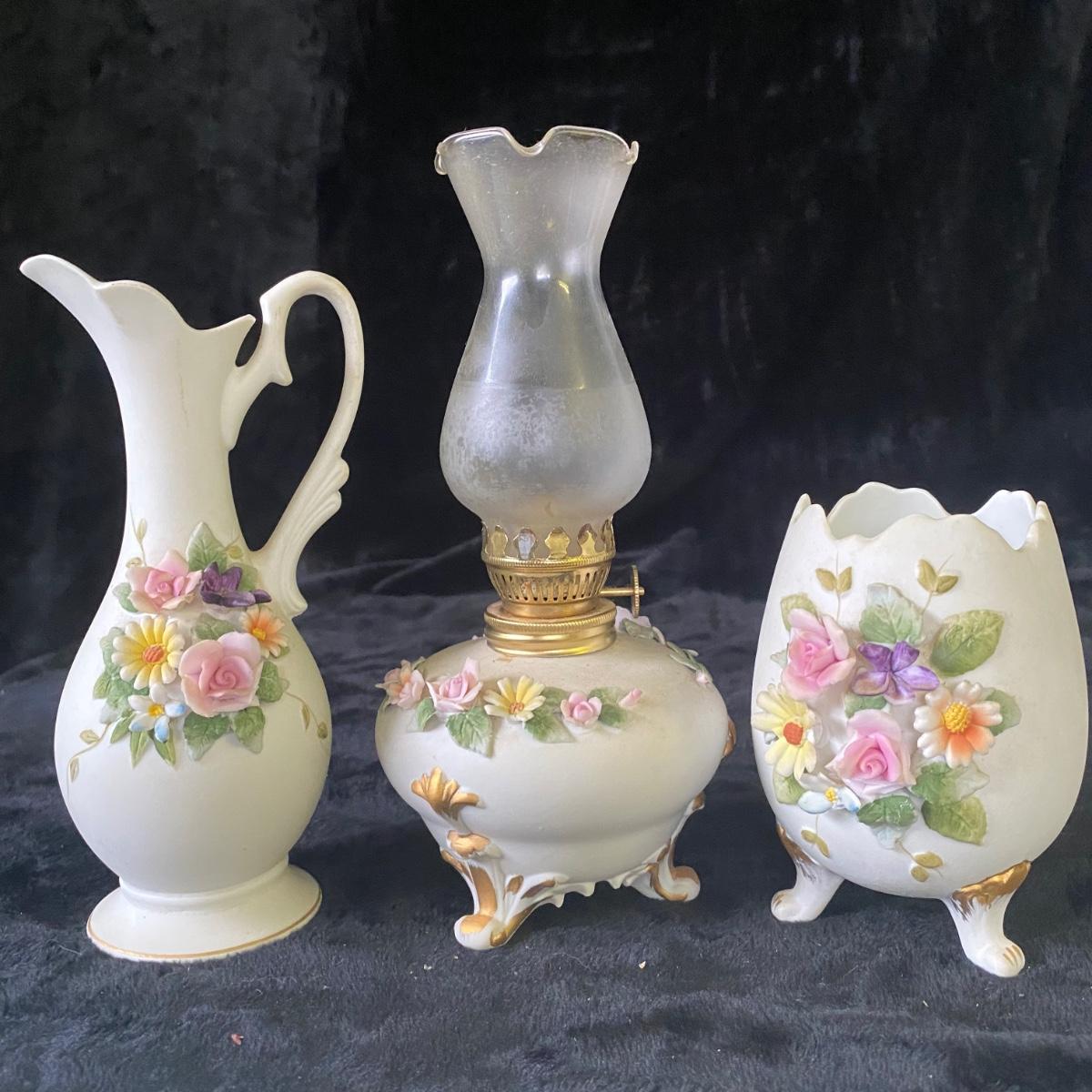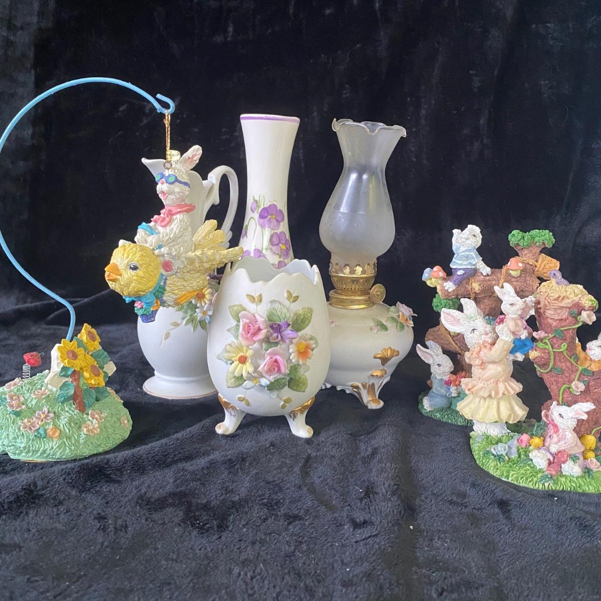 Three Lefton floral pieces that match. The small pitcher, small egg shaped bowl and oil lamp. Also included three Easter bunny clay figures, one has broken ears.