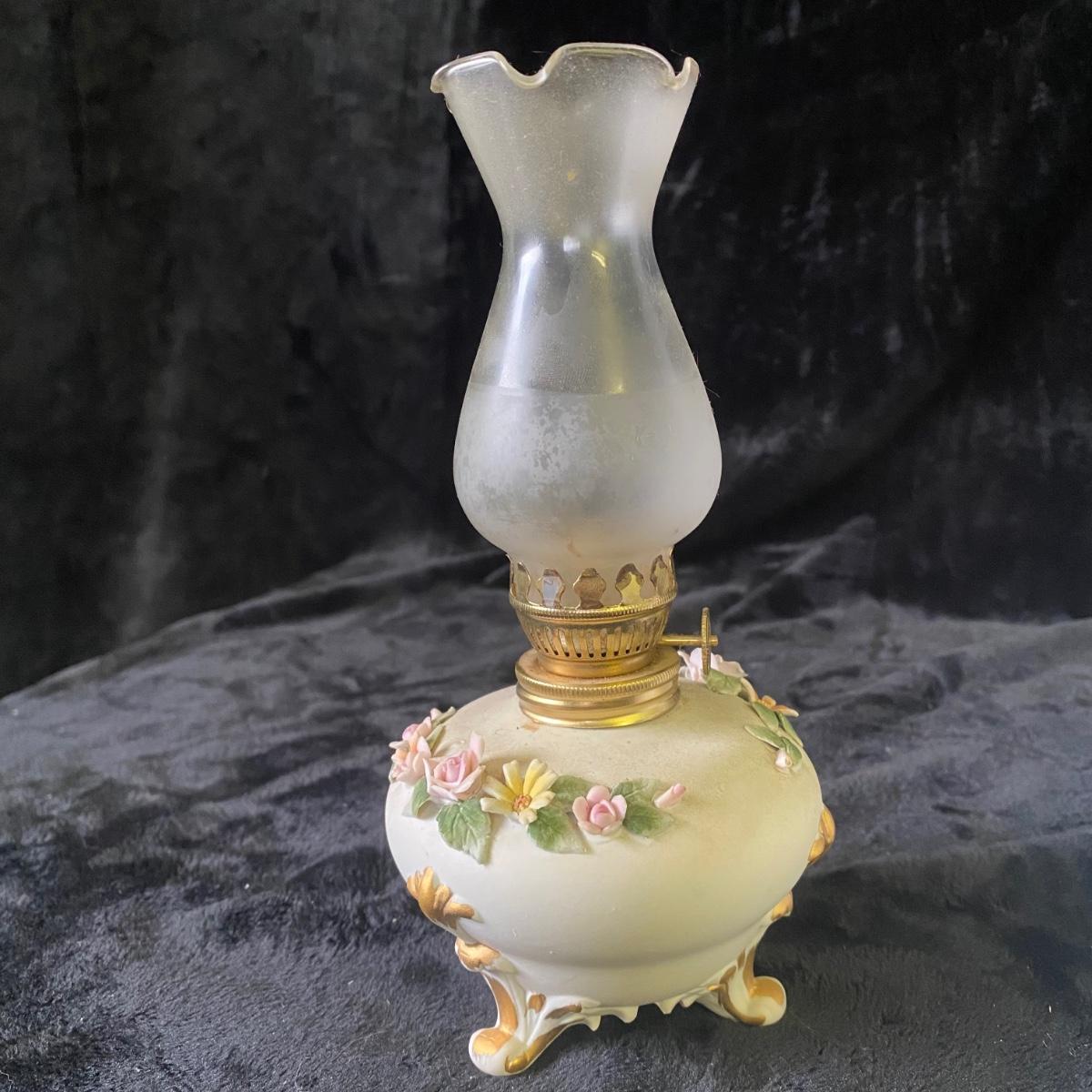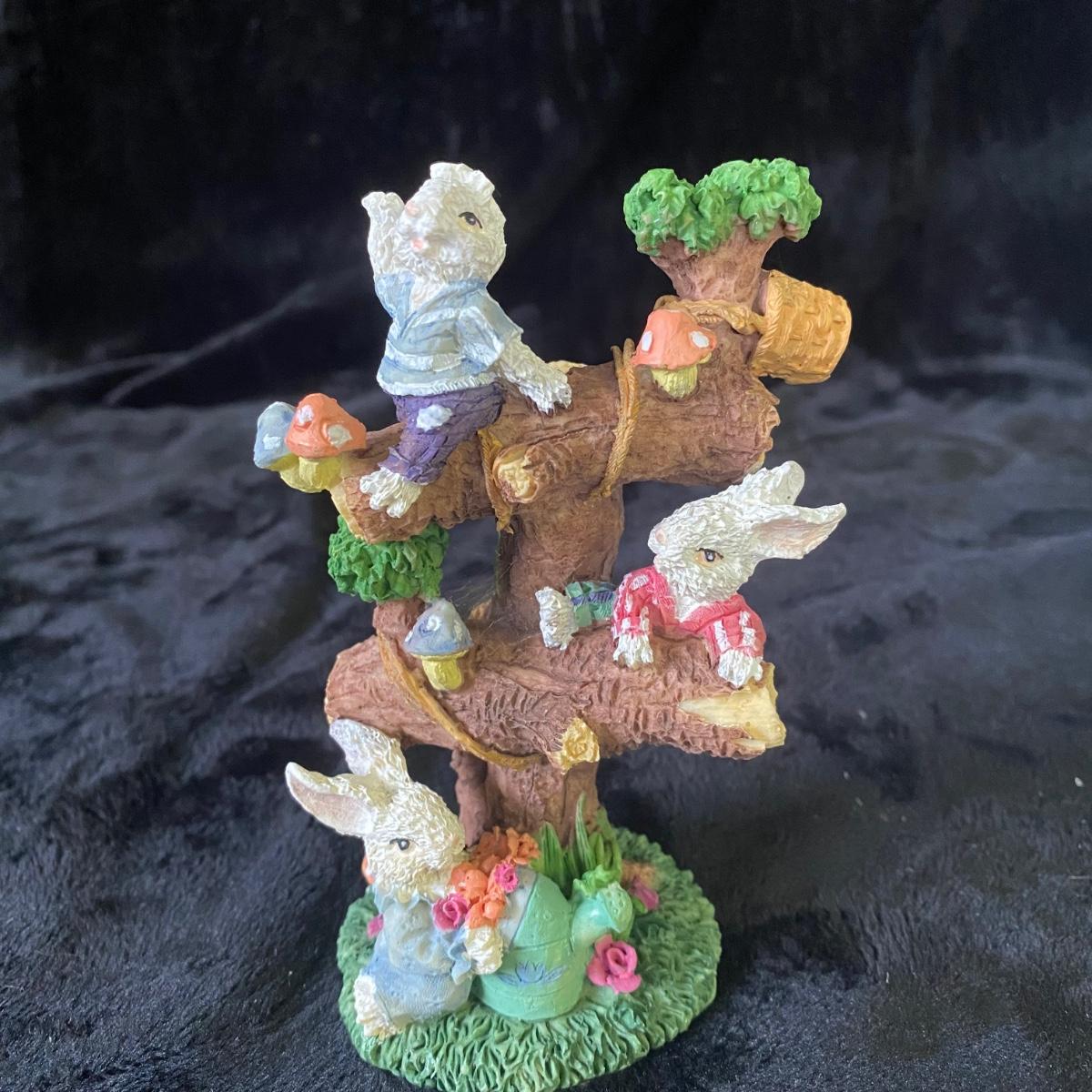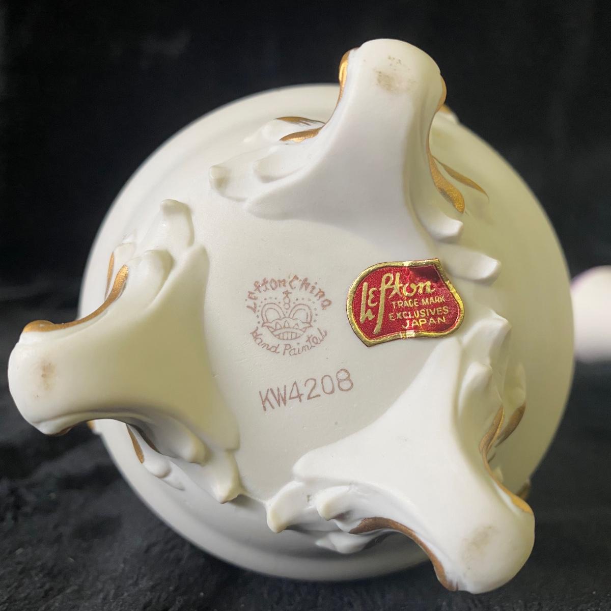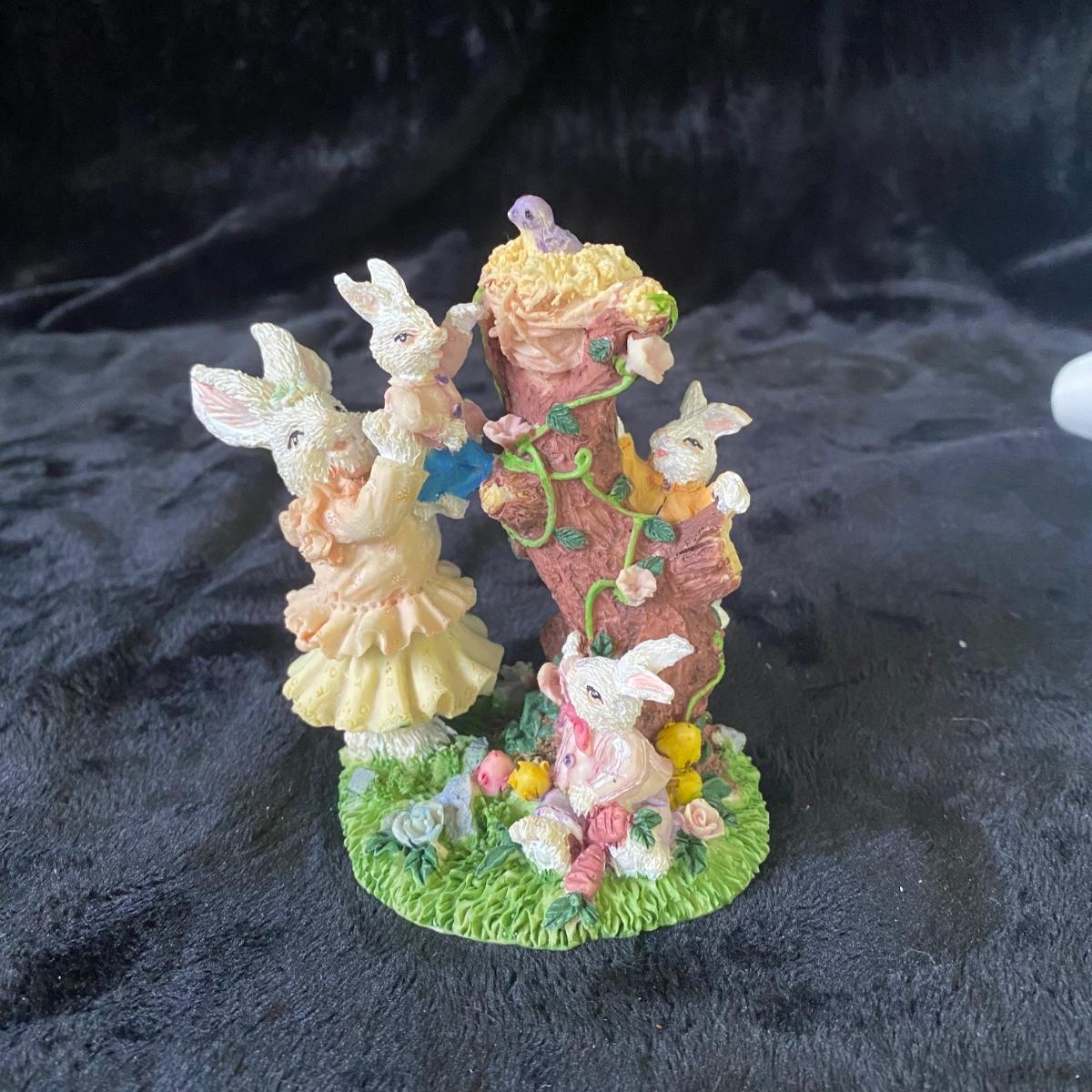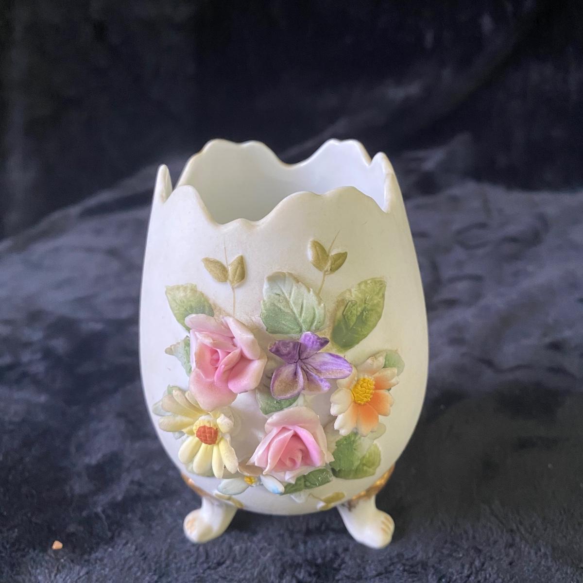 Three Lefton floral pieces that match. The small pitcher, small egg shaped bowl and oil lamp. Also included three Easter bunny clay figures, one has broken ears.
