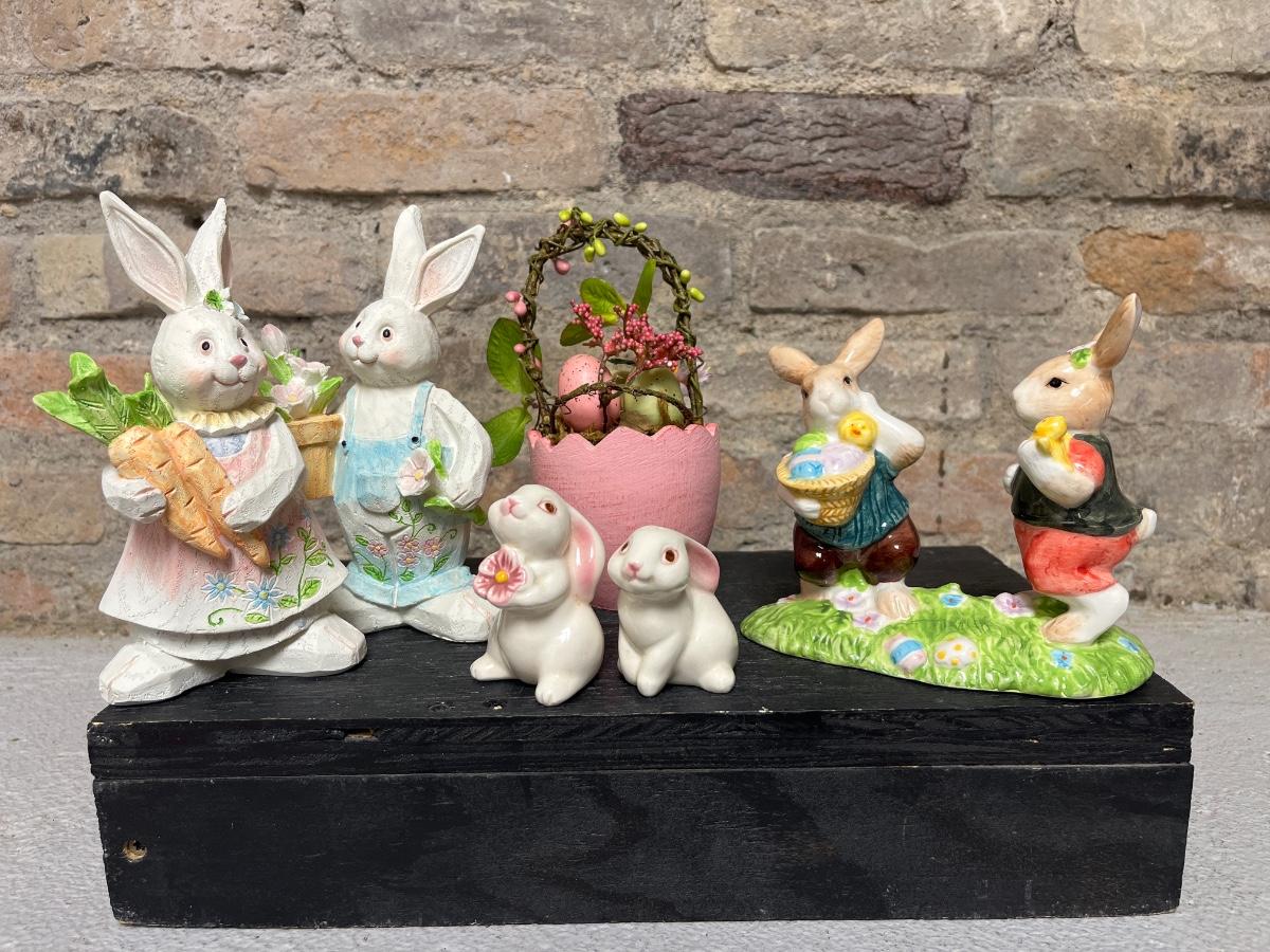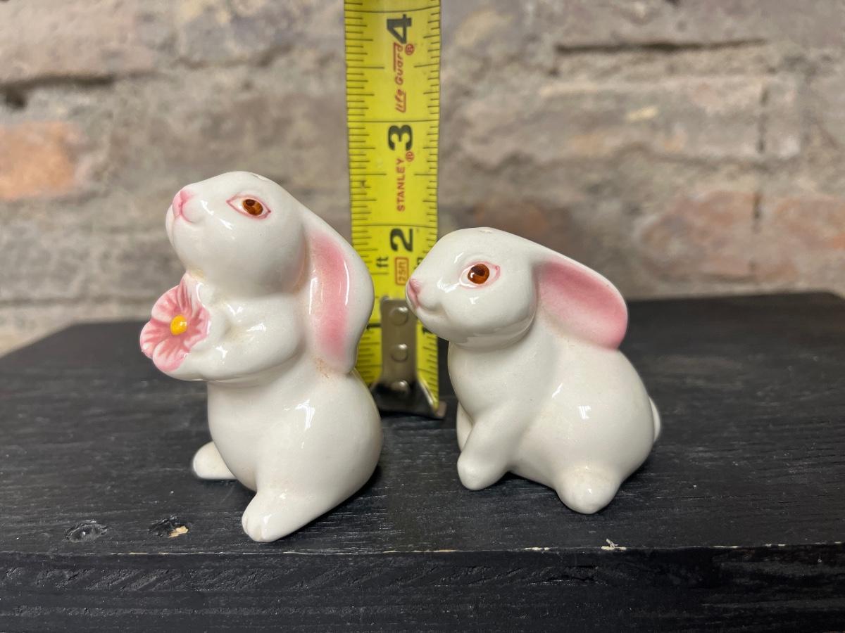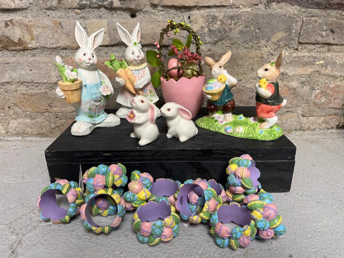 Sweet little bunny salt & pepper shakers, porcelain bunnies figurine, egg basket, a pair of resin bunny figurines, and a set of Easter napkin rings