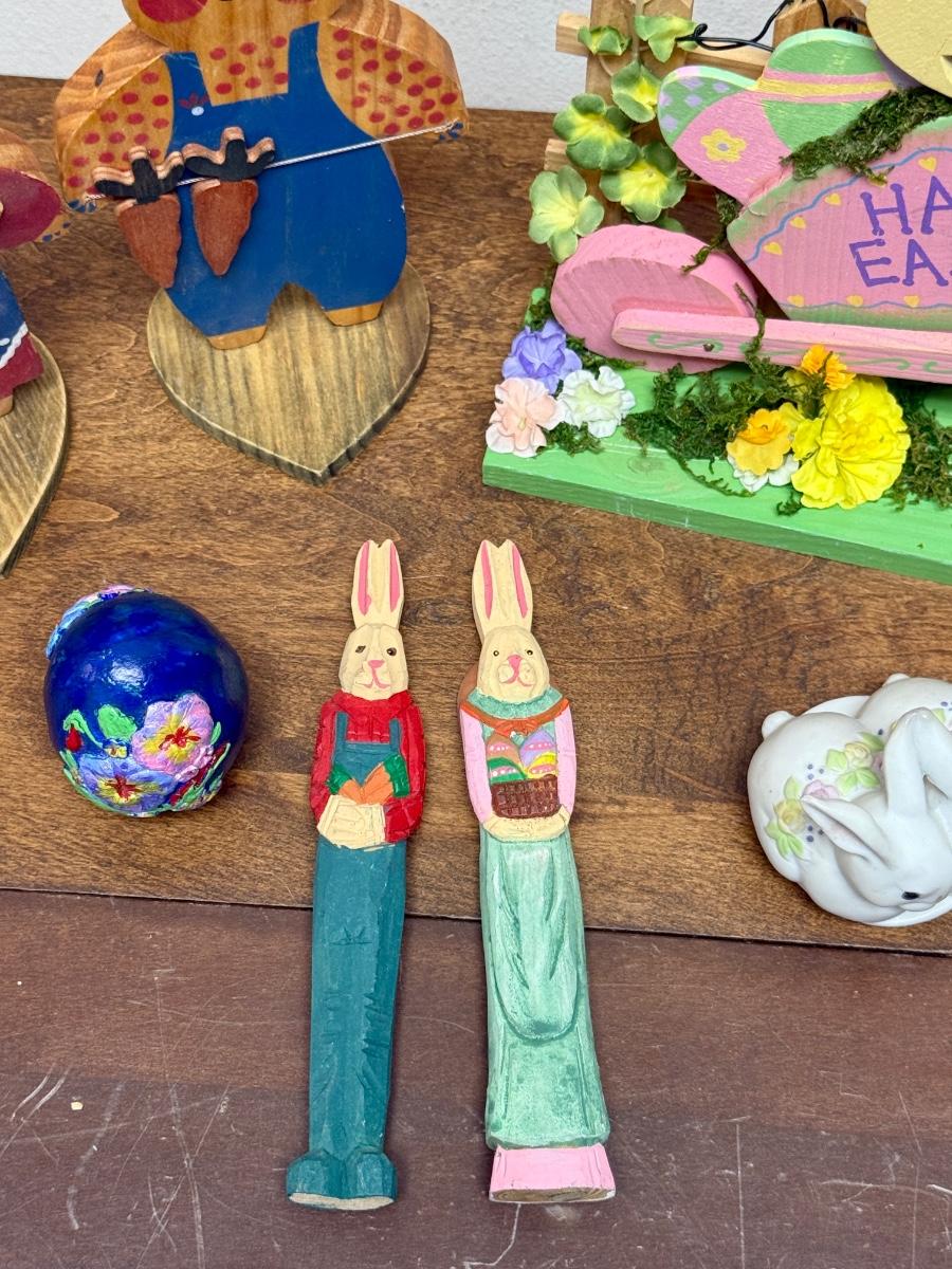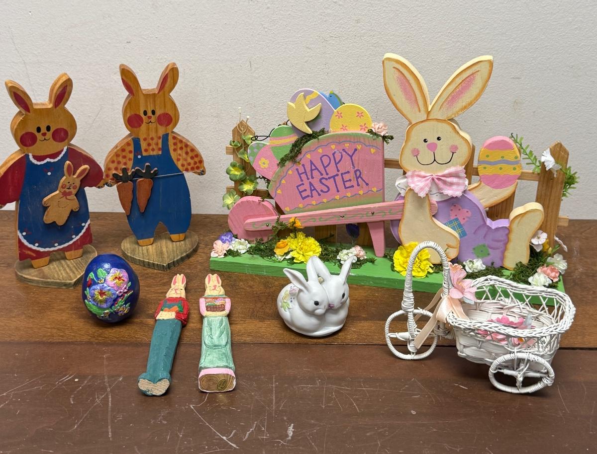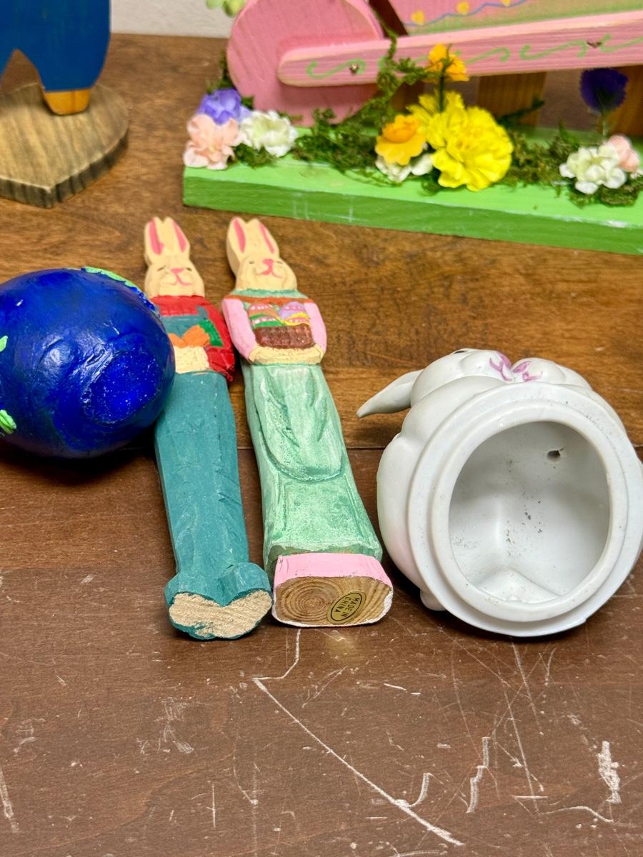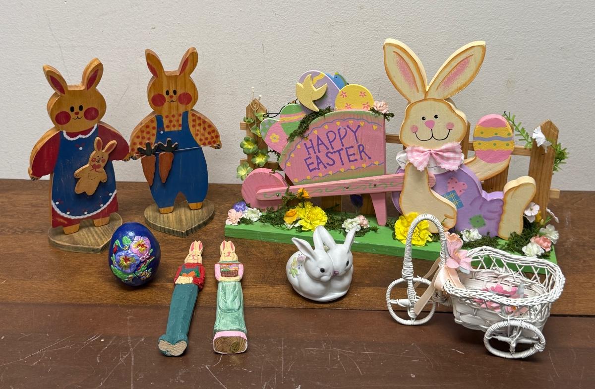 Most are painted wood, Bunny pair is bisque porcelain, and carriage is white wicker. All on good condition.