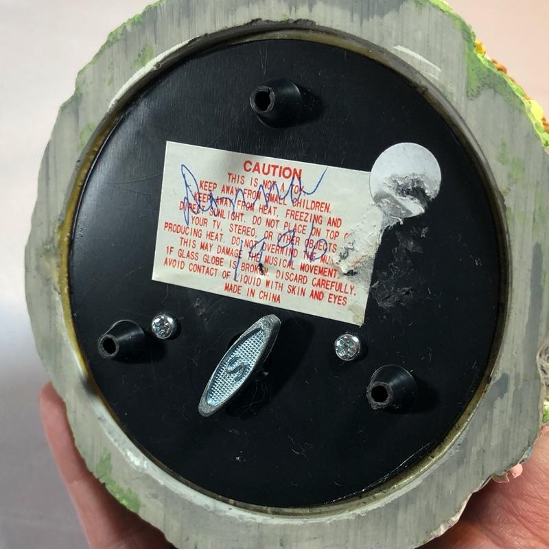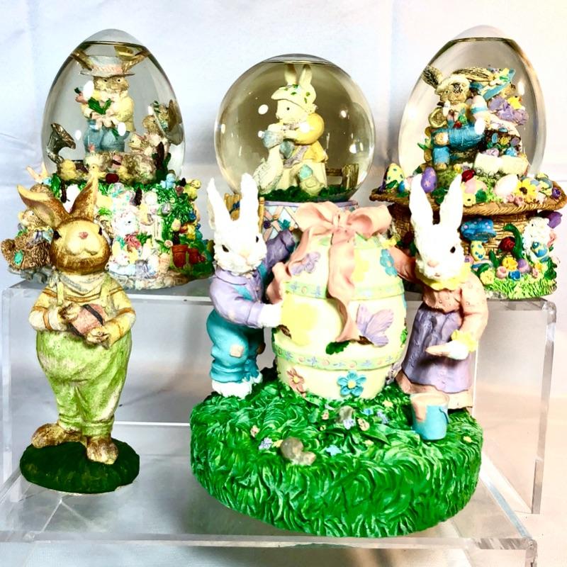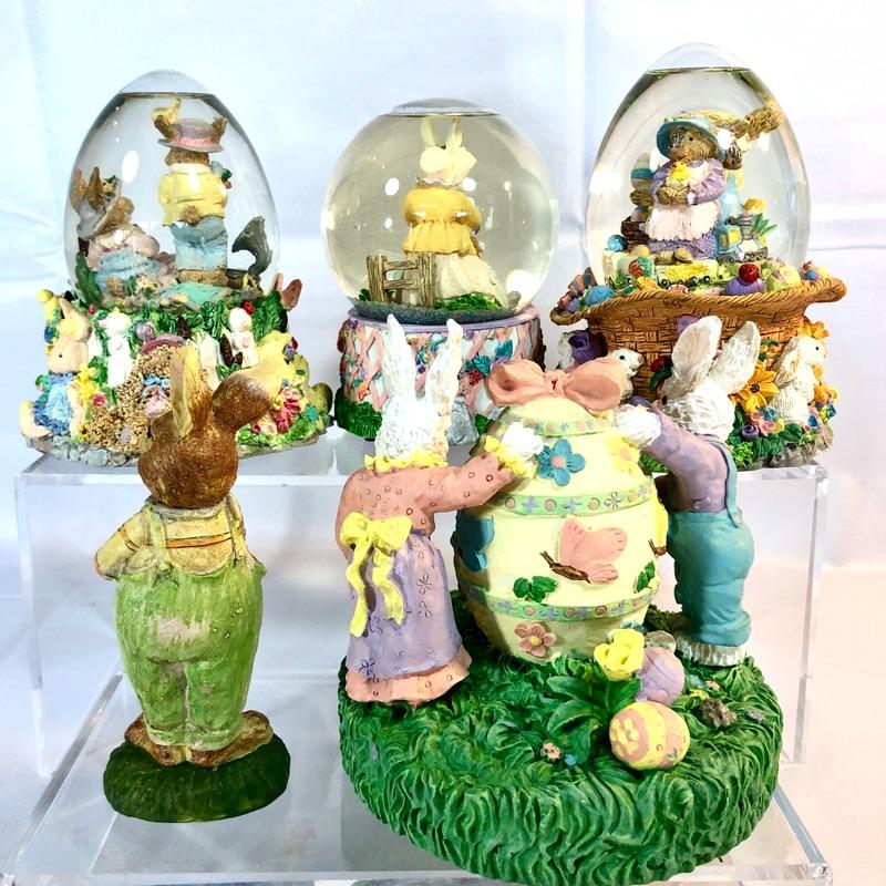 Four pieces. Believe these are all from The San Francisco Music Box Company. Egg shaped globe plays "Here Comes Peter Cottontail." The others have the same, very familiar tune, but can't quite recall it. Lots of detail and bright colors. Various types/colors of snow in each.