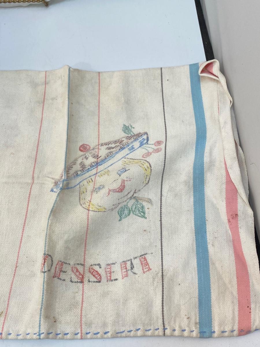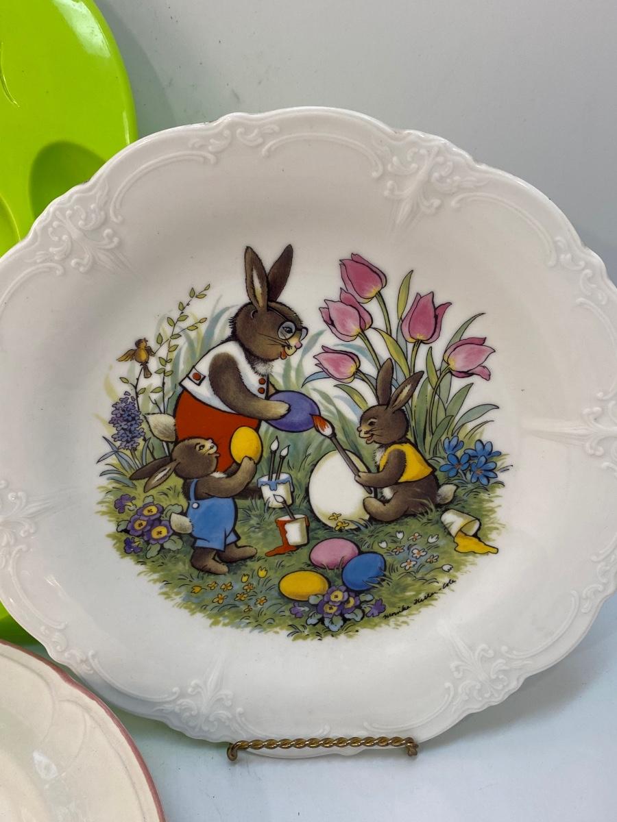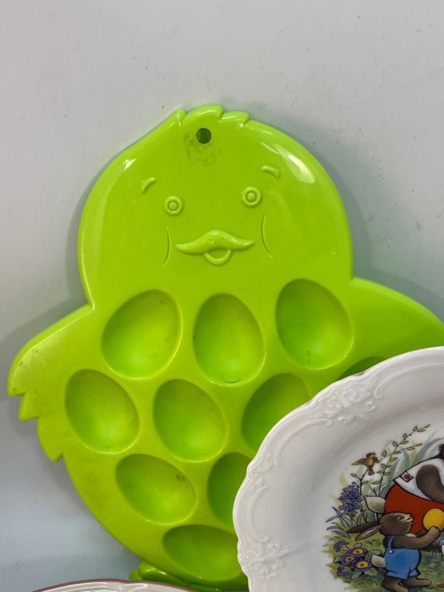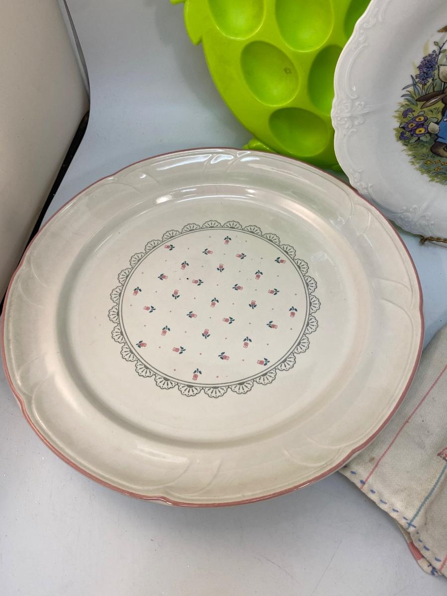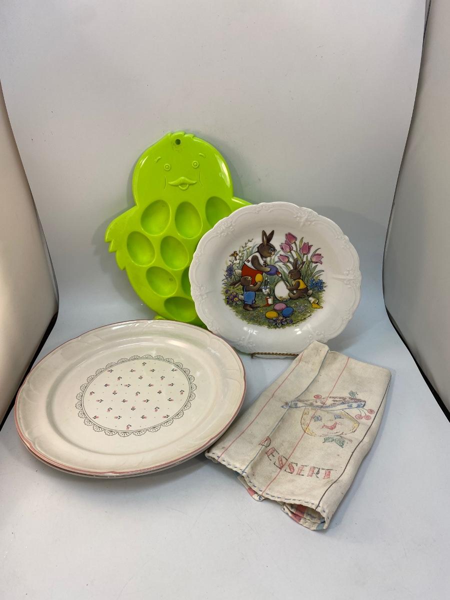 Easter Springtime Dish Plate Lot. Two stoneware chop plates, an Easter rabbit themed plate, a plastic chick shaped egg plate, and a springtime vintage tea towel. Plates are in good condition, towel is discolored and faded.