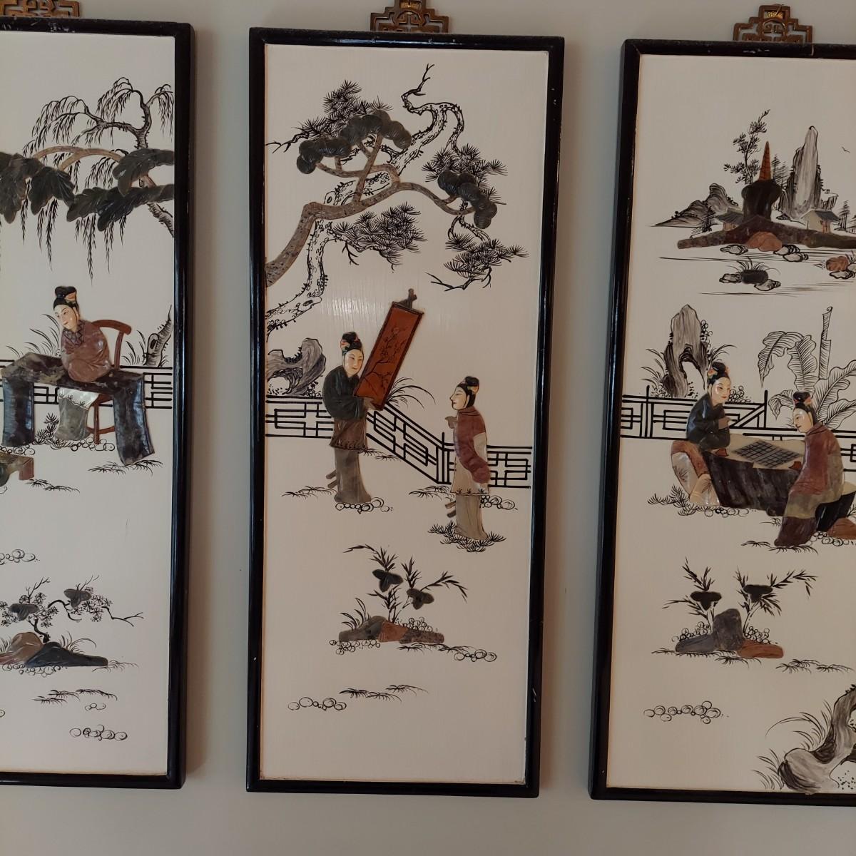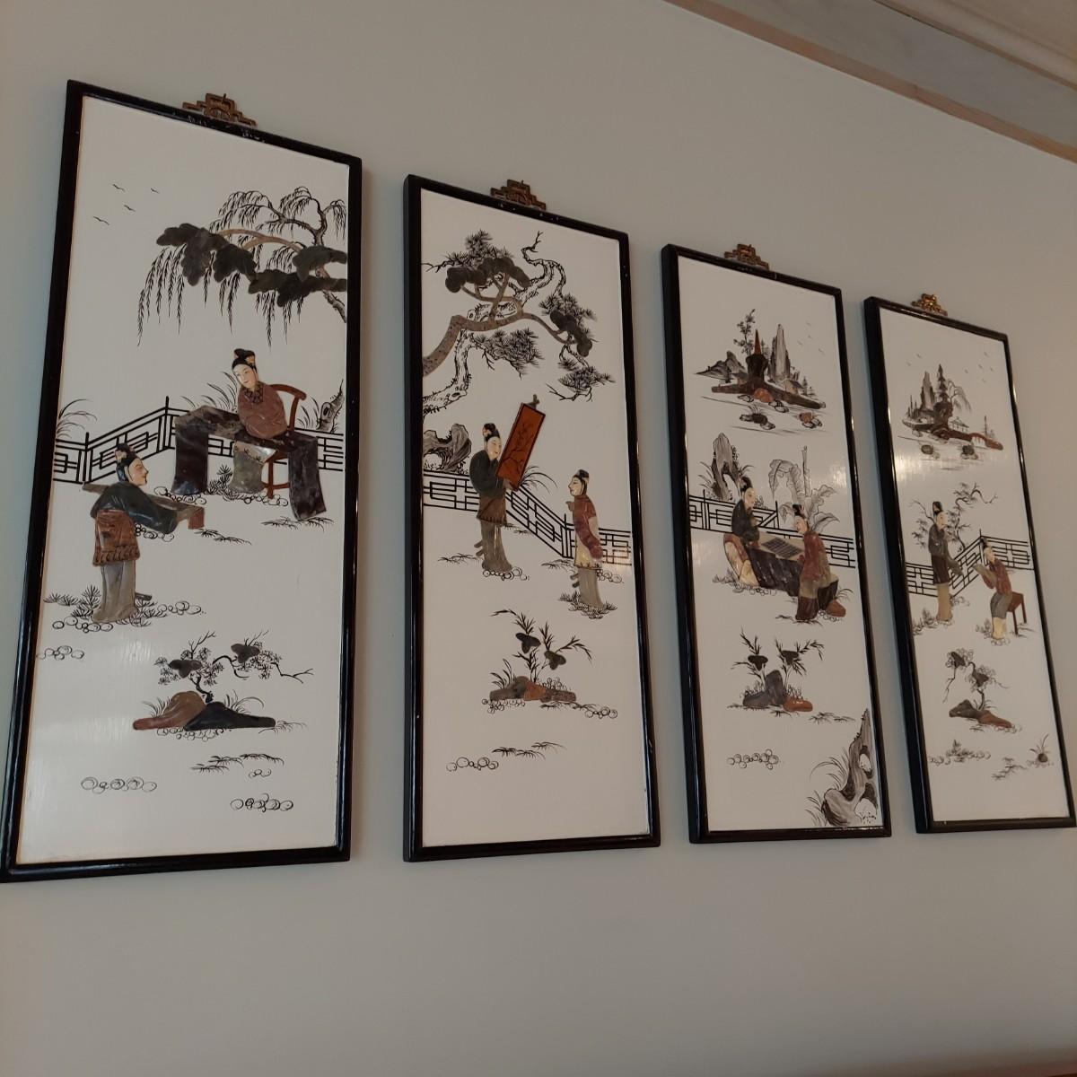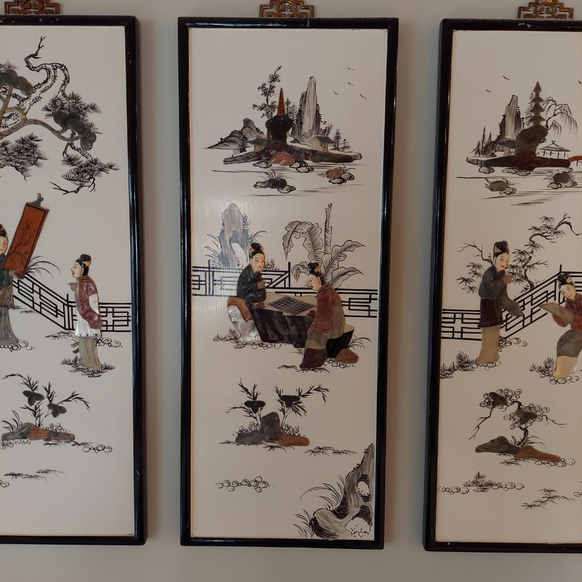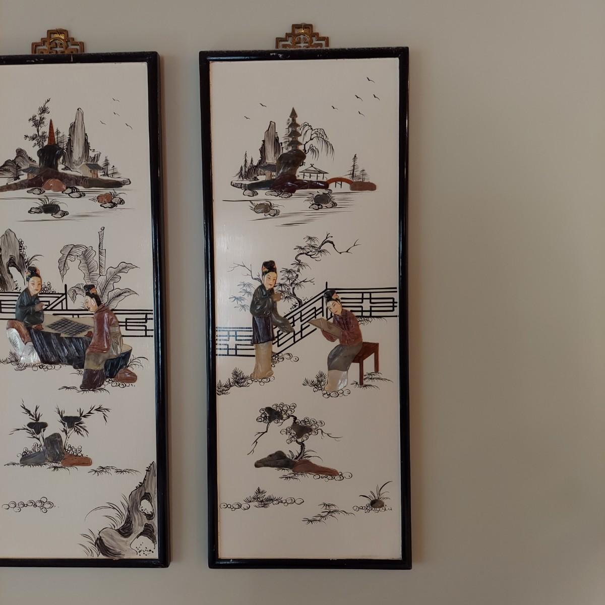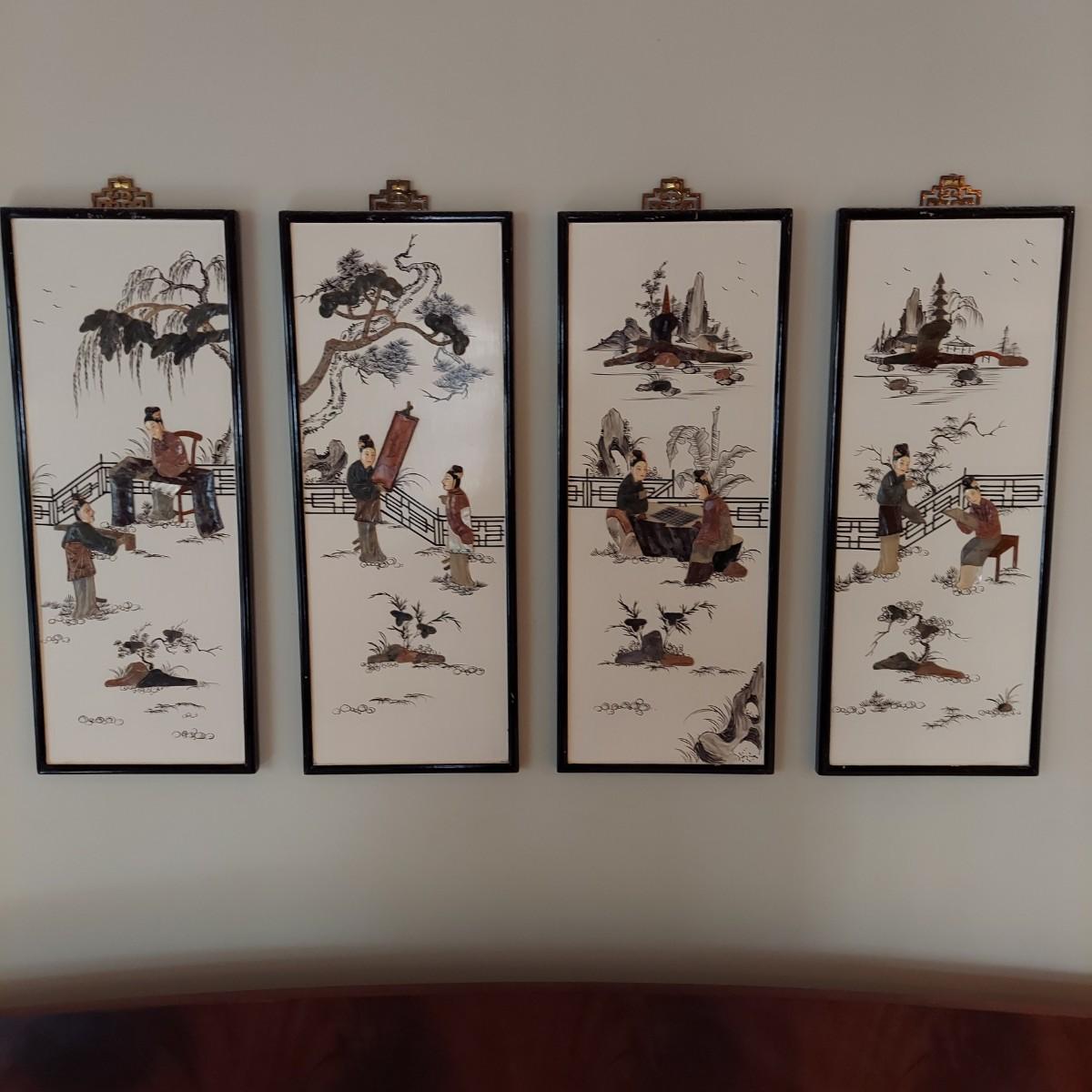 Four wooden panels with wooden frames and brass decorative top hangers. Each is painted and inlaid with what appear to be semi precious stones. Each panel measures 10" x 25"H. Shipping available. Shipping certain items can be costly. We suggest contacting our preferred local shipping provider, Postage Express, with dimensions and getting an estimate before bidding: (828) 670-5501 or postageexpress@yahoo.com.