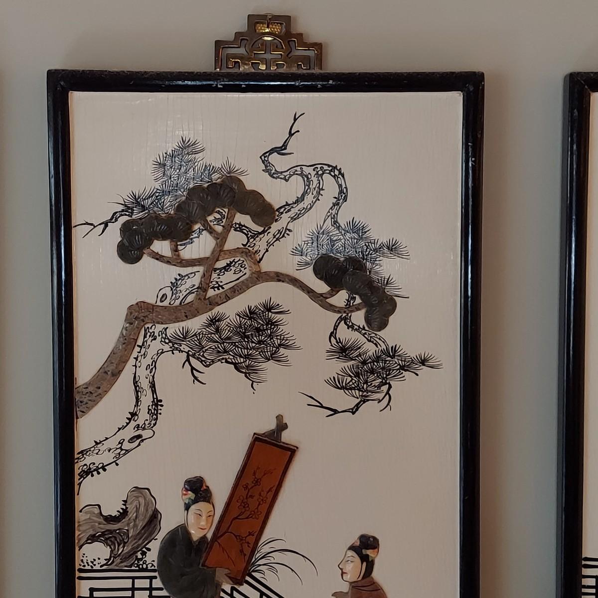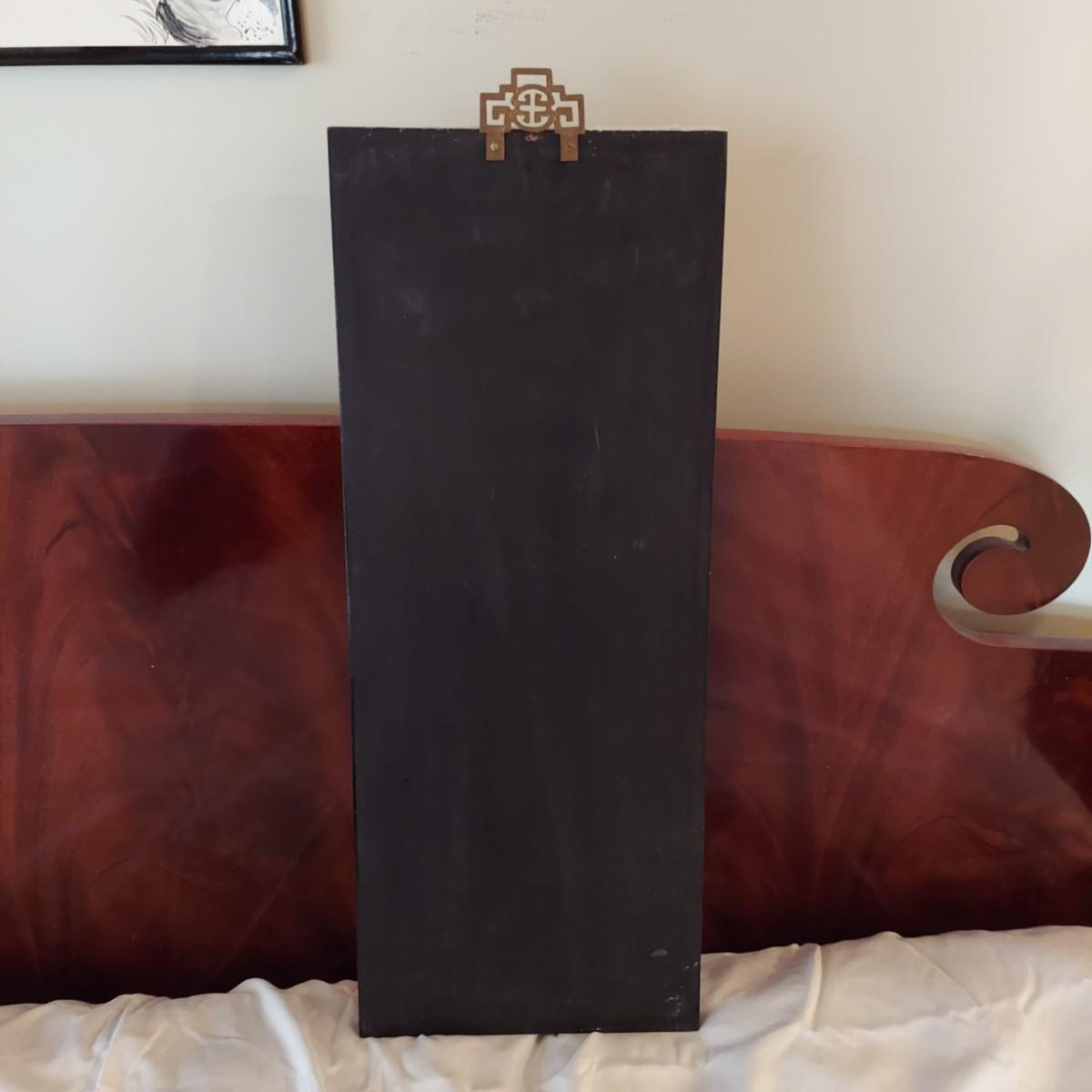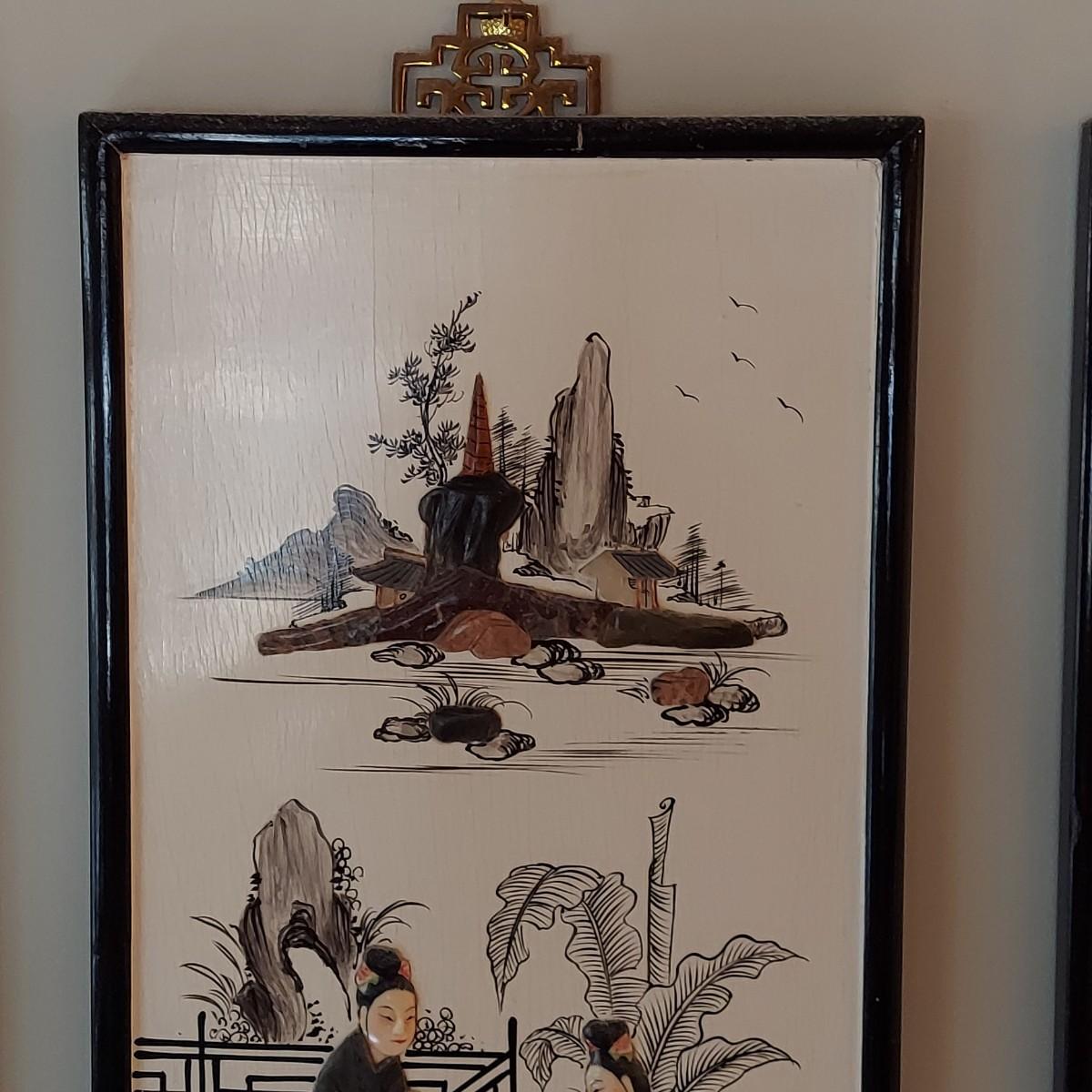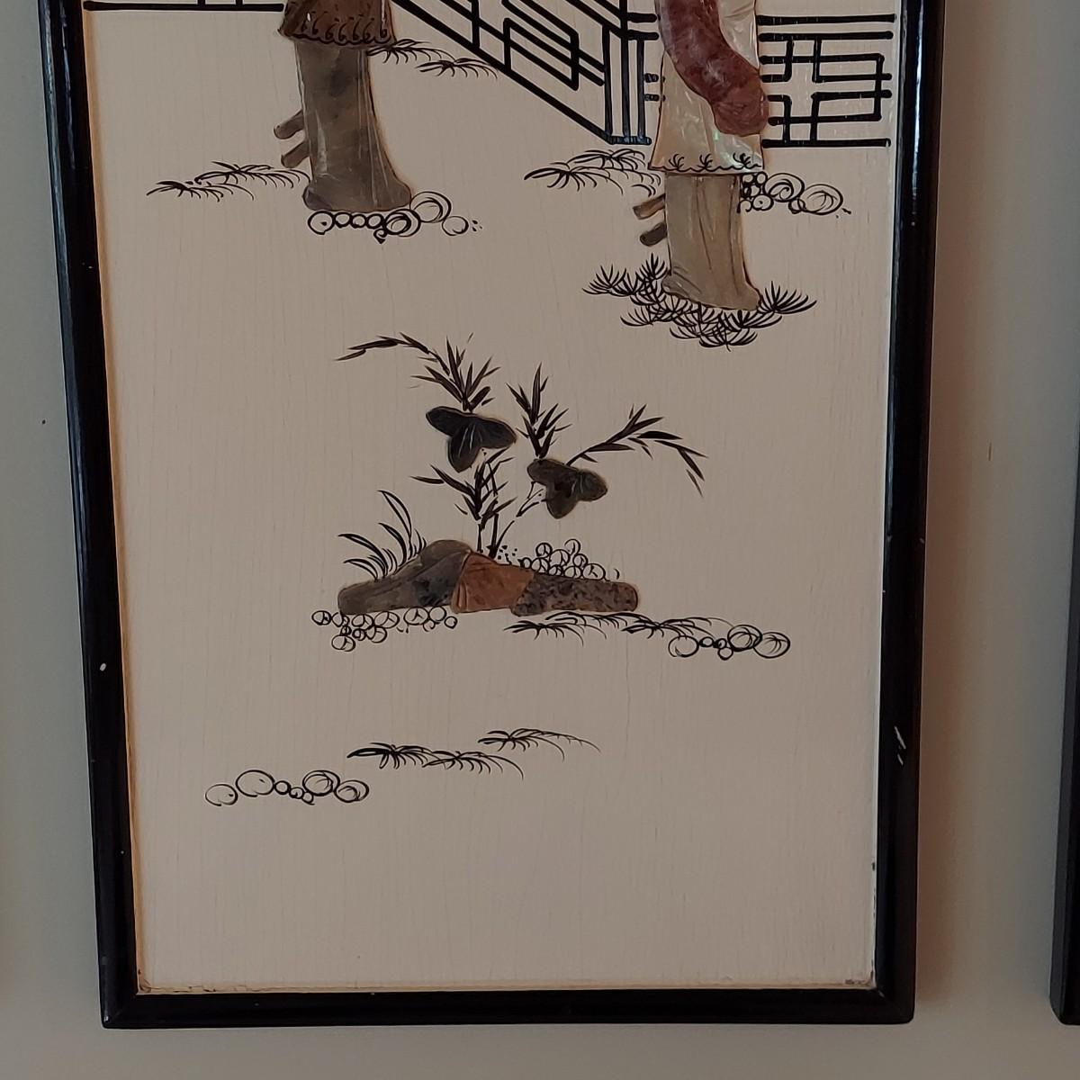 Four wooden panels with wooden frames and brass decorative top hangers. Each is painted and inlaid with what appear to be semi precious stones. Each panel measures 10" x 25"H. Shipping available. Shipping certain items can be costly. We suggest contacting our preferred local shipping provider, Postage Express, with dimensions and getting an estimate before bidding: (828) 670-5501 or postageexpress@yahoo.com.