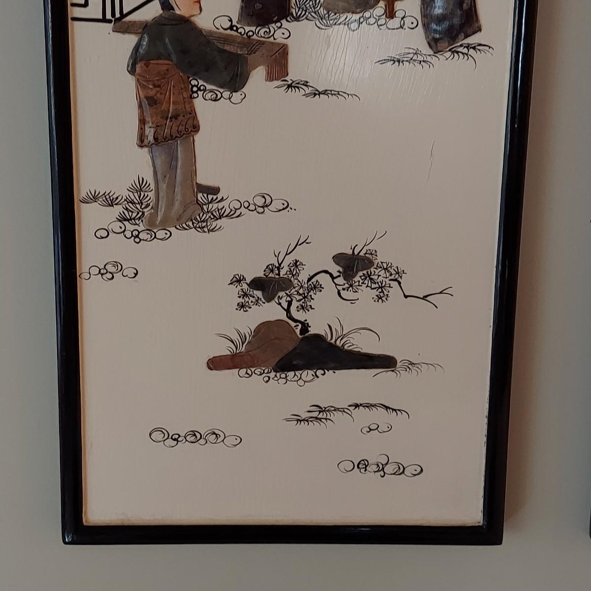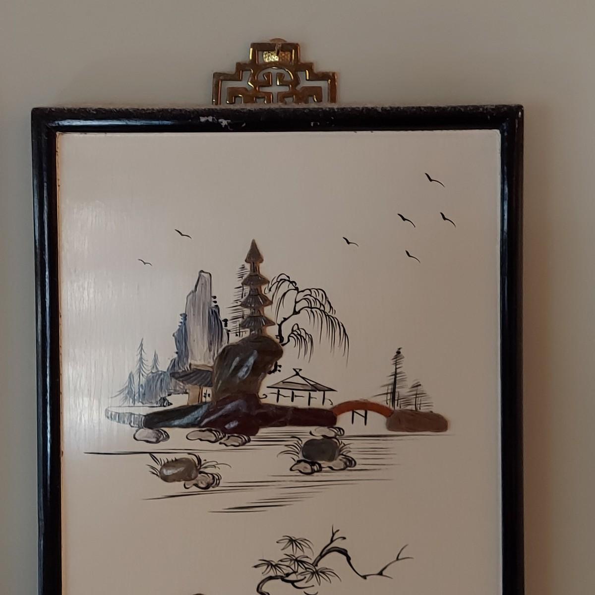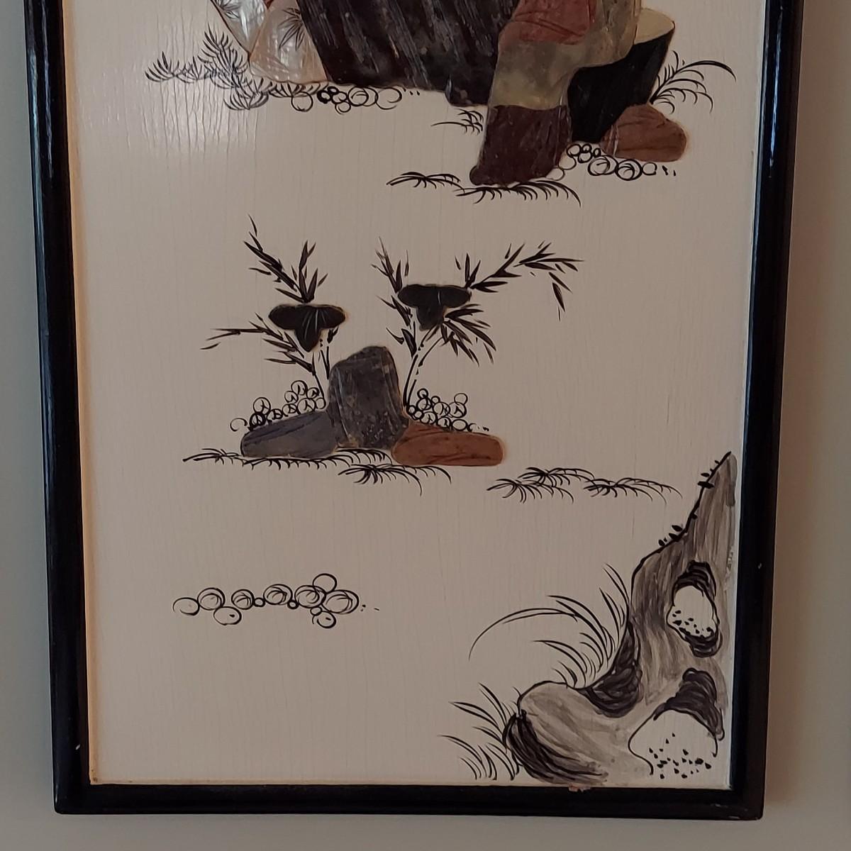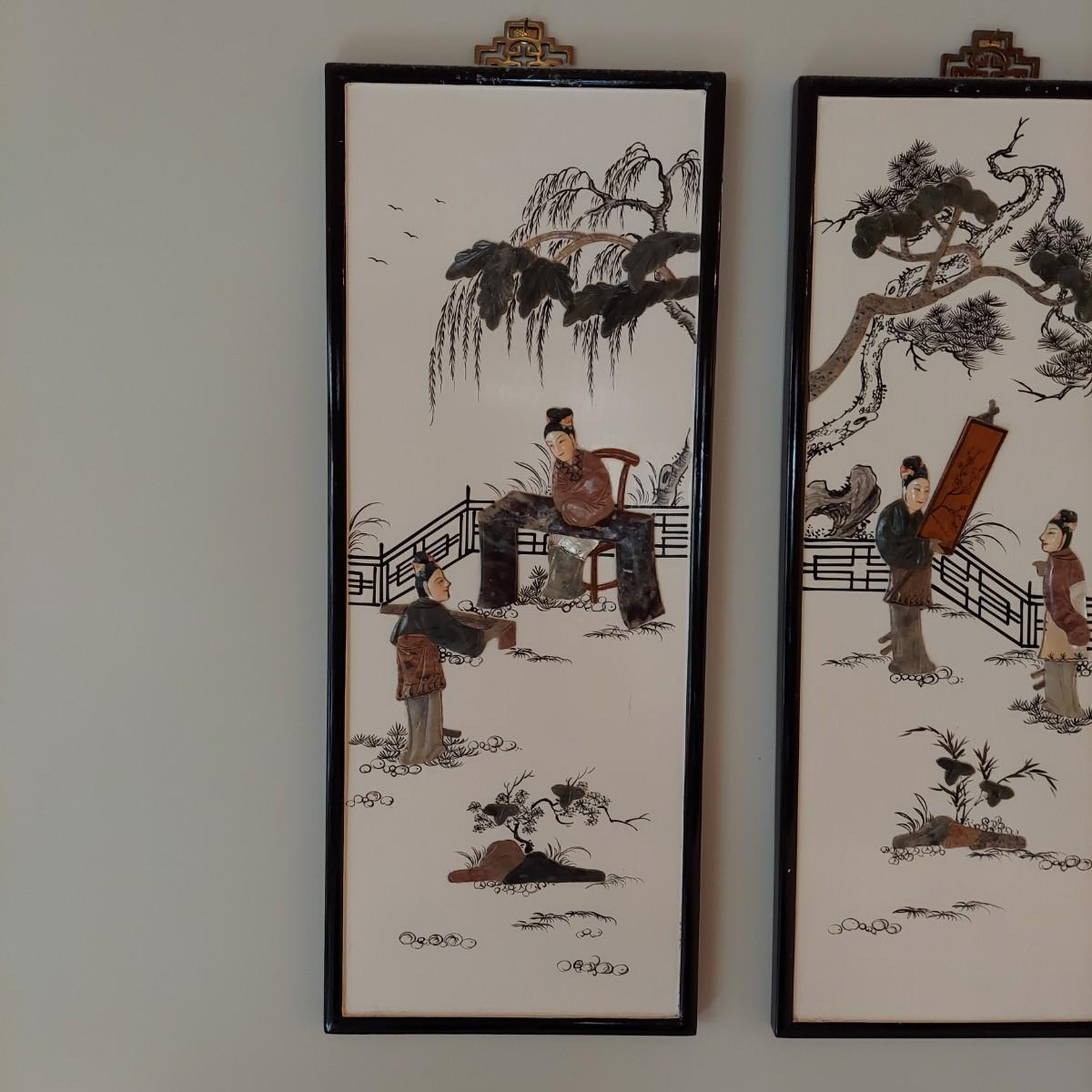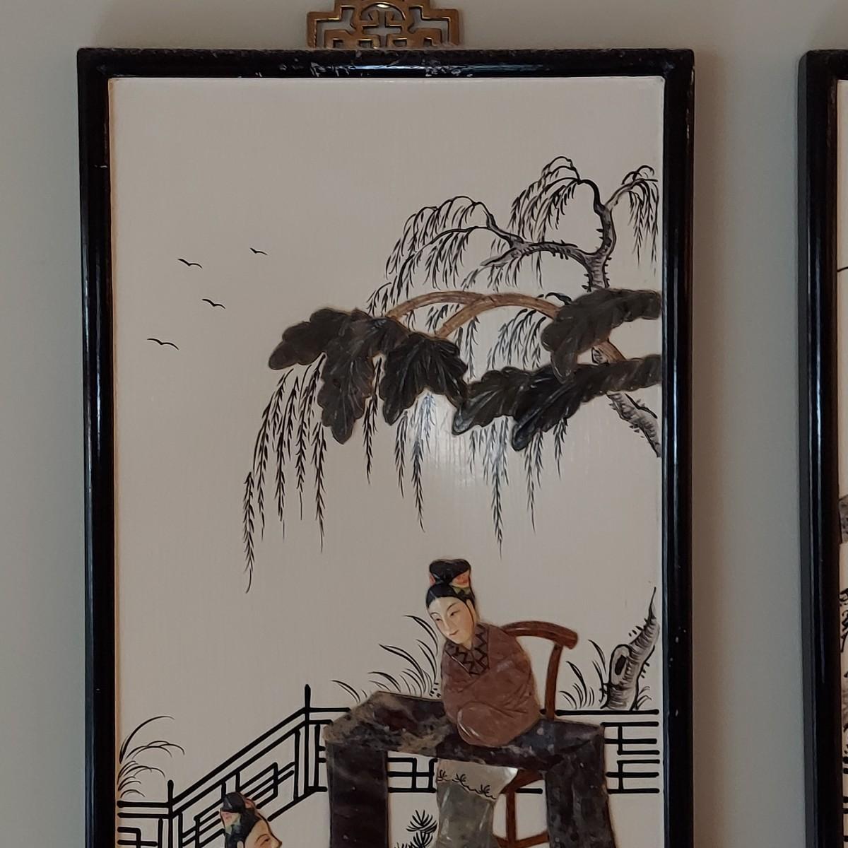 Four wooden panels with wooden frames and brass decorative top hangers. Each is painted and inlaid with what appear to be semi precious stones. Each panel measures 10" x 25"H. Shipping available. Shipping certain items can be costly. We suggest contacting our preferred local shipping provider, Postage Express, with dimensions and getting an estimate before bidding: (828) 670-5501 or postageexpress@yahoo.com.