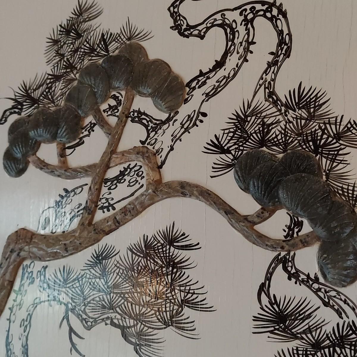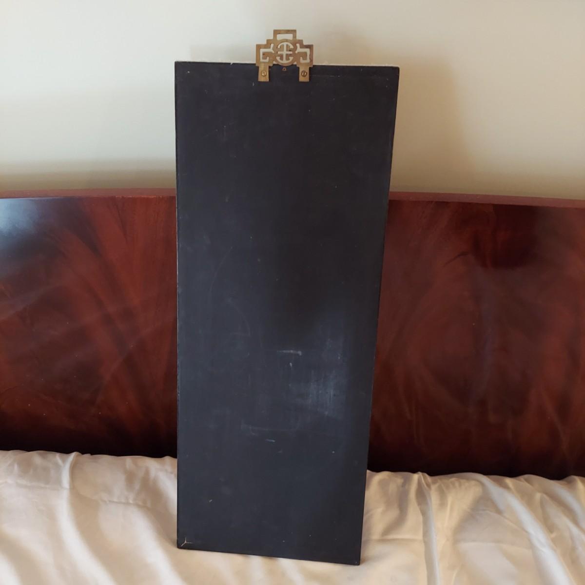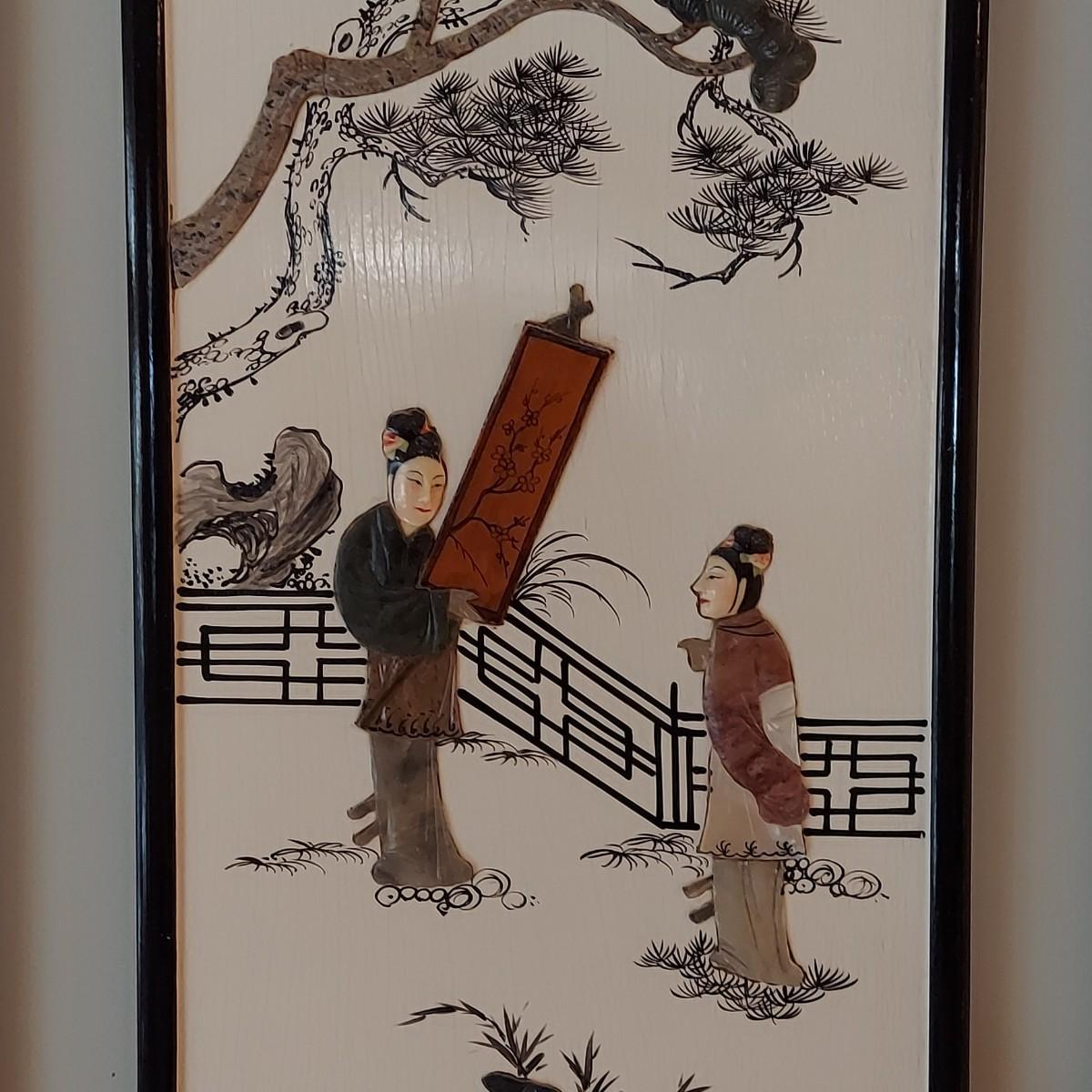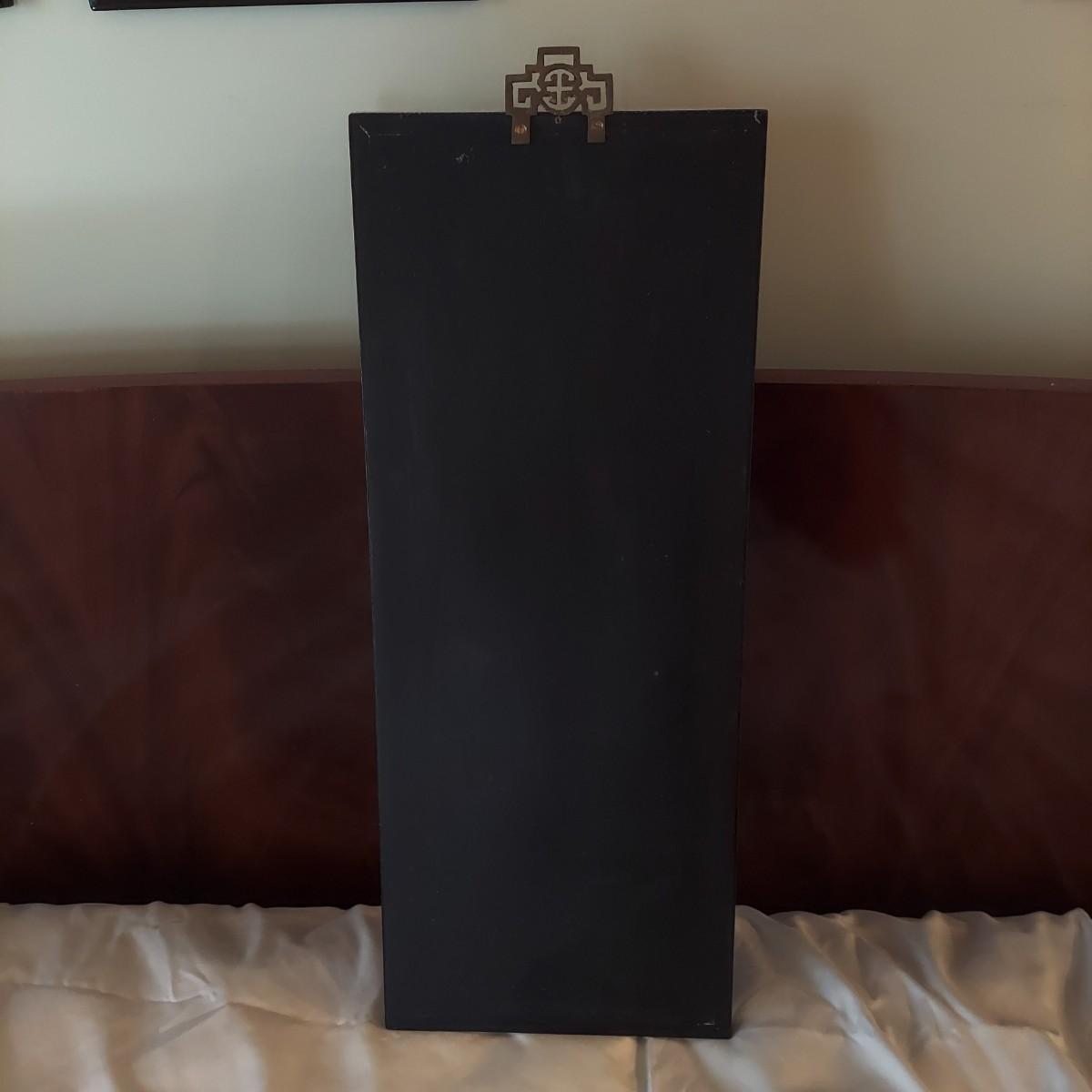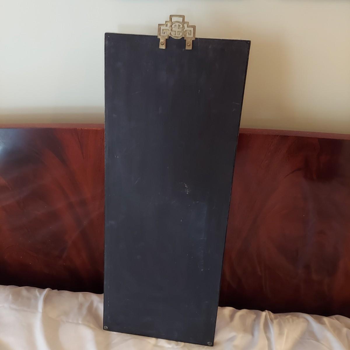 Four wooden panels with wooden frames and brass decorative top hangers. Each is painted and inlaid with what appear to be semi precious stones. Each panel measures 10" x 25"H. Shipping available. Shipping certain items can be costly. We suggest contacting our preferred local shipping provider, Postage Express, with dimensions and getting an estimate before bidding: (828) 670-5501 or postageexpress@yahoo.com.
