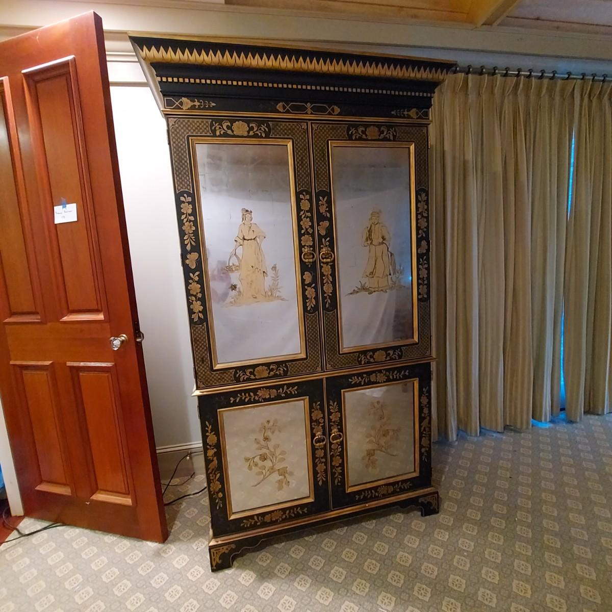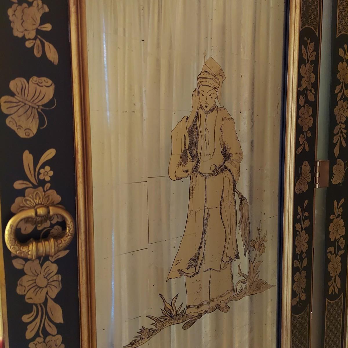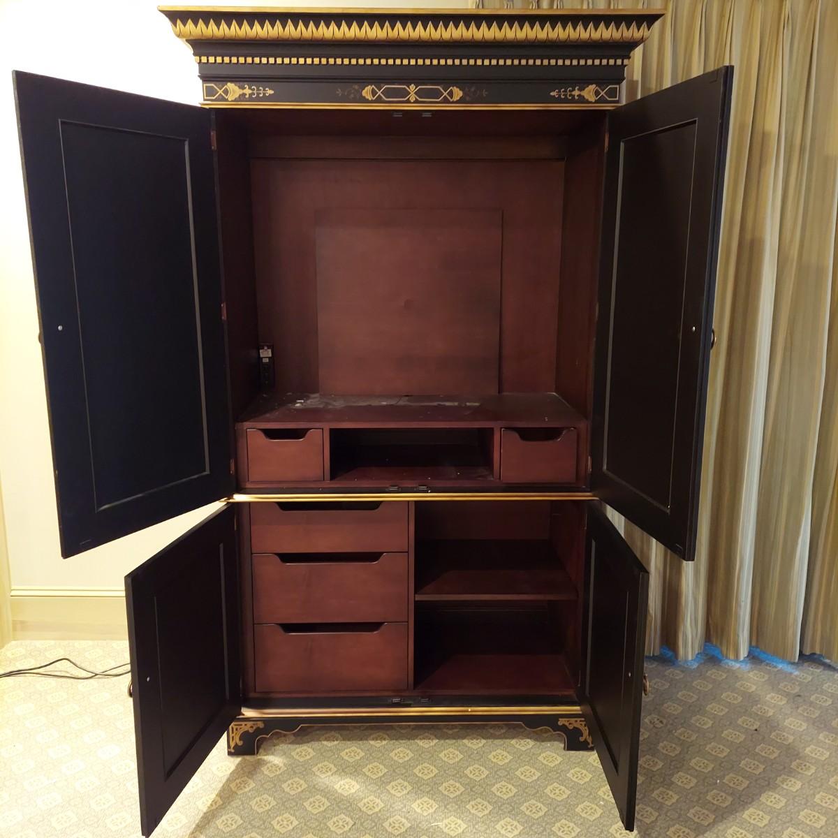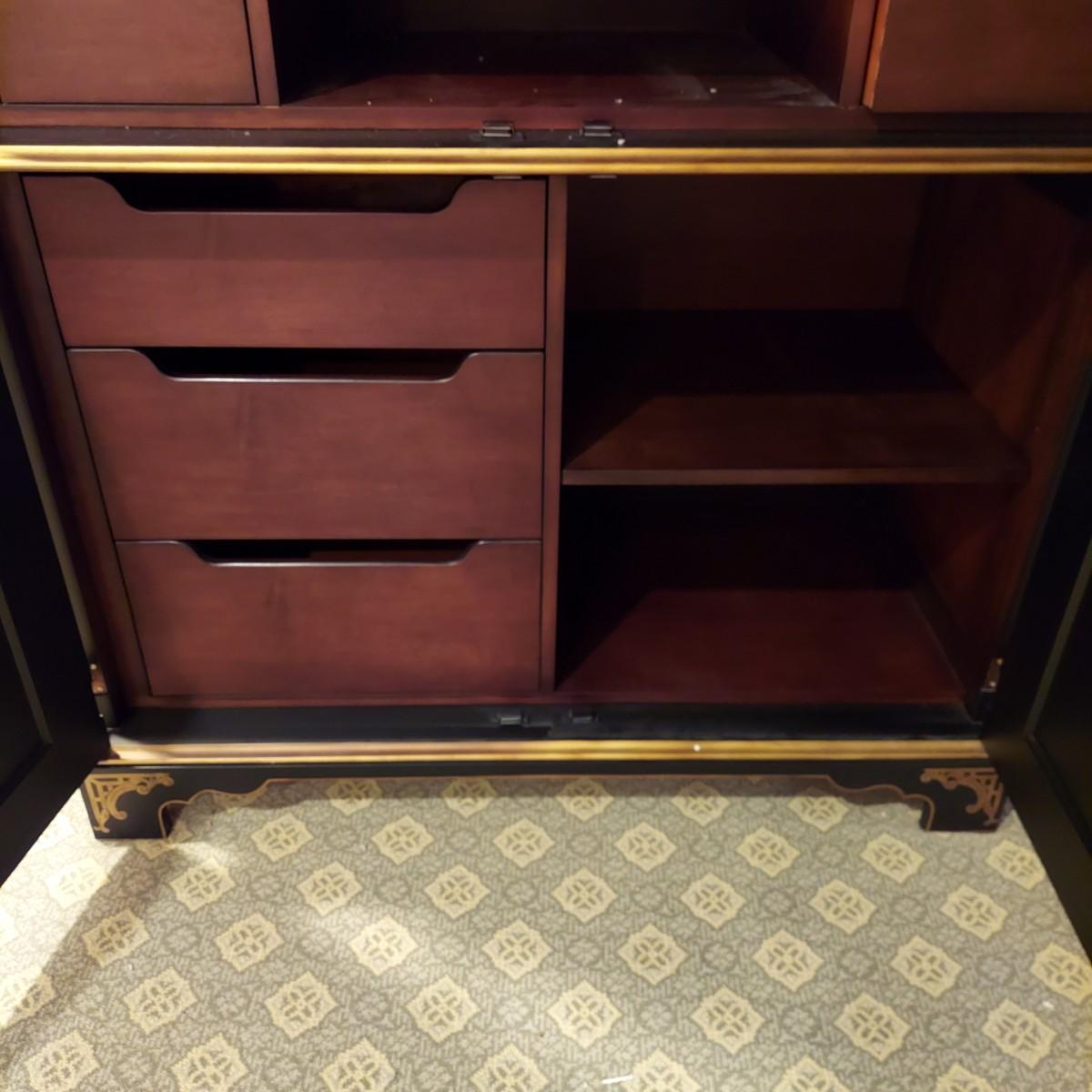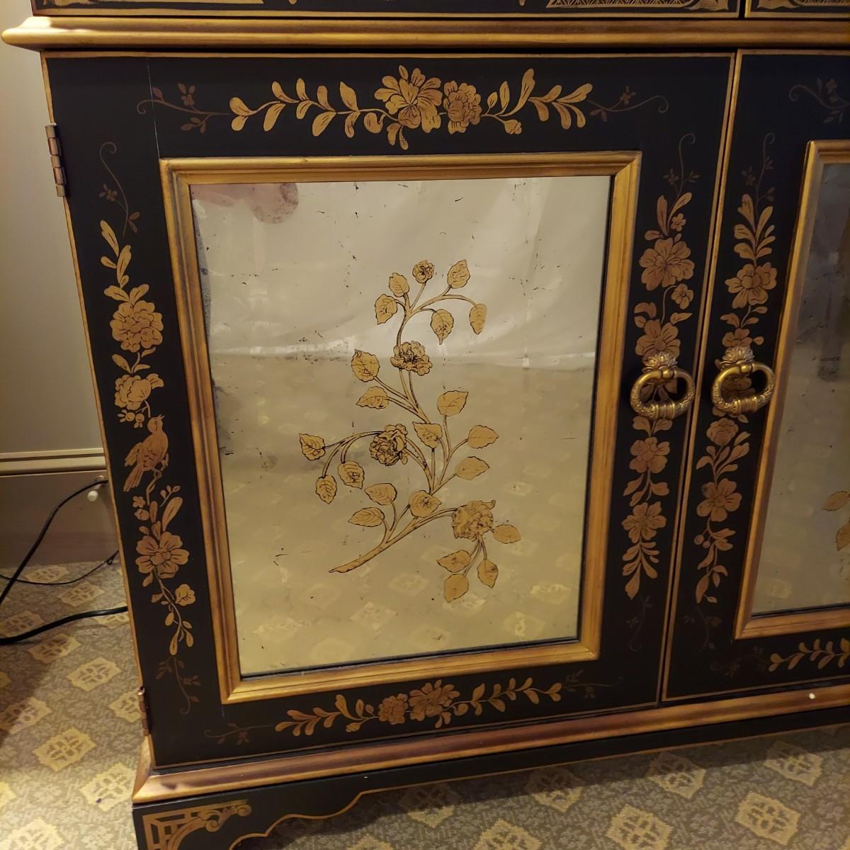 Solid wood entertainment cabinet with black and gold finish and mirrored doors. Has beautiful Eastern Asian style design elements. Hardware appears to be brass. Measures 50" x 25" x 84"H. There are extra pieces including a shelf, several metal shelf pegs and the insert to fill the TV cutout. Very heavy. Located on the first floor but there are several steps down from the front door. Local Pickup Only. Winning bidder must bring assistance to help move and load this item due to its weight and/or size.