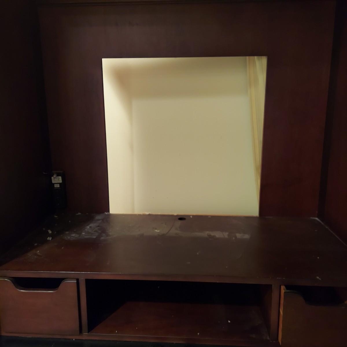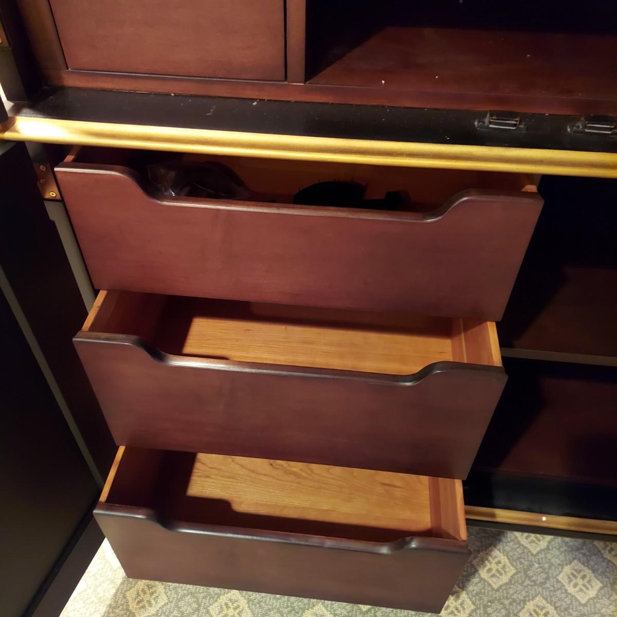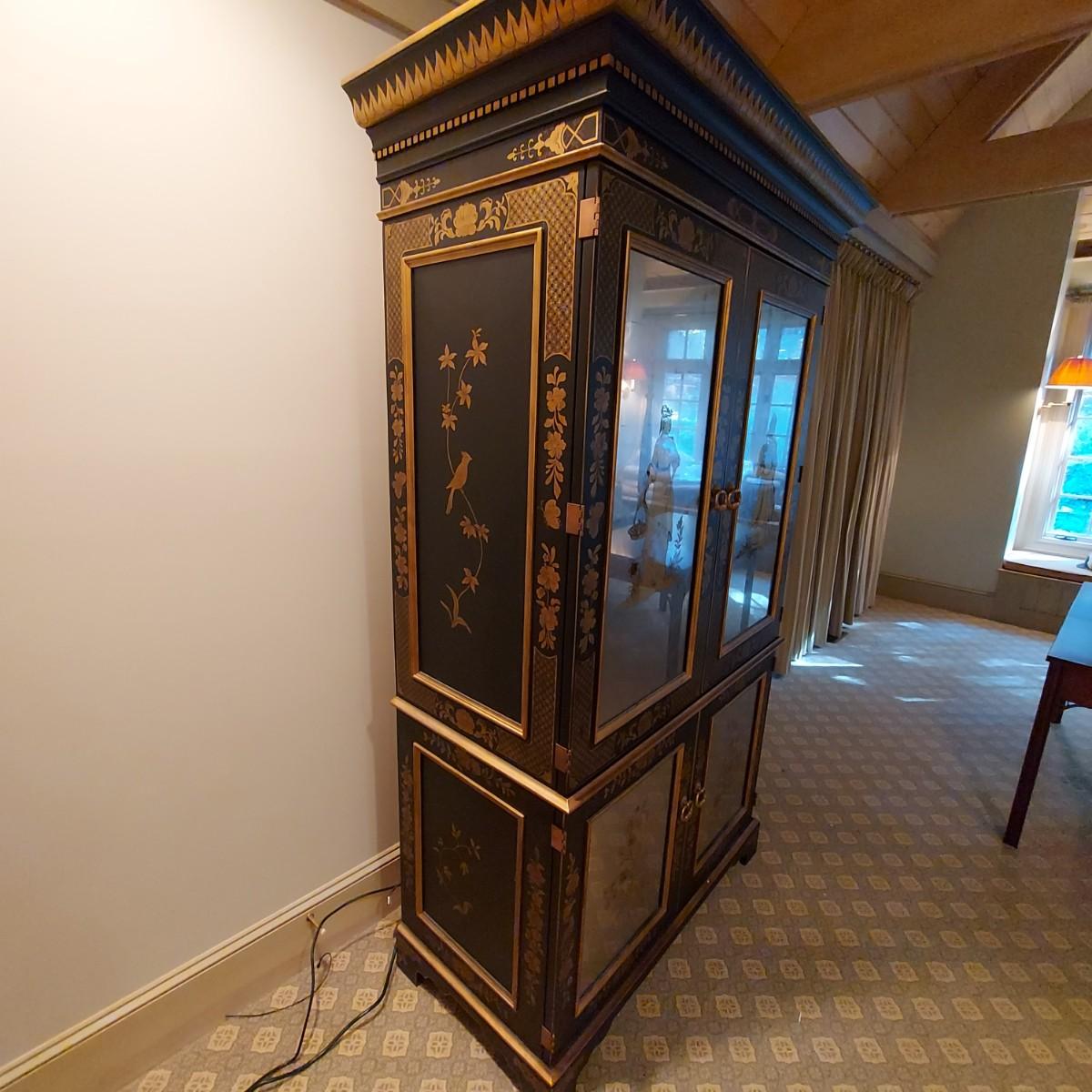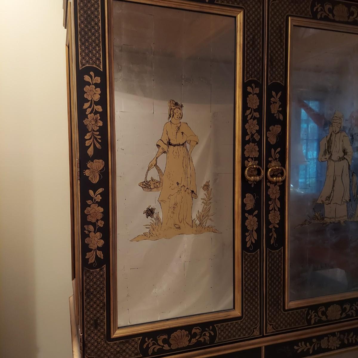 Solid wood entertainment cabinet with black and gold finish and mirrored doors. Has beautiful Eastern Asian style design elements. Hardware appears to be brass. Measures 50" x 25" x 84"H. There are extra pieces including a shelf, several metal shelf pegs and the insert to fill the TV cutout. Very heavy. Located on the first floor but there are several steps down from the front door. Local Pickup Only. Winning bidder must bring assistance to help move and load this item due to its weight and/or size.